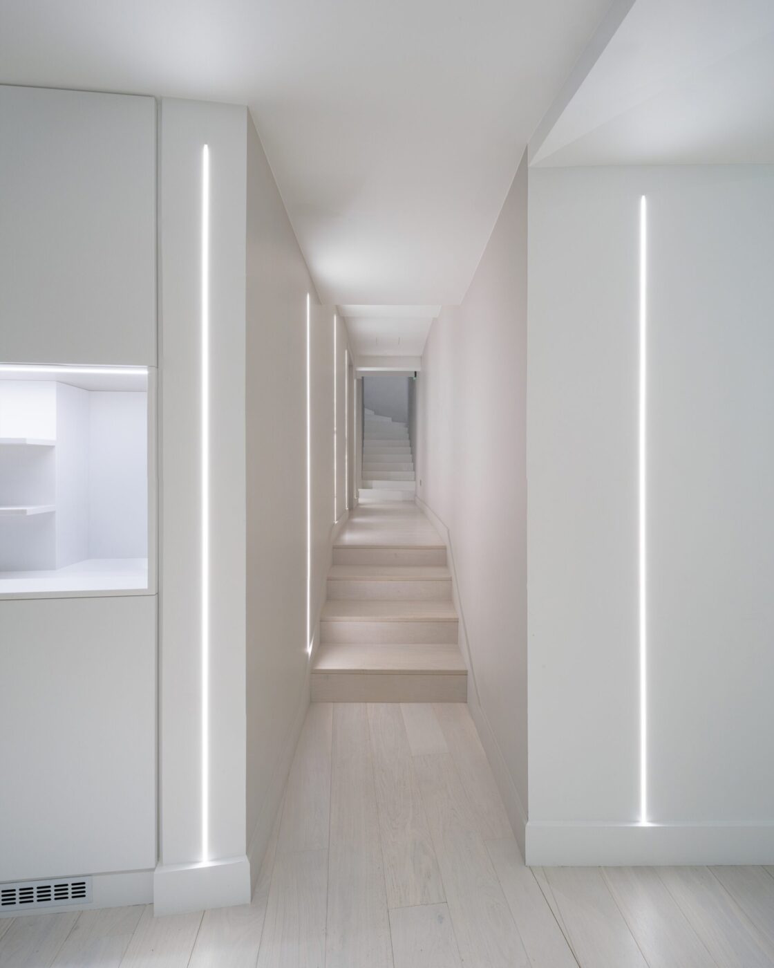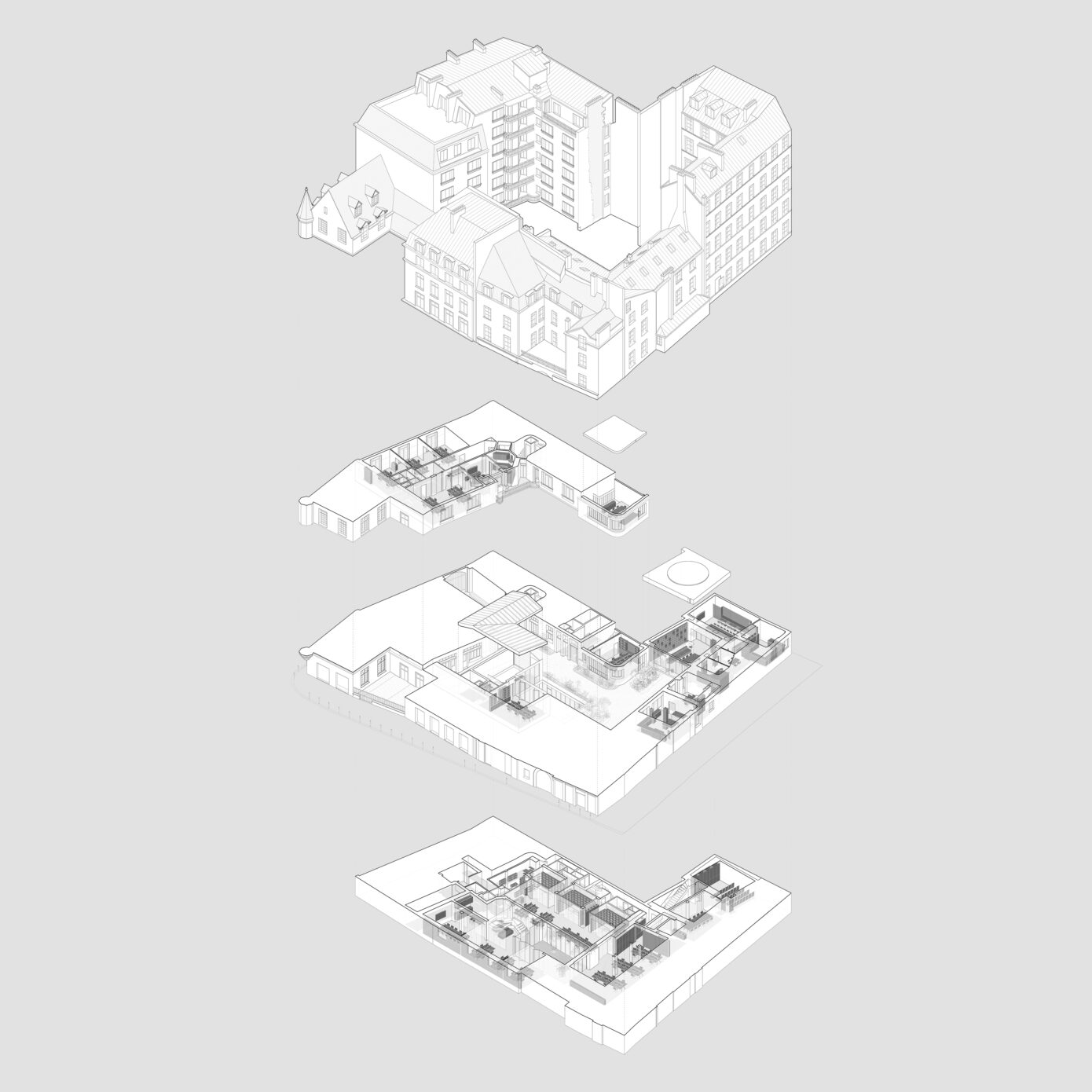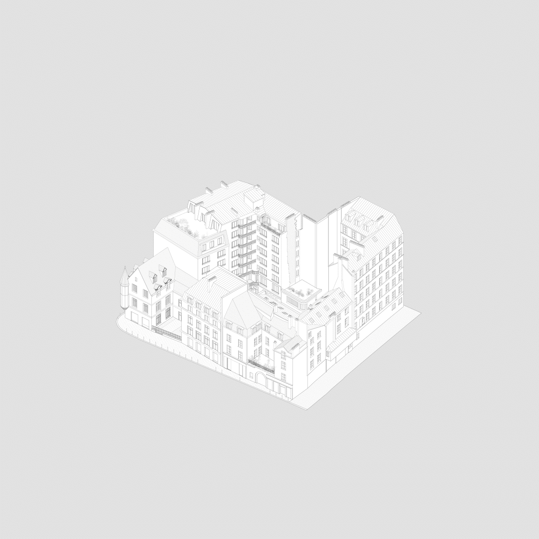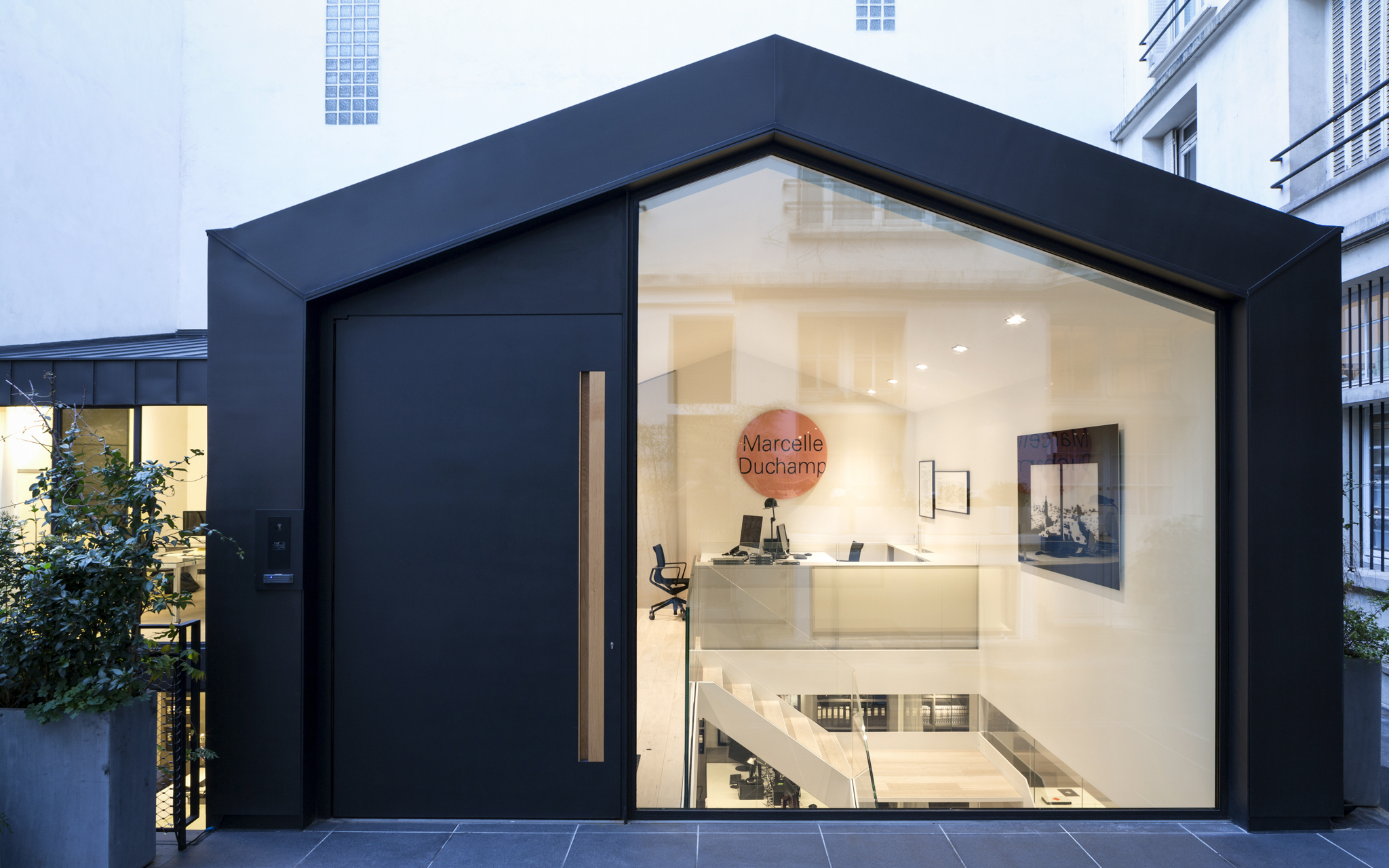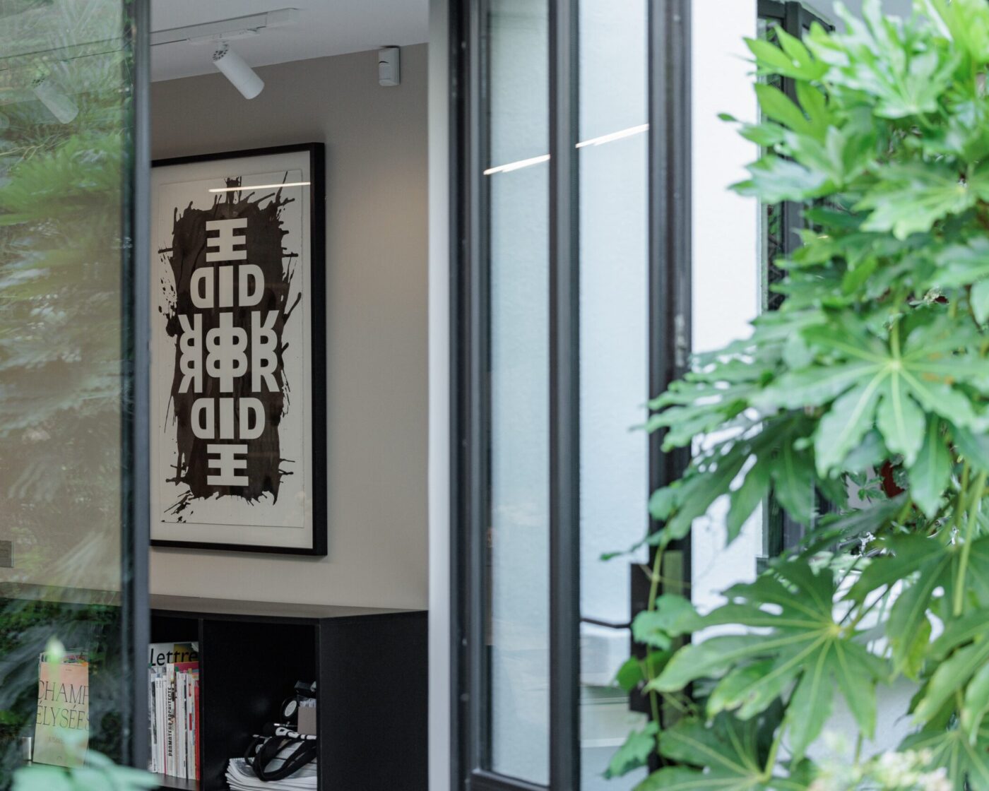 Le 56-58, rue Vieille-du-Temple prend place au cœur du Marais, dans le 3e arrondissement de Paris. Le quartier permet aux collaborateurs de profiter des musées, galeries, boutiques et restaurants proches. Sa position centrale favorise les transports en communs et modes de déplacements doux. En plein cœur du bouillonnement urbain mais secrètement nichée dans l’écrin d’une cour arborée, l’agence occupe l’emplacement d’une ancienne imprimerie dont PCA-STREAM a restructuré le pavillon et mené une démolition partielle des ateliers. Leurs sheds en béton, peu qualitatifs, ont été supprimés pour créer un patio au R-1. Les espaces de travail principaux s’implantent autour de ce vide qui fait office de puits de lumière. Le bâtiment neuf en L s’enroule au-dessus du patio. Son entrée présente un pignon vitré rappelant une maison stylisée. Le R+1 sur rue accueille les équipes chantiers, les garages en fond de cour l’atelier maquettes, surmonté au R+1 sur cour d’un appartement de réception polyvalent. Une seconde entrée sur cour mène au Stream Innovation Center. Au total, l’agence se déploie sur plus de 800 m2.