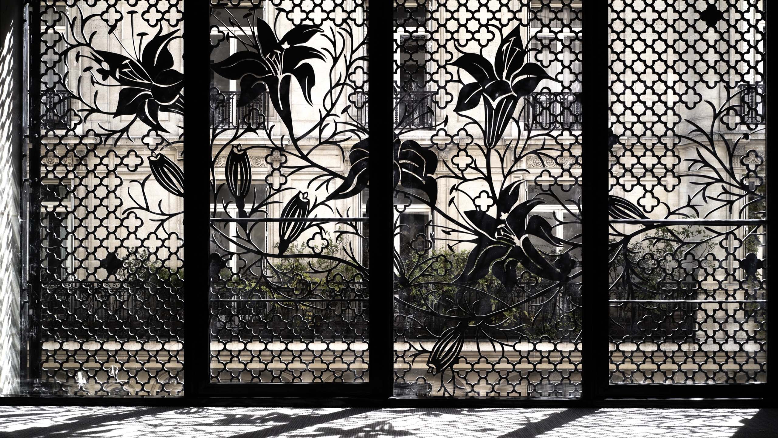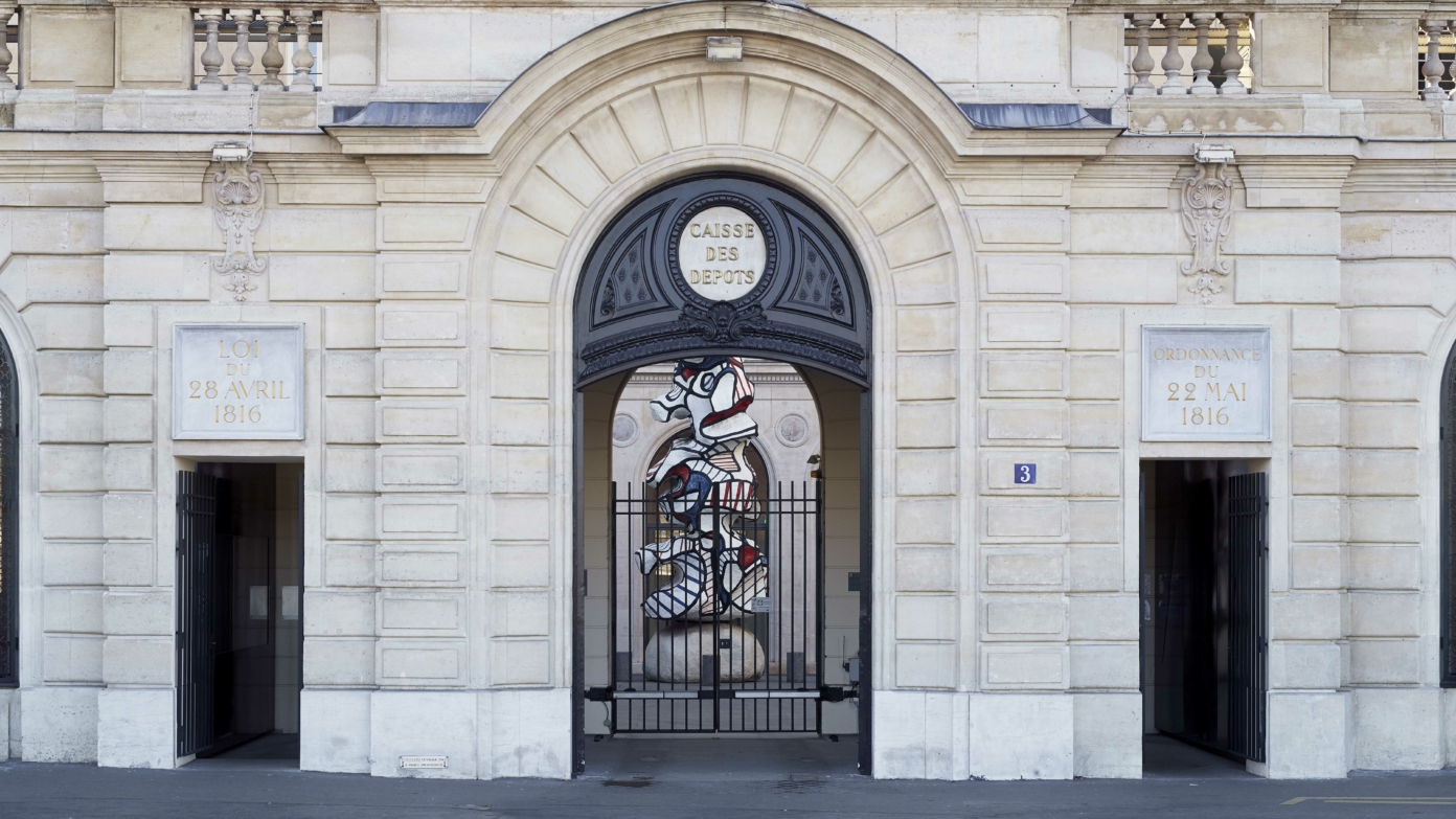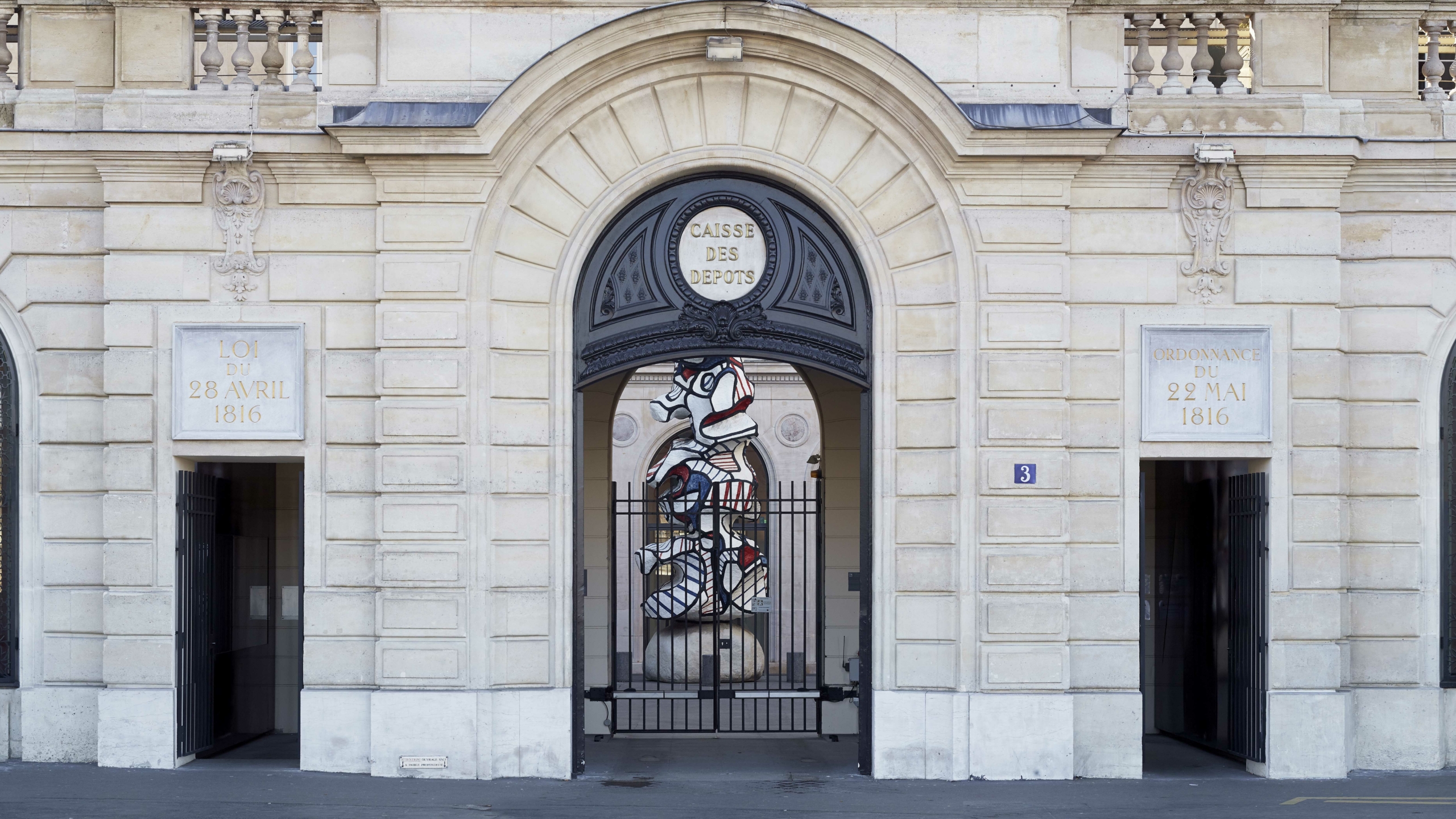 Au-delà de l’intervention architecturale, PCA-STREAM a cherché à mettre en valeur l’identité de l’institution par la conception de grilles contemporaines, apposées sur les baies du quai Anatole-France et de la rue de Lille. Ces grilles d’acier doré répondent au désir d’ouverture et de transparence de la Caisse des Dépôt, institution méconnue du grand public, en incarnant ses valeurs : pérennité, long terme, confiance. Leur motif naît de la conception d’un nouvel idéogramme pour l’institution, à partir d’une variation sur ses d’initiales (C-D-C) et d’une réinterprétation des motifs floraux de son blason historique. L’équilibre instauré par la Caisse des Dépôts entre la préservation de l’intérêt collectif et le développement de l’intérêt privé est suggéré par l’alliance entre l’épanouissement organique des fleurs de lys et la rigueur des feuilles de trèfle. Le motif est décliné à l’intérieur du bâtiment via des sérigraphies sur verre. Cette création a fait l’objet d’un long travail de réflexion et de conception avec les représentants de l’institution, une designer (Annonciade Perron), une spécialiste en stratégie discursive (Pauline Merlet), des artisans spécialisés et les architectes des Bâtiments de France, aboutissant à un projet aujourd’hui salué comme emblématique de l’institution.