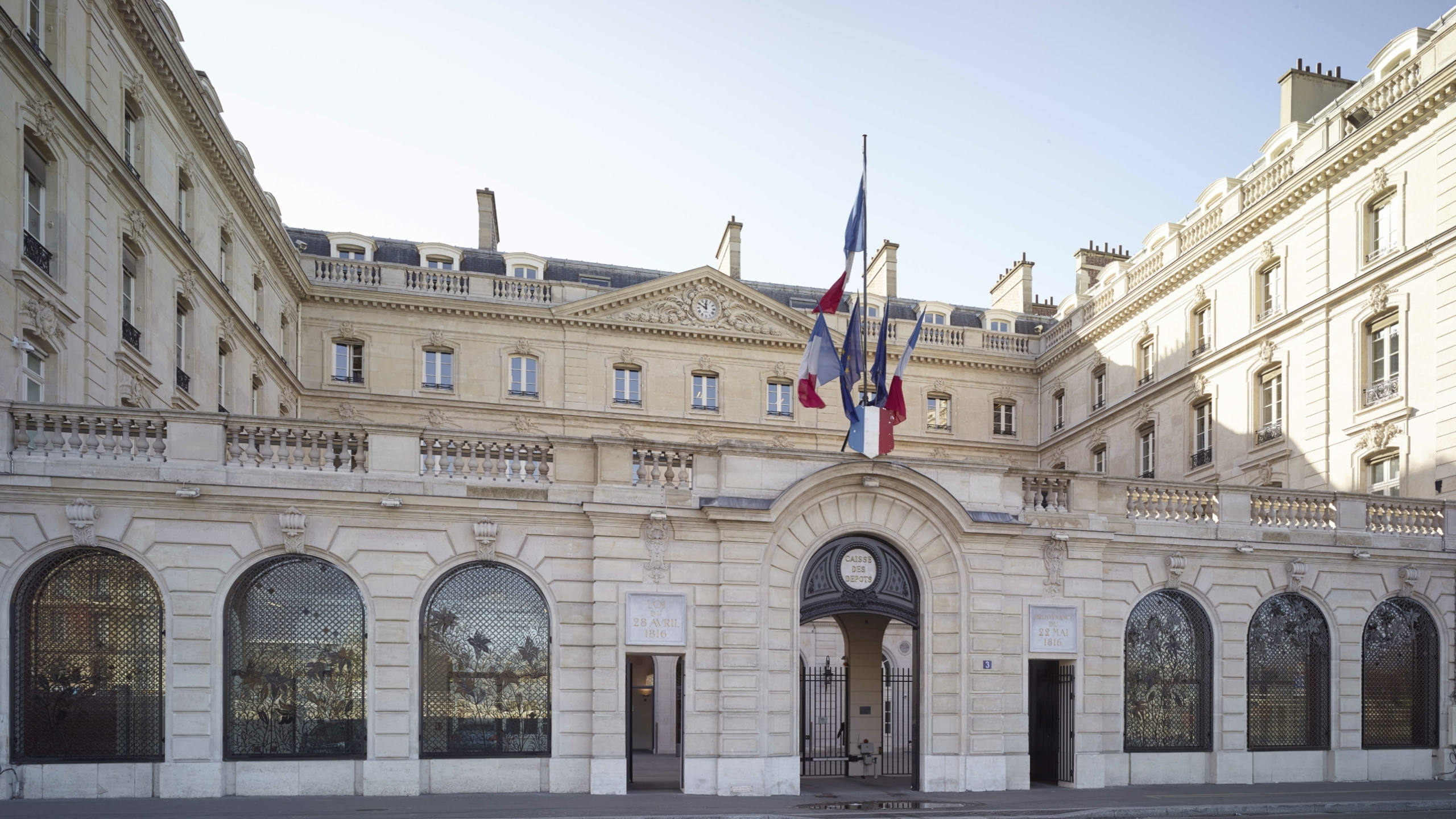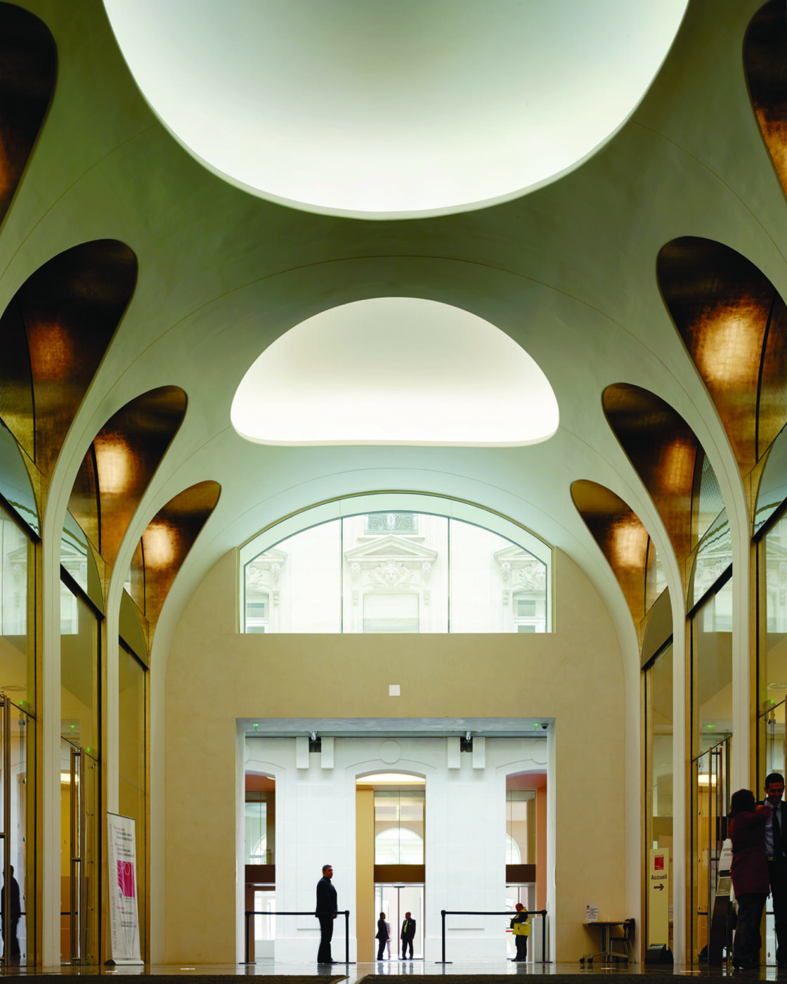 L’agence a imaginé un plan en croix simple et lisible, marqué par un grand passage traversant qui dessert des guichets, la banque et les salons d’accueil. Les façades sur la rue de Lille et le quai Anatole-France sont rénovée, la cour d’honneur restaurée, tandis que les accès du sont simplifiés par deux entrées distinctes déjouant la symétrie attendue sur la Seine. L’accès par le quai est restitué aux piétons et s’ouvre largement sur l’extérieur via la galerie Anatole-France, espace d’exposition et de réception. La traversée publique de l’îlot est maintenue et son parcours clarifié par un large passage voûté qui réinterprète la forme caractéristique du passage parisien. Son arc plein cintré et relevé d’or devient emblématique de l’intervention. Trois grandes baies ovoïdes percent la voûte de cette traversée, apportant un éclairage artificiel rappelant celui d’une verrière.