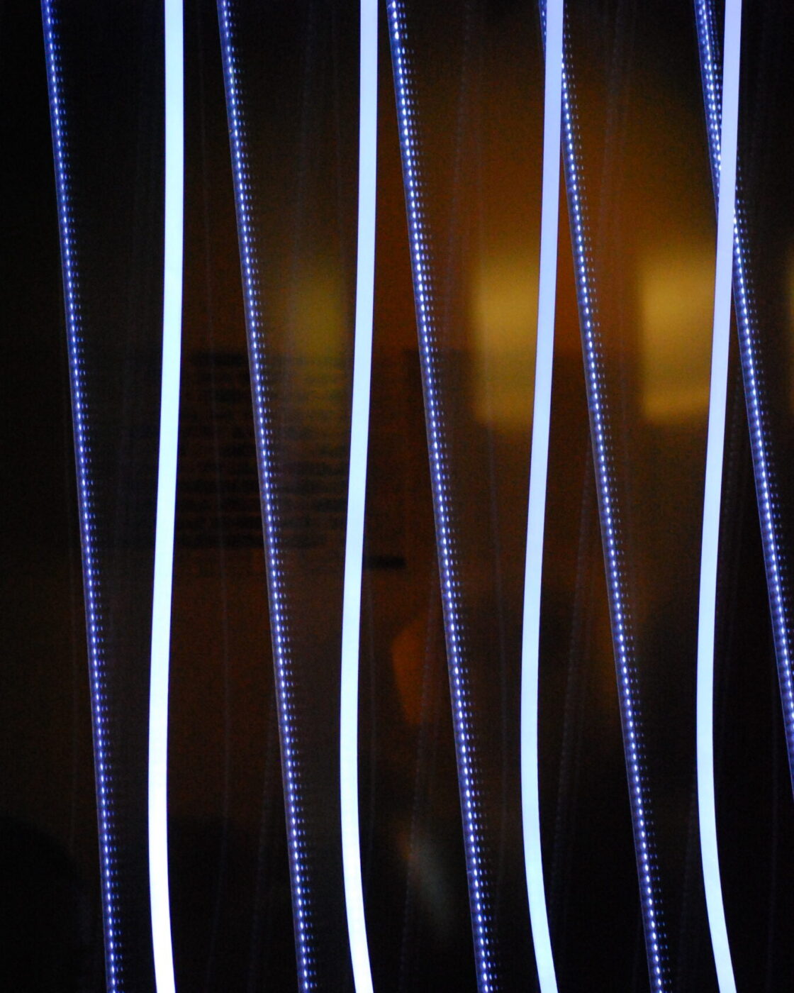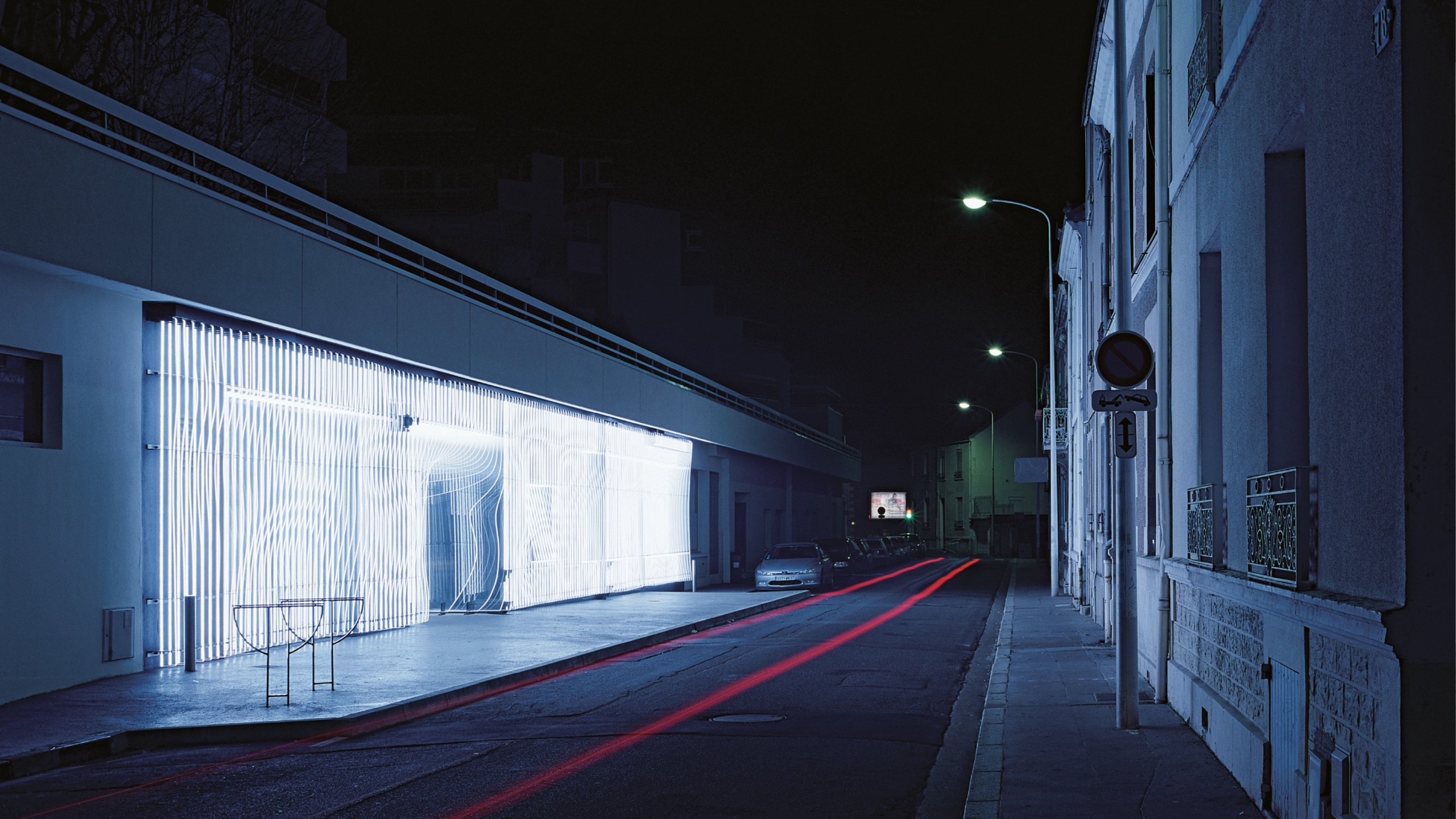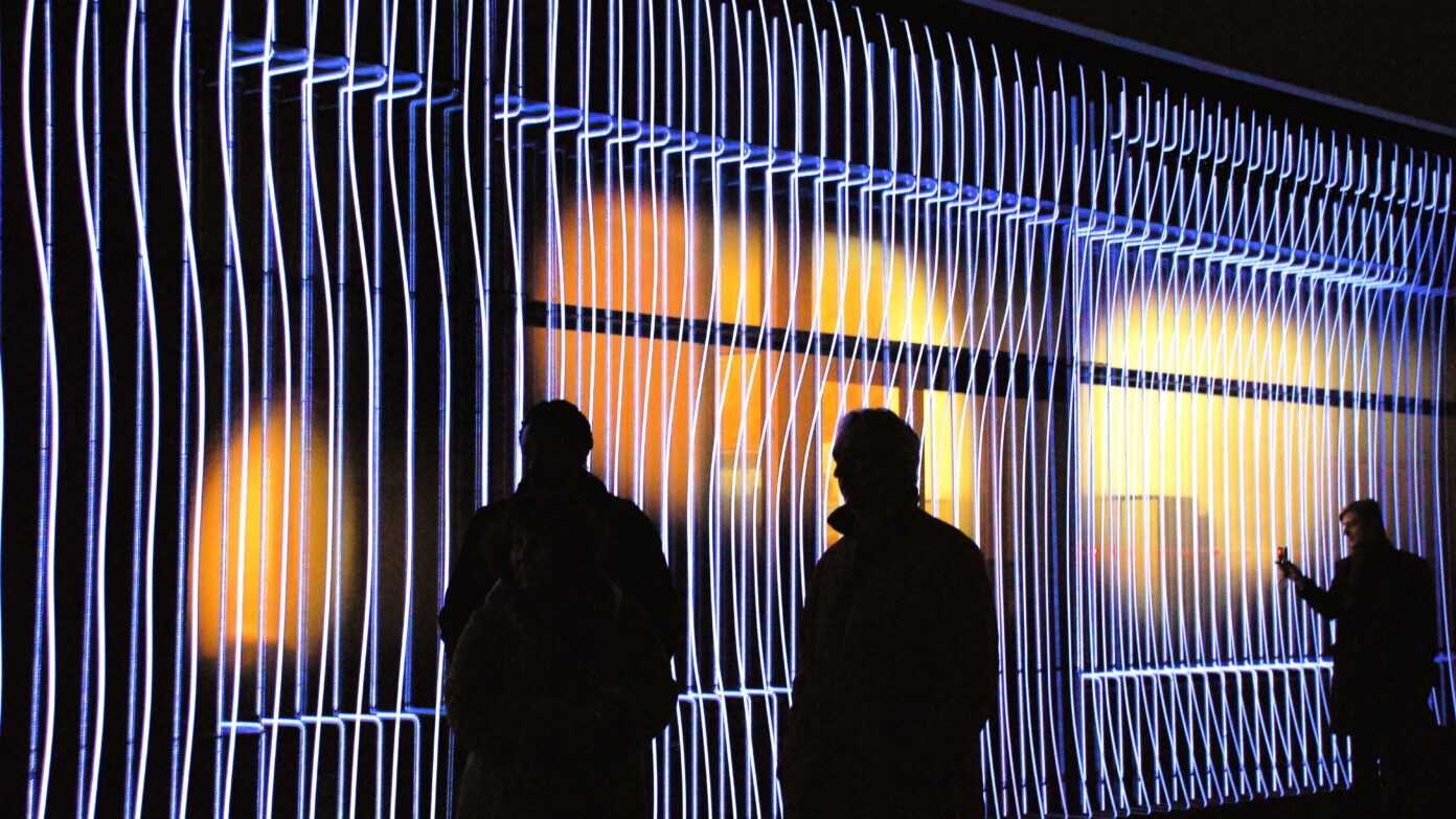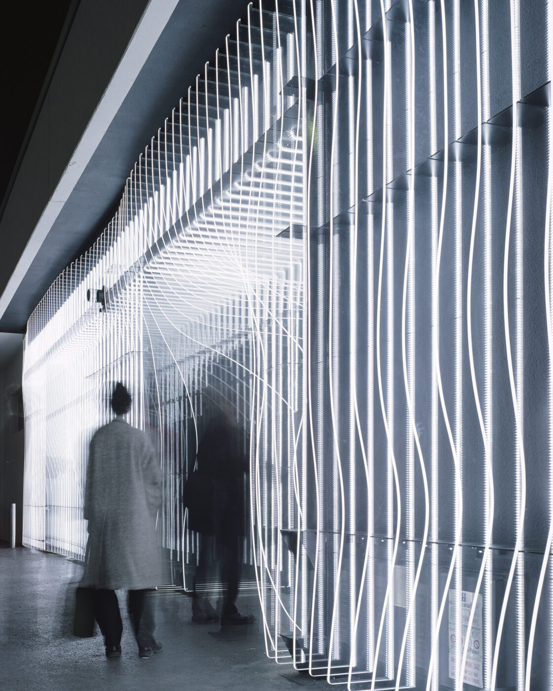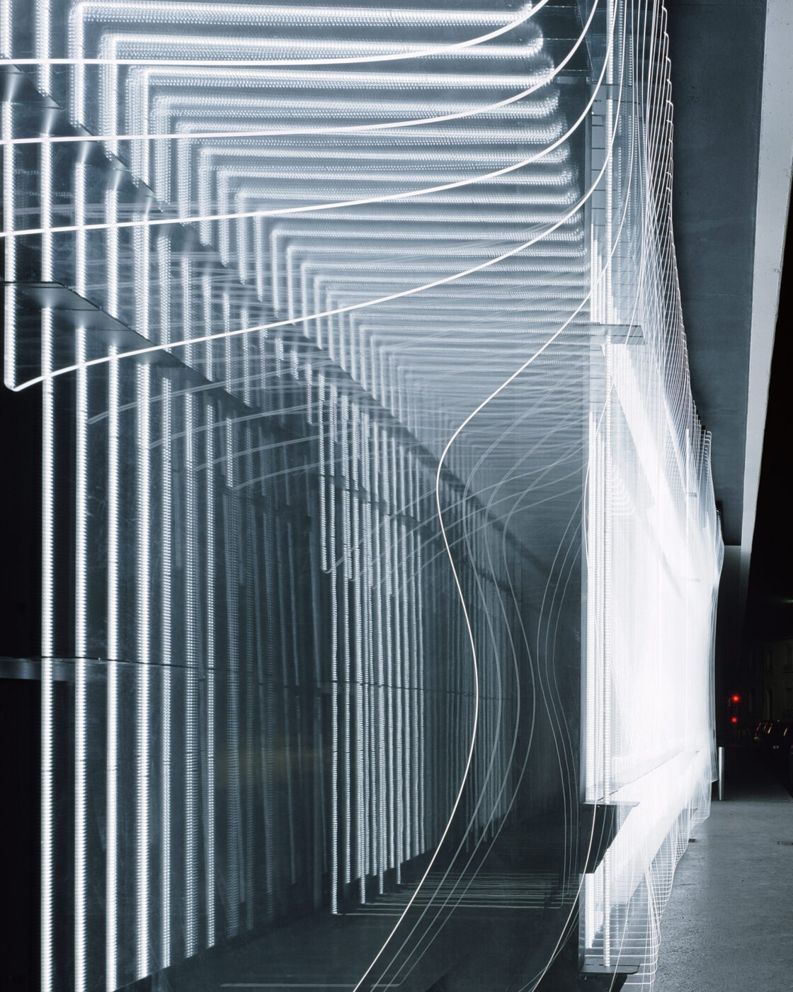 Cette membrane lumineuse vise à estomper les frontières entre l’objet et son environnement. Elle est tout à la fois voile structurel et ornemental, organique et numérique, virtuelle et physique, concrète et mentale. Sa perception ne se cristallise pas en une forme définitive, mais se modifie selon le point de vue du spectateur et les conditions environnementales. Le faisceau de lignes lumineuses compose une surface ondulante, un paysage imaginaire discontinu et mobile, créant des phénomènes inattendus. La façade est productrice d’atmosphères, ses striures de lumière formant un espace travaillant les vides et les pleins. Œuvre conceptuelle, cette seconde peau au statut hybride, à mi-chemin entre sculpture et architecture, évoque les pratiques de l’op’art ou les recherches de l’art relationnel dans sa dimension interactive.