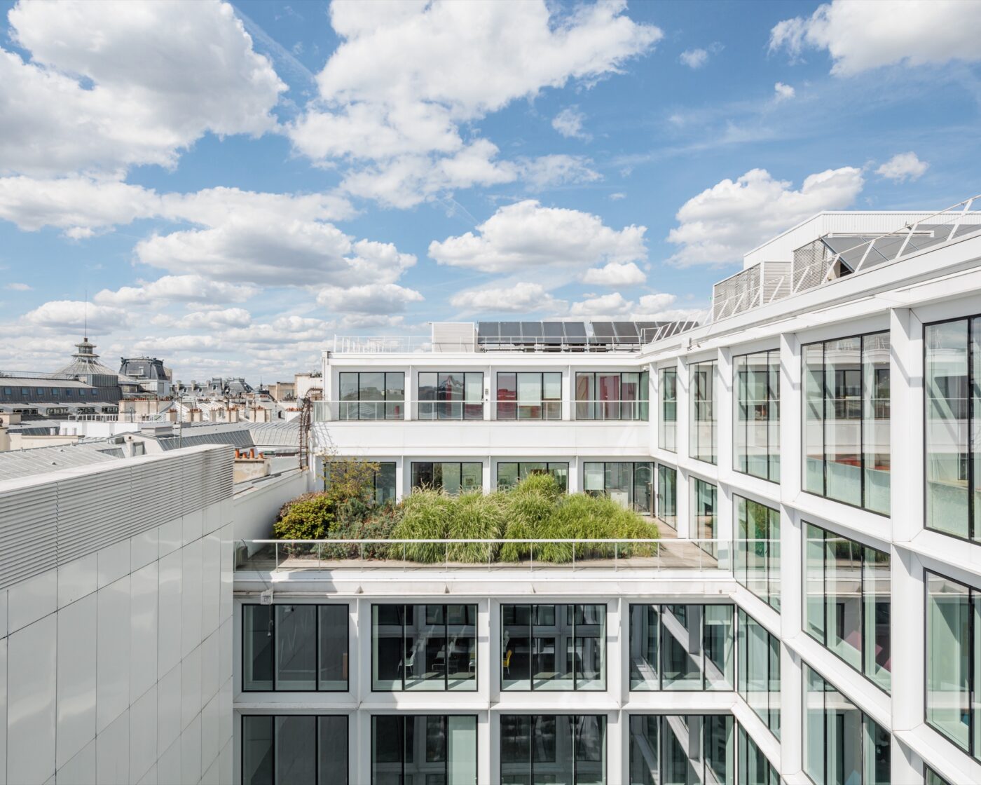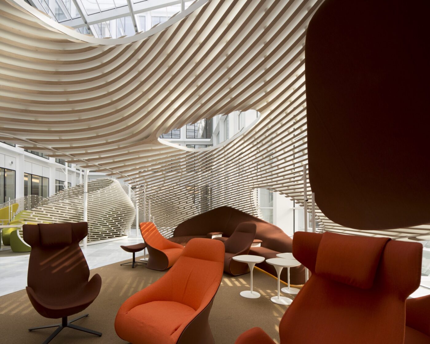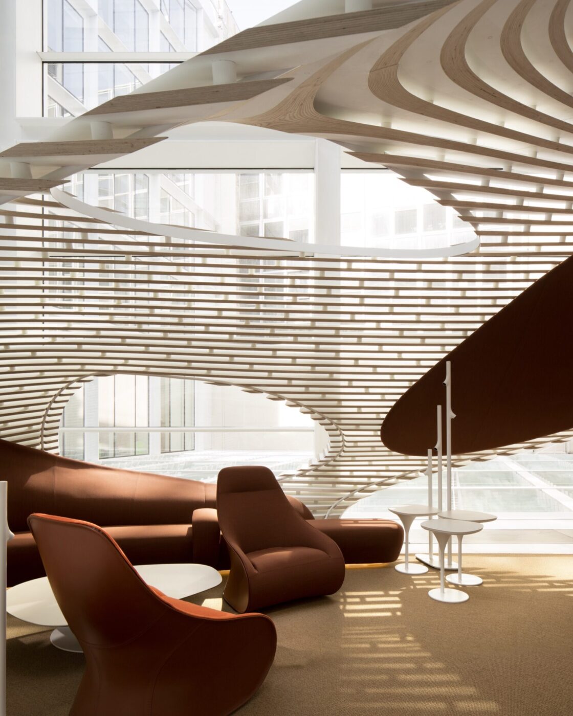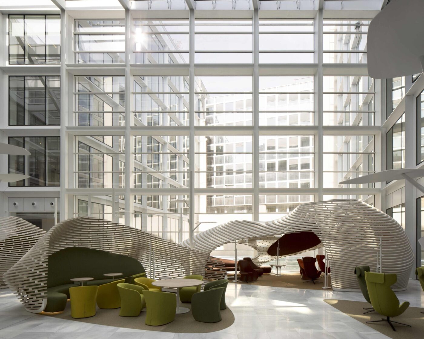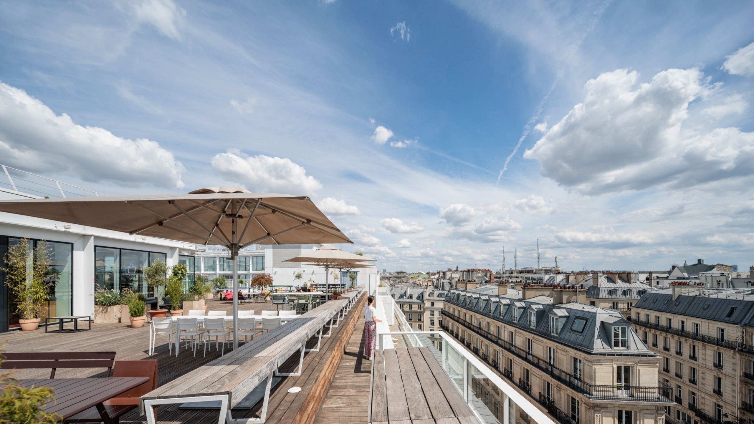 L’émergence de modèles organisationnels orientés vers la qualité de la relation et l’expérience collaborative implique de repenser l’architecture des espaces de travail. Avec #cloud.paris, l’immeuble de bureau devient espace de communauté et outil de management. Il permet d’attirer les talents et favorise la sérendipité par l’importance de ses espaces partagés et ses services exceptionnels, proches des codes de l’hôtellerie. Autour des cours intérieures se déploient trois restaurants à l’offre culinaire variée, adaptée aux différents moments et rythmes de la journée, ainsi qu’une salle de fitness, une conciergerie et un business center. Le e-lounge, avec ses coques de bois formant des espaces de convivialité, se mue en place du village. Les terrasses sont libérées de leur rôle technique et les usagers peuvent y travailler ou se détendre en profitant des vues panoramiques. Au cœur de la vie urbaine, de ses services, restaurants et lieux de loisirs, #cloud.paris est représentatif d’un retour aux centres-villes, à rebours des centres d’affaires monofonctionnels et des campus de périphérie.