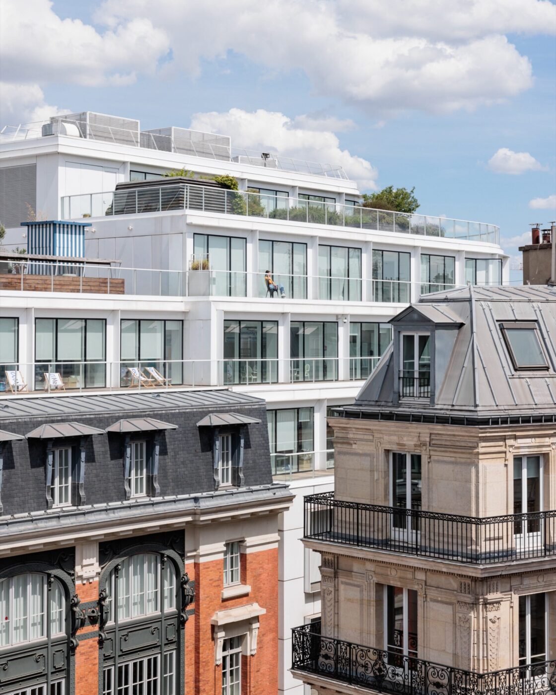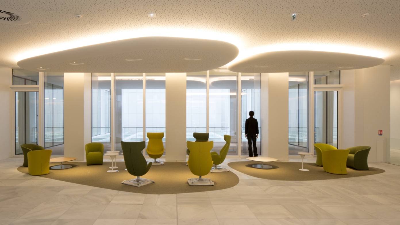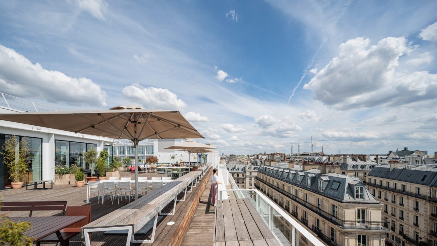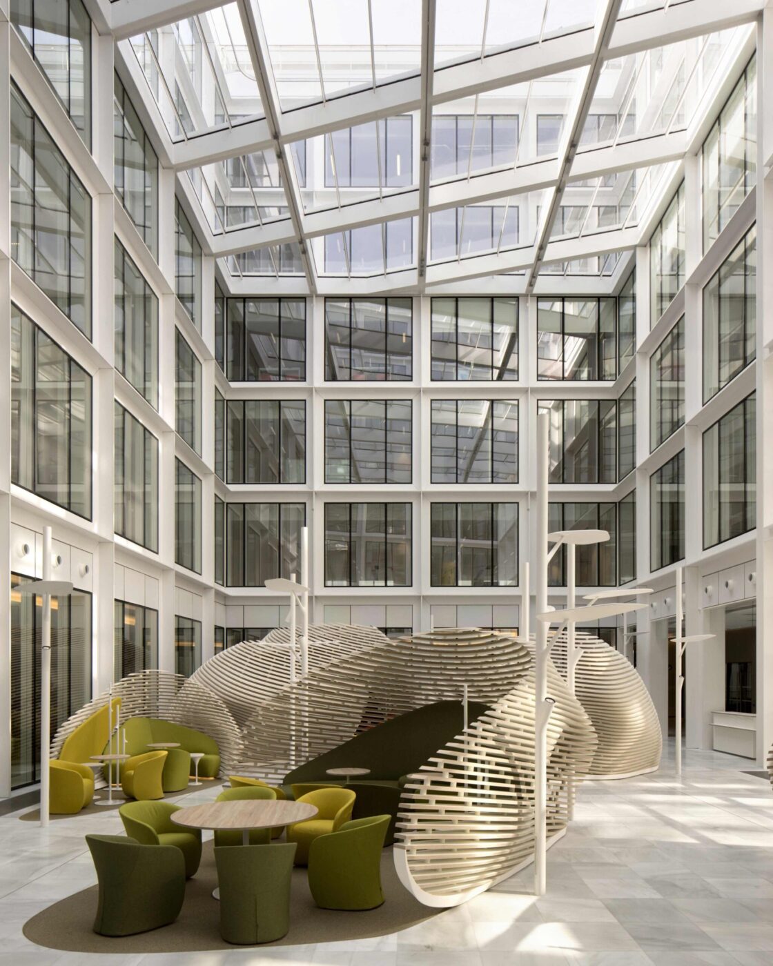 L’émergence de modèles organisationnels orientés vers la qualité de la relation et l’expérience collaborative implique de repenser l’architecture des espaces de travail. Avec #cloud.paris, l’immeuble de bureau devient espace de communauté et outil de management. Il permet d’attirer les talents et favorise la sérendipité par l’importance de ses espaces partagés et ses services exceptionnels, proches des codes de l’hôtellerie. Autour des cours intérieures se déploient trois restaurants à l’offre culinaire variée, adaptée aux différents moments et rythmes de la journée, ainsi qu’une salle de fitness, une conciergerie et un business center. Le e-lounge, avec ses coques de bois formant des espaces de convivialité, se mue en place du village. Les terrasses sont libérées de leur rôle technique et les usagers peuvent y travailler ou se détendre en profitant des vues panoramiques. Au cœur de la vie urbaine, de ses services, restaurants et lieux de loisirs, #cloud.paris est représentatif d’un retour aux centres-villes, à rebours des centres d’affaires monofonctionnels et des campus de périphérie.