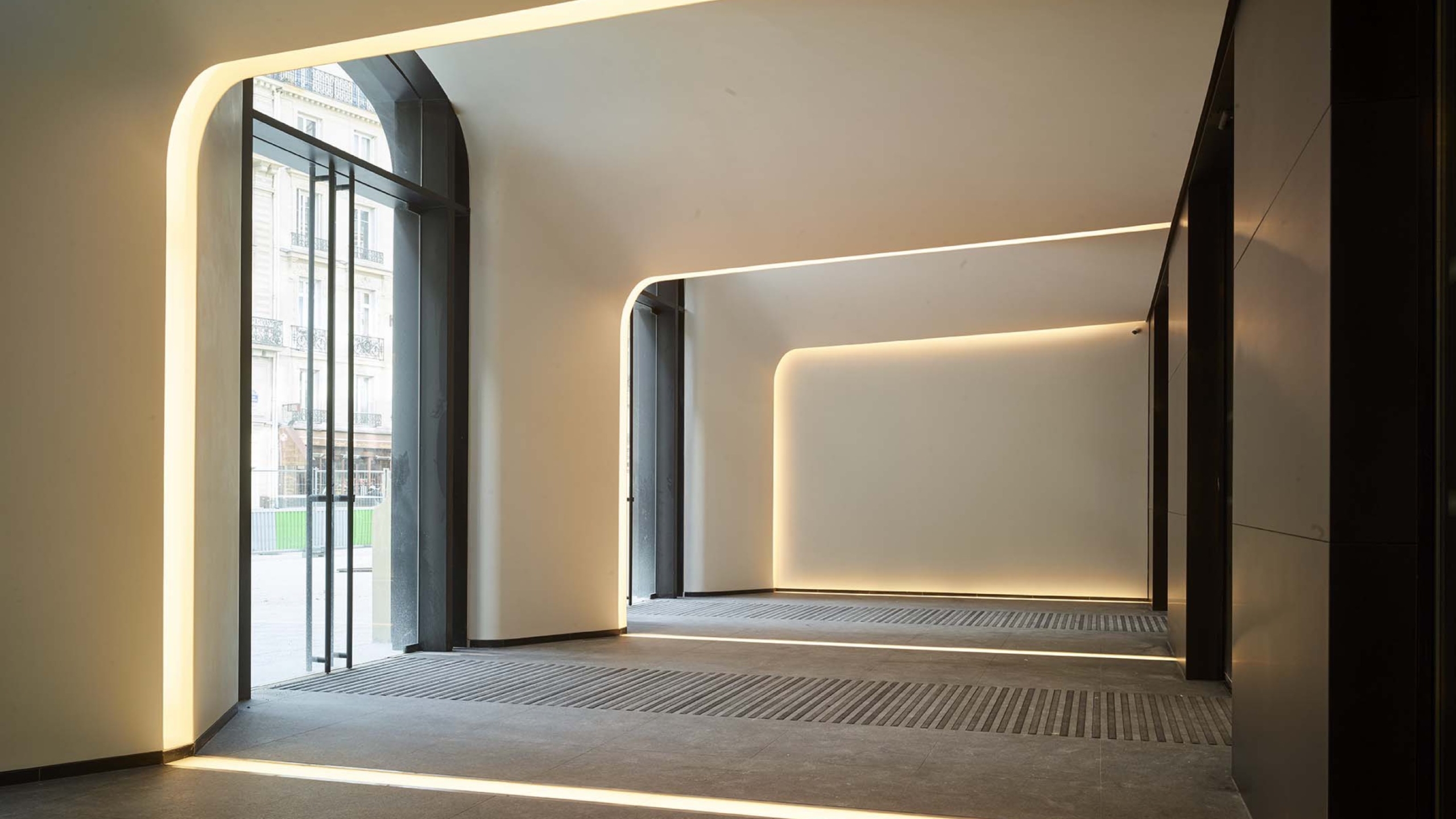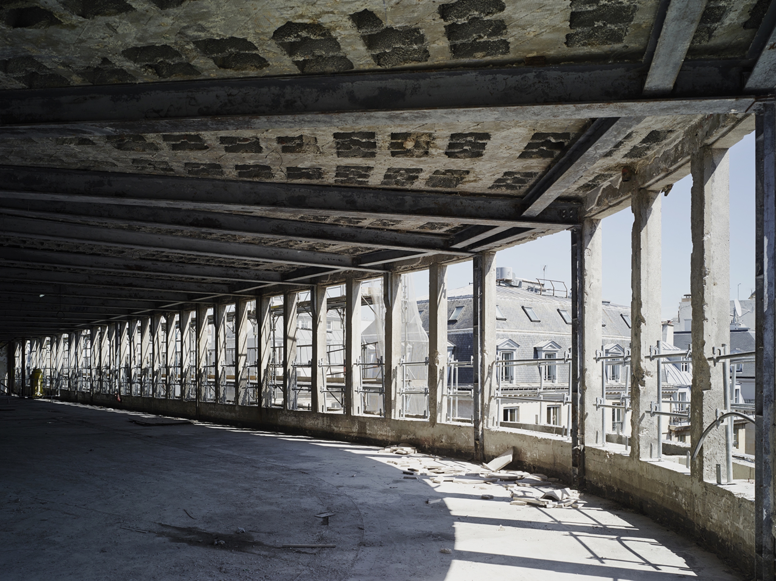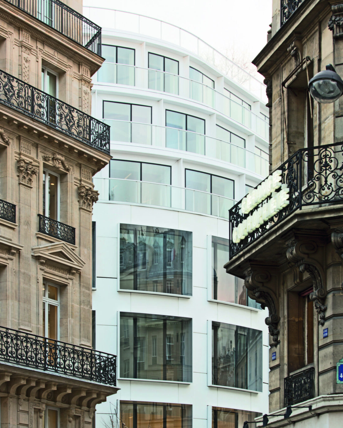 #cloud.paris représentait un défi architectural par sa taille, son hétérogénéité et son contexte de centre-ville historique. Le Crédit Lyonnais avait acquis, au fil du XXe siècle, quatre bâtiments d’époques différentes, d’une surface totale de plus de 38 000 m2. L’ensemble étant obsolète fonctionnellement et techniquement, une chirurgie lourde était indispensable pour moderniser et clarifier ce labyrinthe aux importantes surfaces aveugles. Le bâtiment a été redécoupé pour apporter un maximum de lumière à l’ensemble des postes de travail. Les façades blanches et vitrées forment des dispositifs optiques qui reflètent la lumière en infrastructure, en complément de vastes cours. L’uniformisation des niveaux et la rationalisation des circulations entre les corps de bâtiments permet d’offrir de vastes plateaux ouverts.
