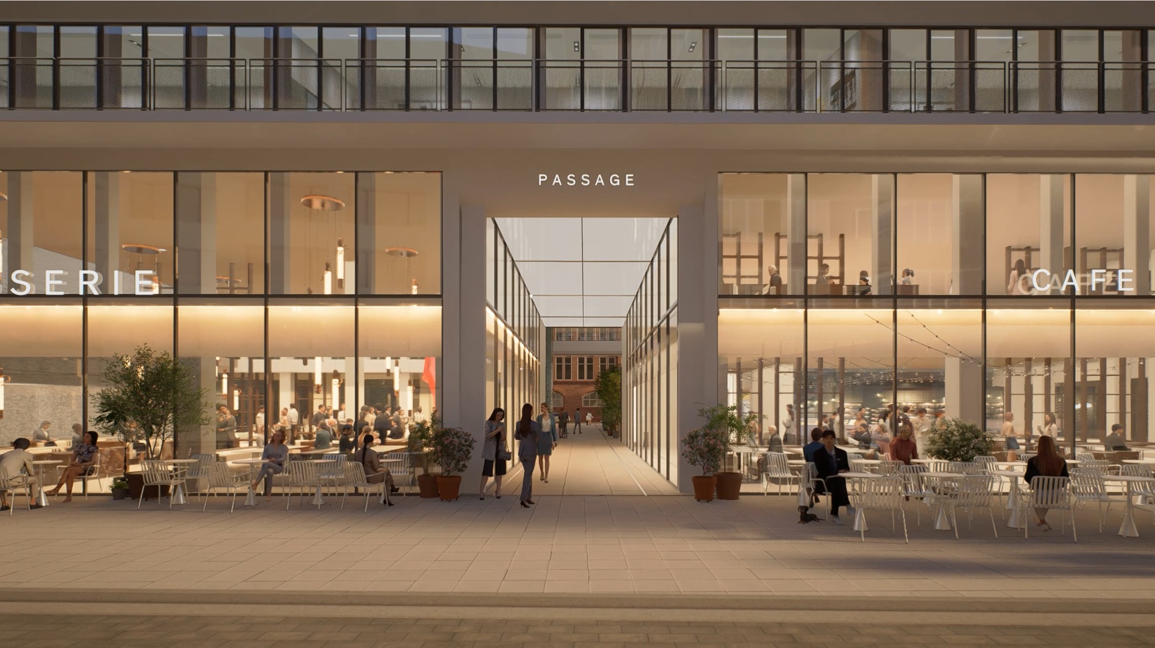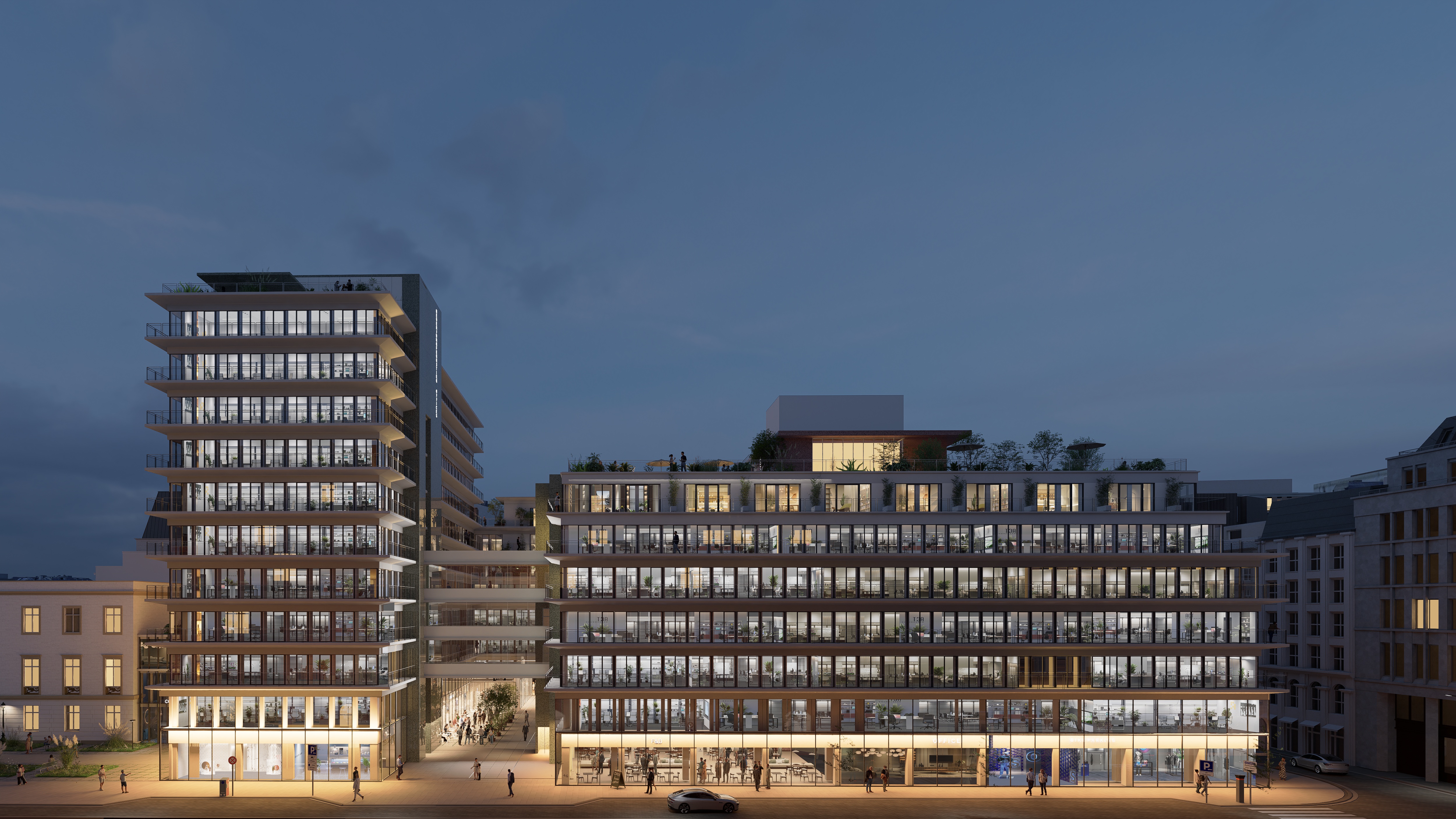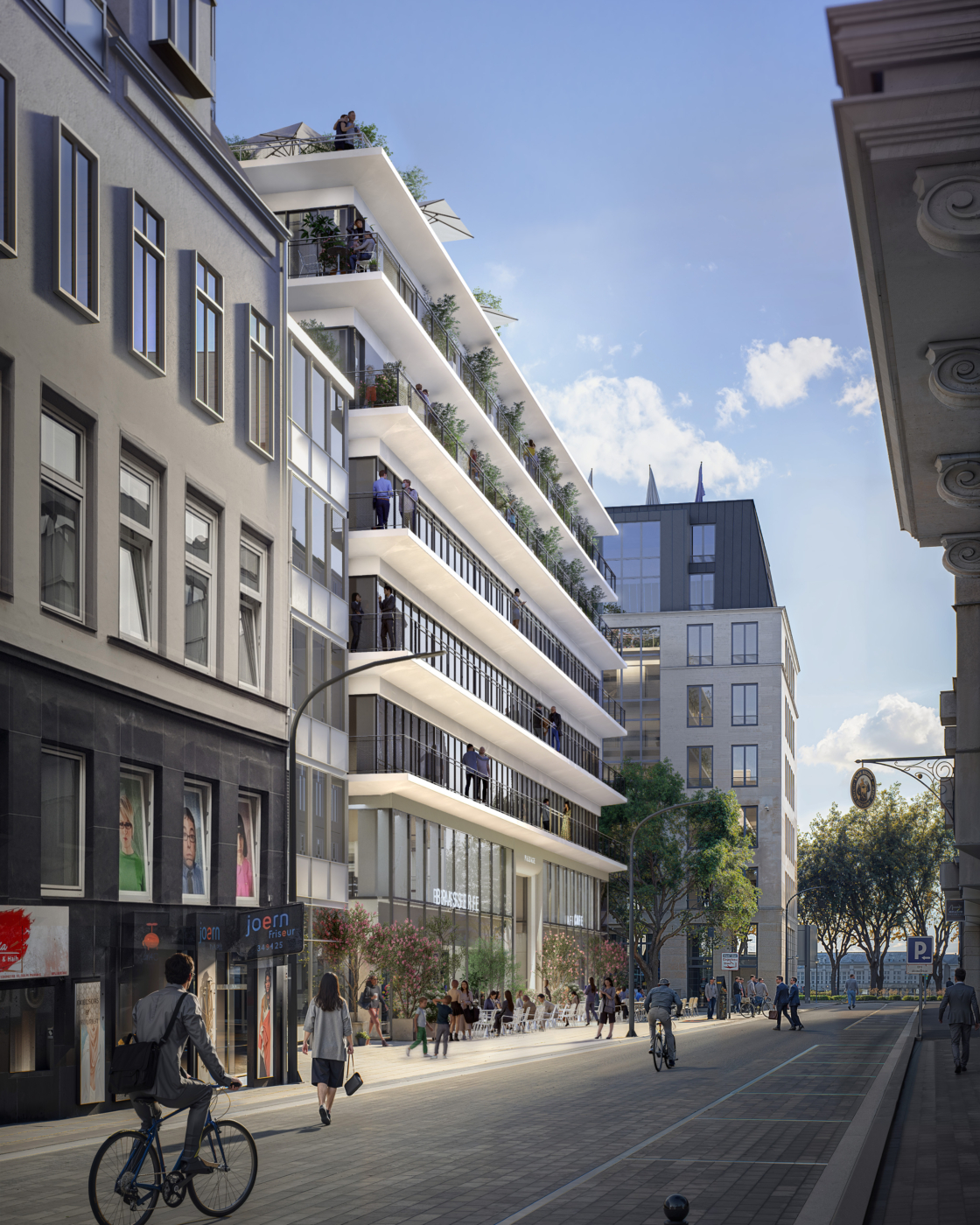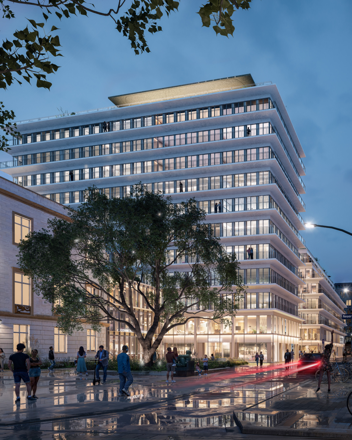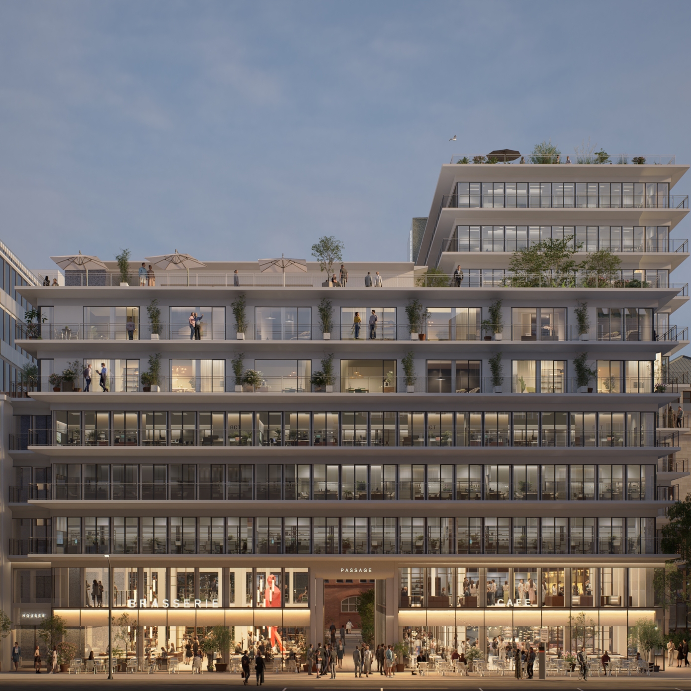 L’ensemble an der Binnenalster est repensé comme un bâtiment mixte, divisé entre bureaux, espaces d’hospitalité et espaces de loisirs. L’objectif est de créer une dynamique en renforçant la diversité des usages de l’ensemble, en particulier par les commerces et restaurants au rez-de-chaussée. Ces derniers bénéficient non seulement aux résidents du quartier et aux utilisateurs des bureaux, mais attirent également des visiteurs. La programmation autour d’une cour commune équipée d’installations partagées permet une utilisation flexible dans le temps.