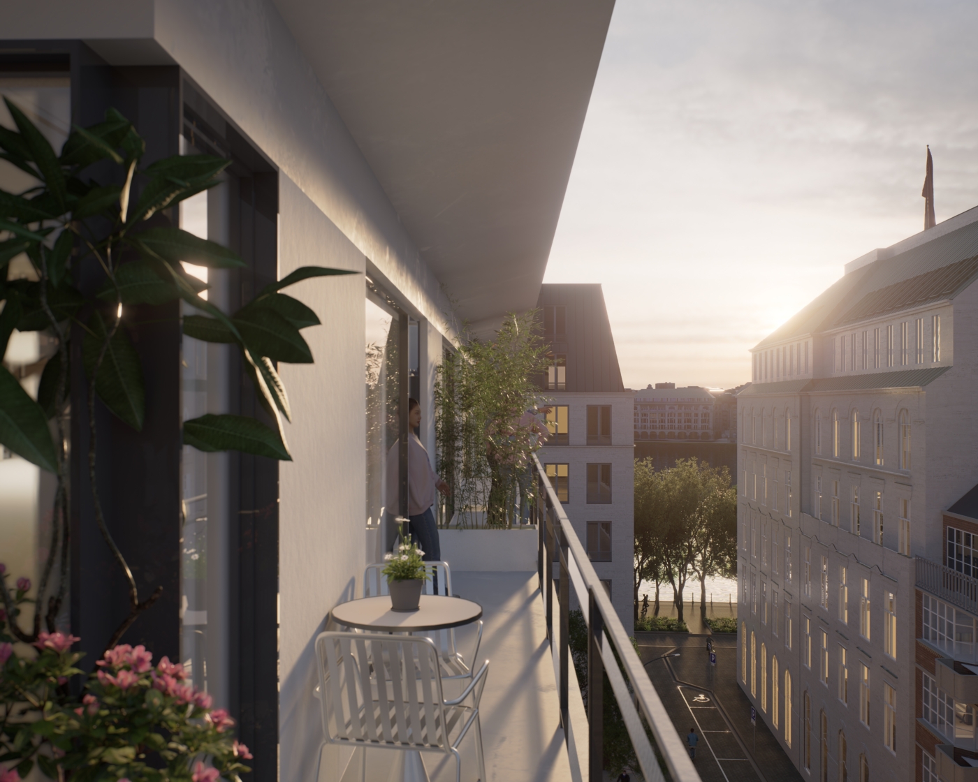 Pour les séjours prolongés, le projet propose une agréable zone Long-Stay, située entre l’hôtel et la résidence, où l’on peut se détendre, travailler ou même recevoir des clients, tout en préservant la confidentialité des échanges. Les espaces de logement sont repensés à travers des appartements lumineux aux deux derniers étages. Ces appartements disposent de balcons privés et d’un accès à une terrasse commune, offrant un espace de vie communautaire pour des fêtes, du bricolage, des jeux, du travail ou des moments conviviaux avec des amis ou des voisins.