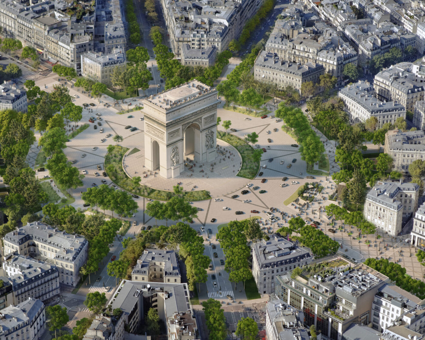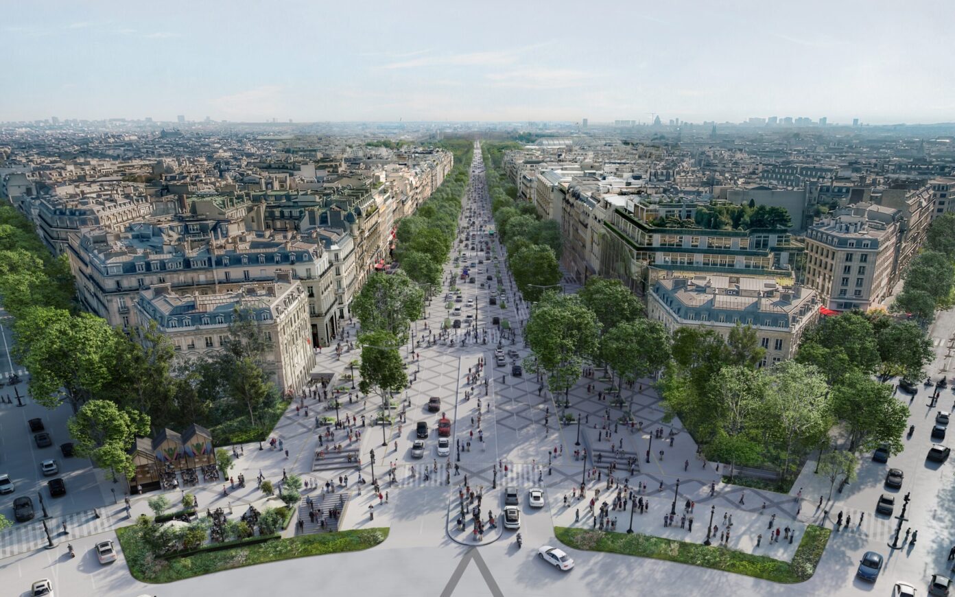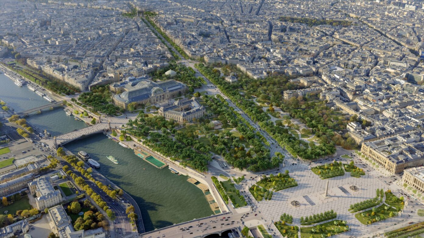 Hyper-lieu touristique et pollué dans sa partie haute, hyper-vide dans sa partie basse, avec ses jardins oubliés, morcelés et mal entretenus, l’Avenue présentent des pathologies urbaines opposées et complémentaires. La vision développée par PCA-STREAM propose de s’appuyer sur la puissance symbolique des Champs-Élysées pour engager les talents nationaux, publics comme privés, et transformer l’avenue en un démonstrateur urbain. Pour cela, il convient de pacifier l’hyper-lieu – en favorisant des usages et transports doux – et de réenchanter l’hyper-vide, via un renforcement de la biodiversité et une programmation originale. Agissant sur cinq strates urbaines – nature, infrastructures, mobilités, usages, bâti -, le plan d’action s’appuie sur quatre axes opérationnels aux effets mesurables : repenser la nature comme écosystème, inventer de nouveaux usages, réduire les nuisances des mobilités et recourir à la data comme outil. Les Champs-Élysées deviennent ainsi un territoire collectif d’expérimentation à l’horizon 2030 pour développer une ville durable, désirable et inclusive.