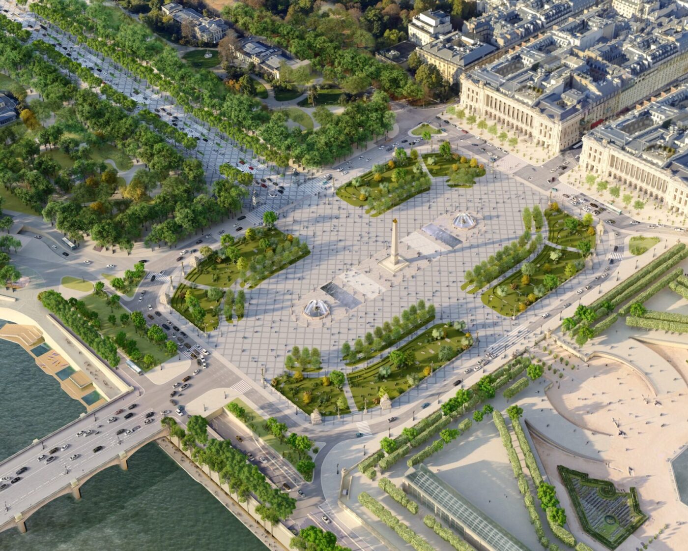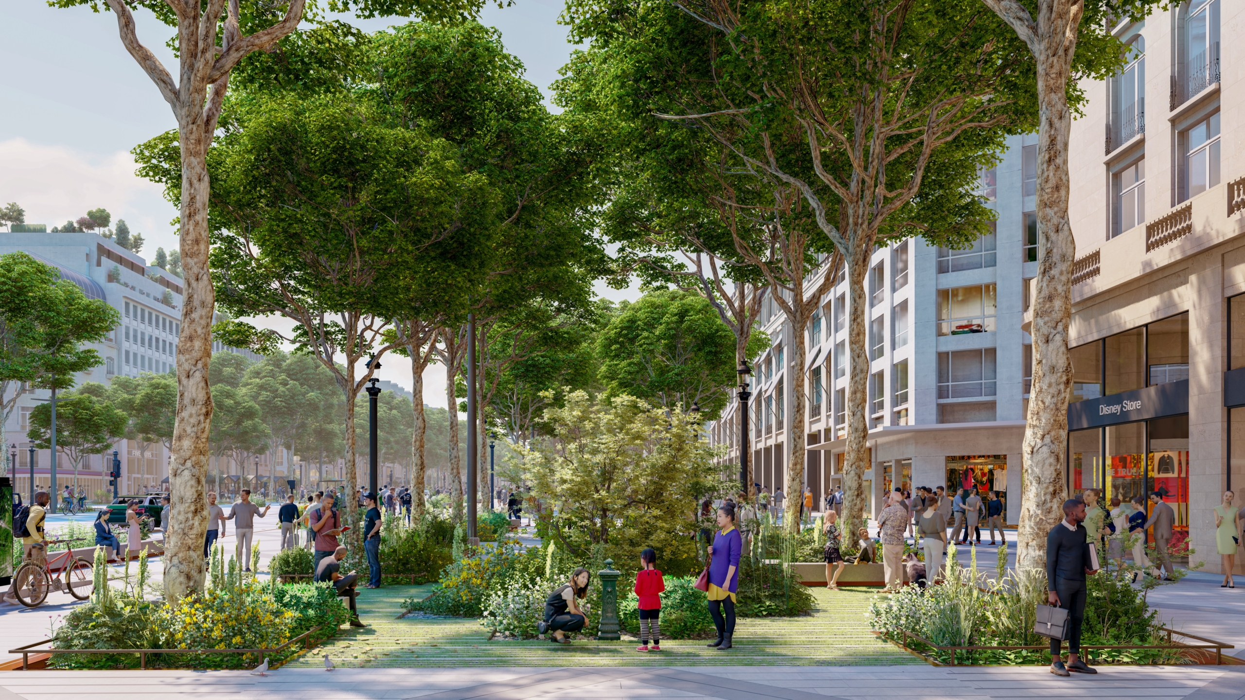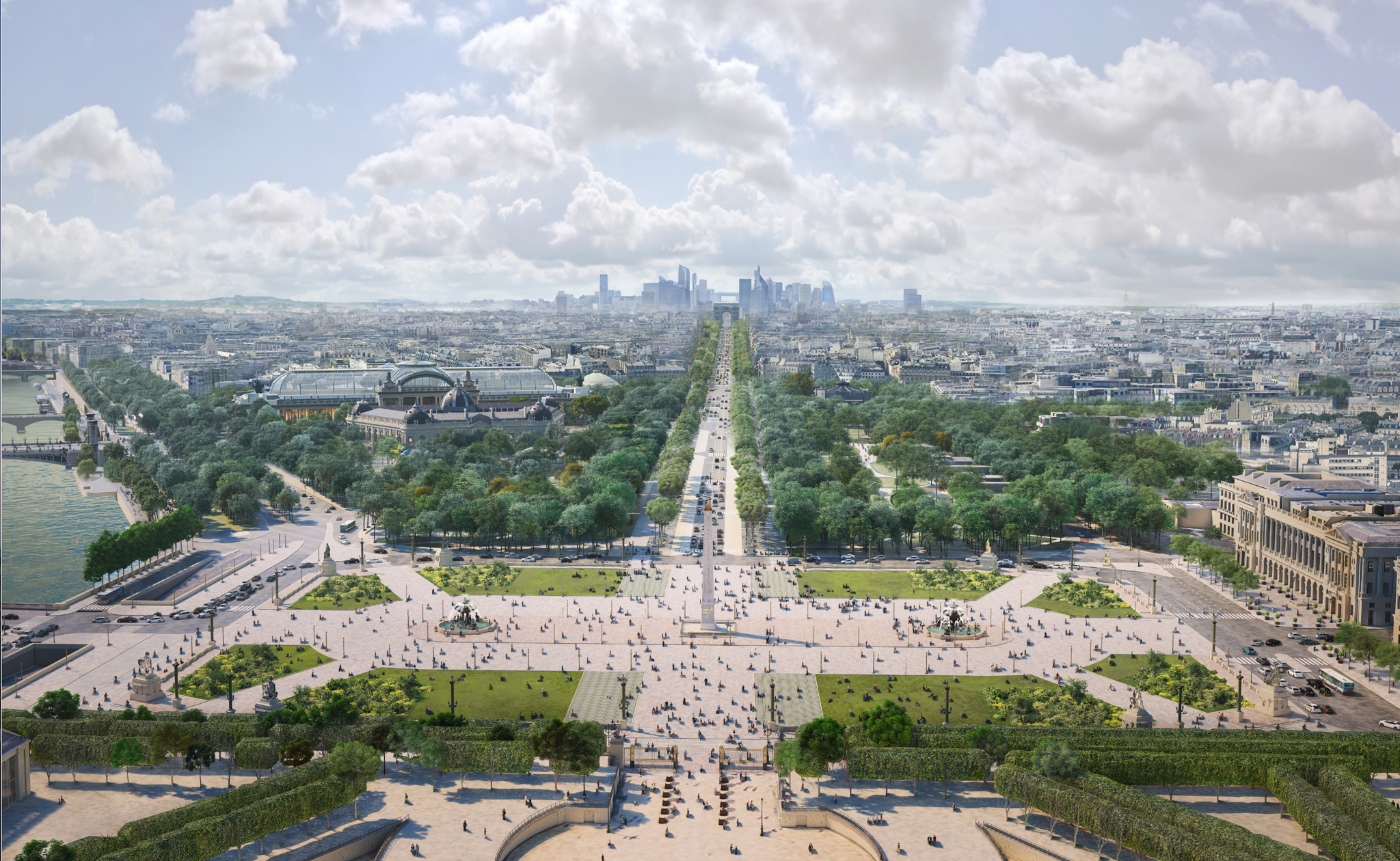Hyper-lieu touristique et pollué dans sa partie haute, hyper-vide dans sa partie basse, avec ses jardins oubliés, morcelés et mal entretenus, l’Avenue présentent des pathologies urbaines opposées et complémentaires. La vision développée par PCA-STREAM propose de s’appuyer sur la puissance symbolique des Champs-Élysées pour engager les talents nationaux, publics comme privés, et transformer l’avenue en un démonstrateur urbain. Pour cela, il convient de pacifier l’hyper-lieu – en favorisant des usages et transports doux – et de réenchanter l’hyper-vide, via un renforcement de la biodiversité et une programmation originale. Agissant sur cinq strates urbaines – nature, infrastructures, mobilités, usages, bâti -, le plan d’action s’appuie sur quatre axes opérationnels aux effets mesurables : repenser la nature comme écosystème, inventer de nouveaux usages, réduire les nuisances des mobilités et recourir à la data comme outil. Les Champs-Élysées deviennent ainsi un territoire collectif d’expérimentation à l’horizon 2030 pour développer une ville durable, désirable et inclusive.