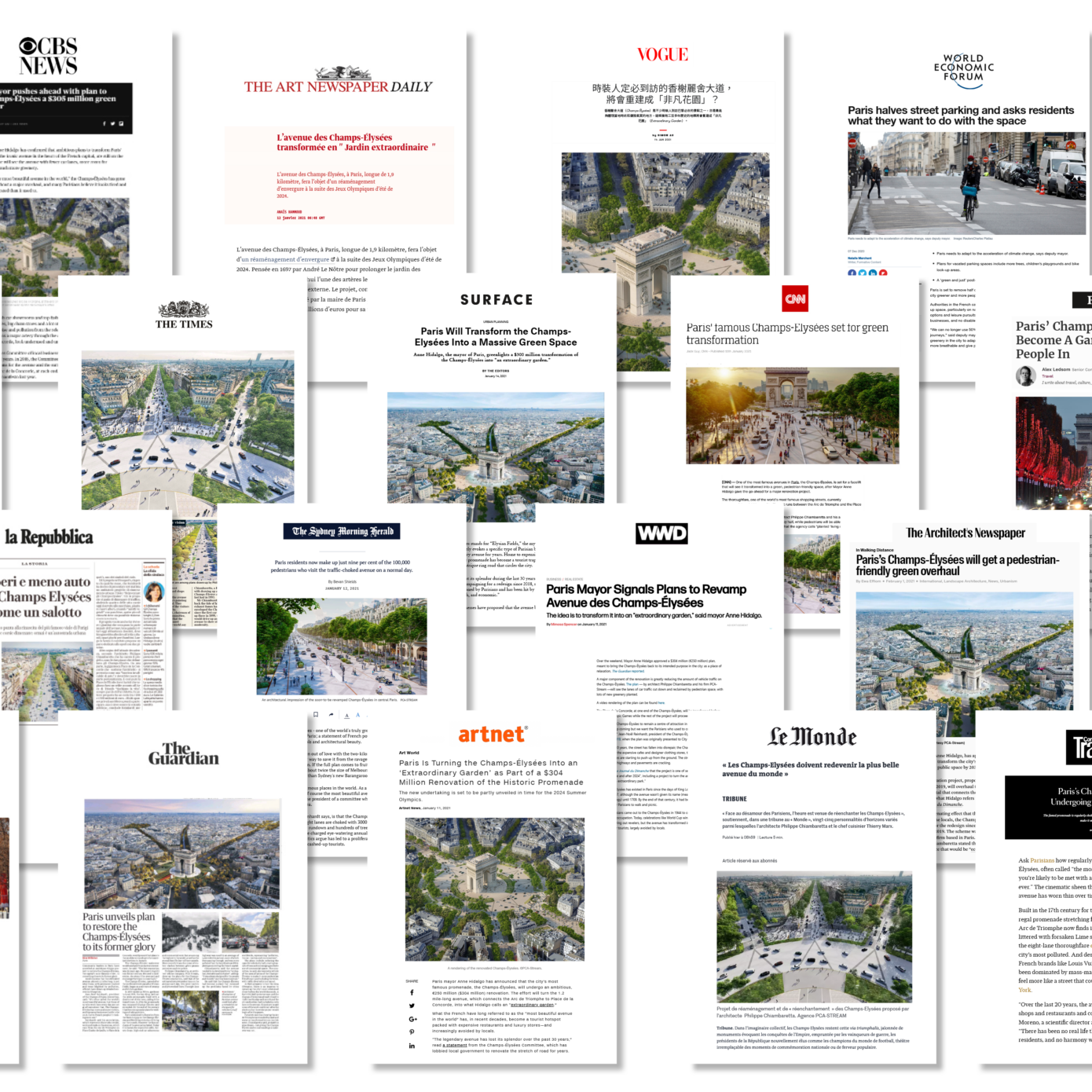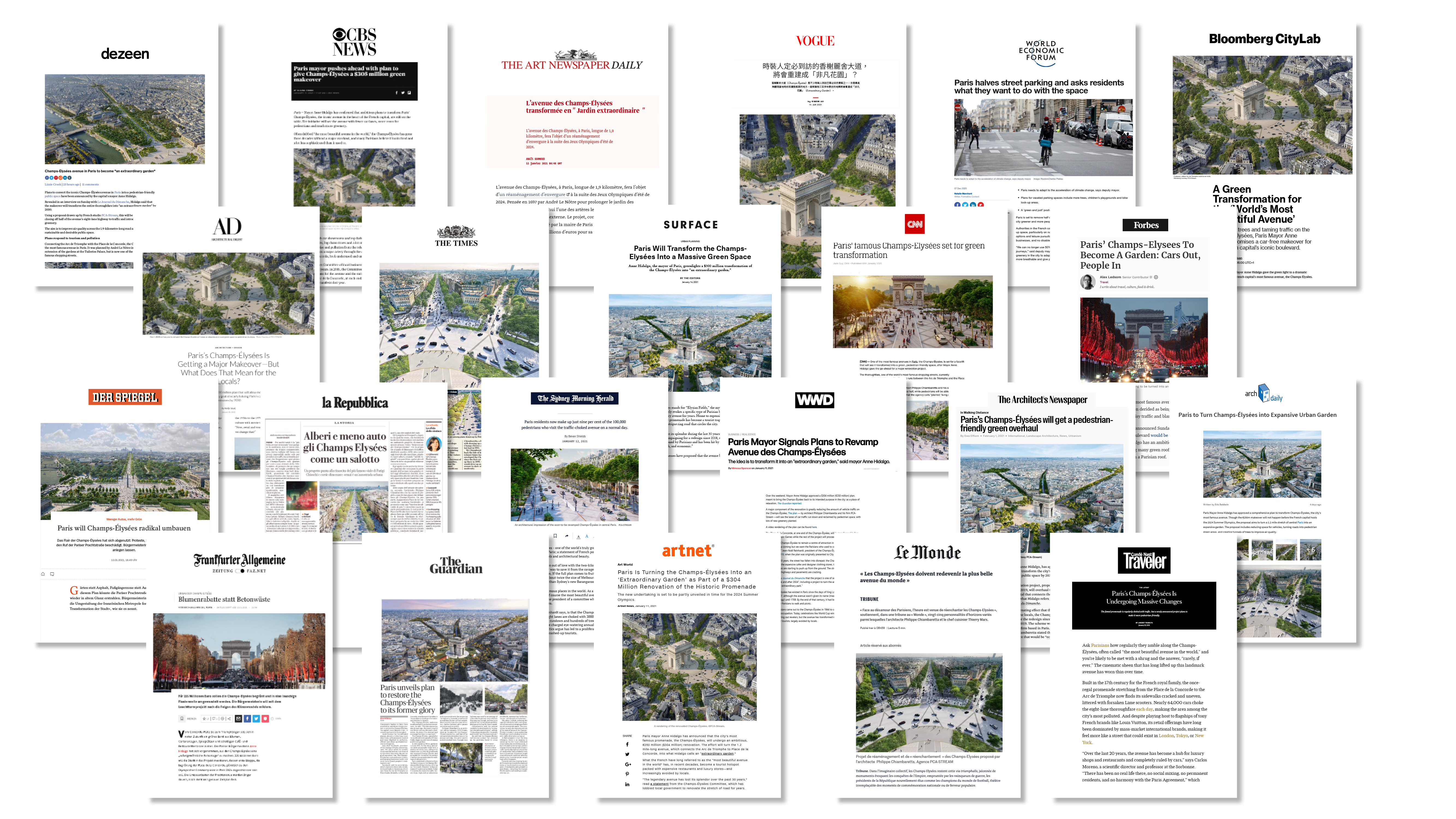 En 2018, le Comité Champs-Élysées, association des grands acteurs publics et privés de l’avenue, sollicite PCA-STREAM pour une réflexion, Réenchanter les Champs-Élysées, présentée lors d’un colloque en avril 2019. L’agence poursuit cette réflexion avec l’étude Champs-Élysées, histoire & perspectives en élargissant la question des Champs à l’avenir des territoires urbains, travail qui donne lieu à une exposition au Pavillon de l’Arsenal en février 2020. En contrepoint d’un récit historique, il s’agit de dresser un diagnostic et d’esquisser des perspectives pour relier le cadre local des Champs-Élysées aux enjeux de la mondialité urbaine contemporaine. PCA-STREAM propose cette recherche urbaine inédite en s’appuyant sur une équipe pluridisciplinaire d’experts, de chercheurs d’institutions universitaires de renom (MIT, Harvard, Sciences Po…) mais également de créateurs, selon son approche mêlant art et science.