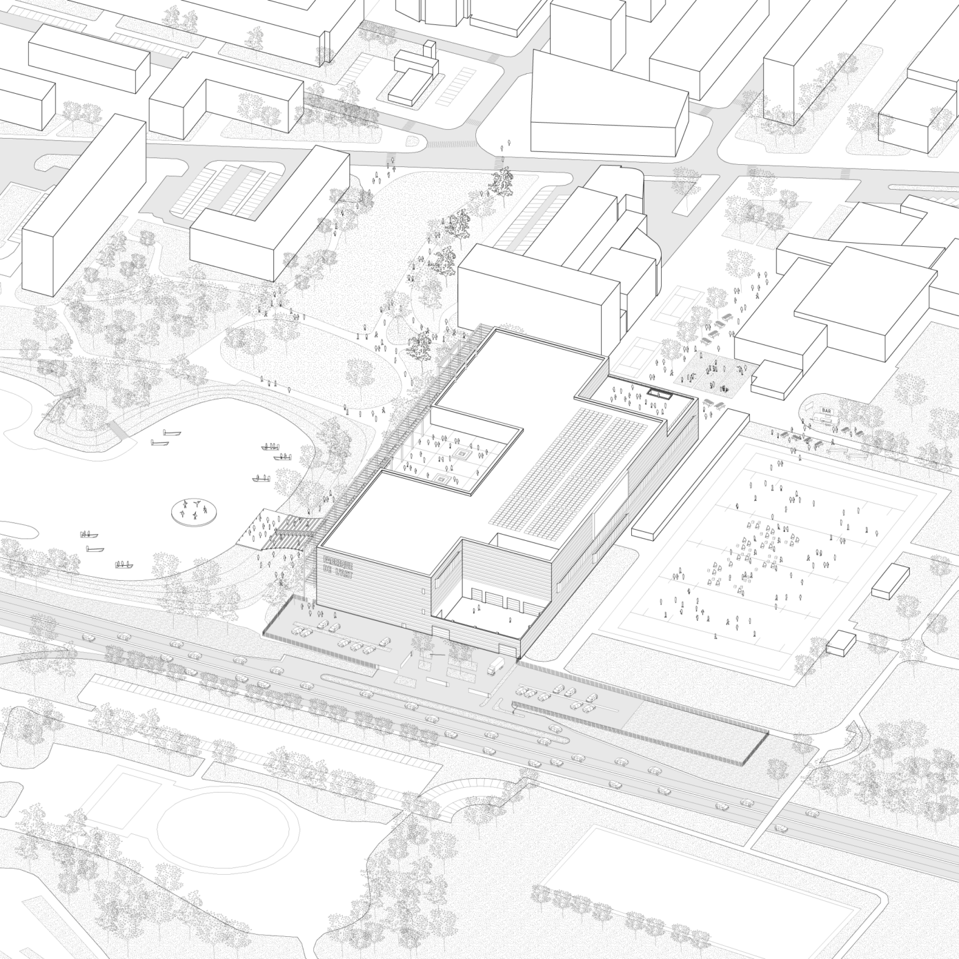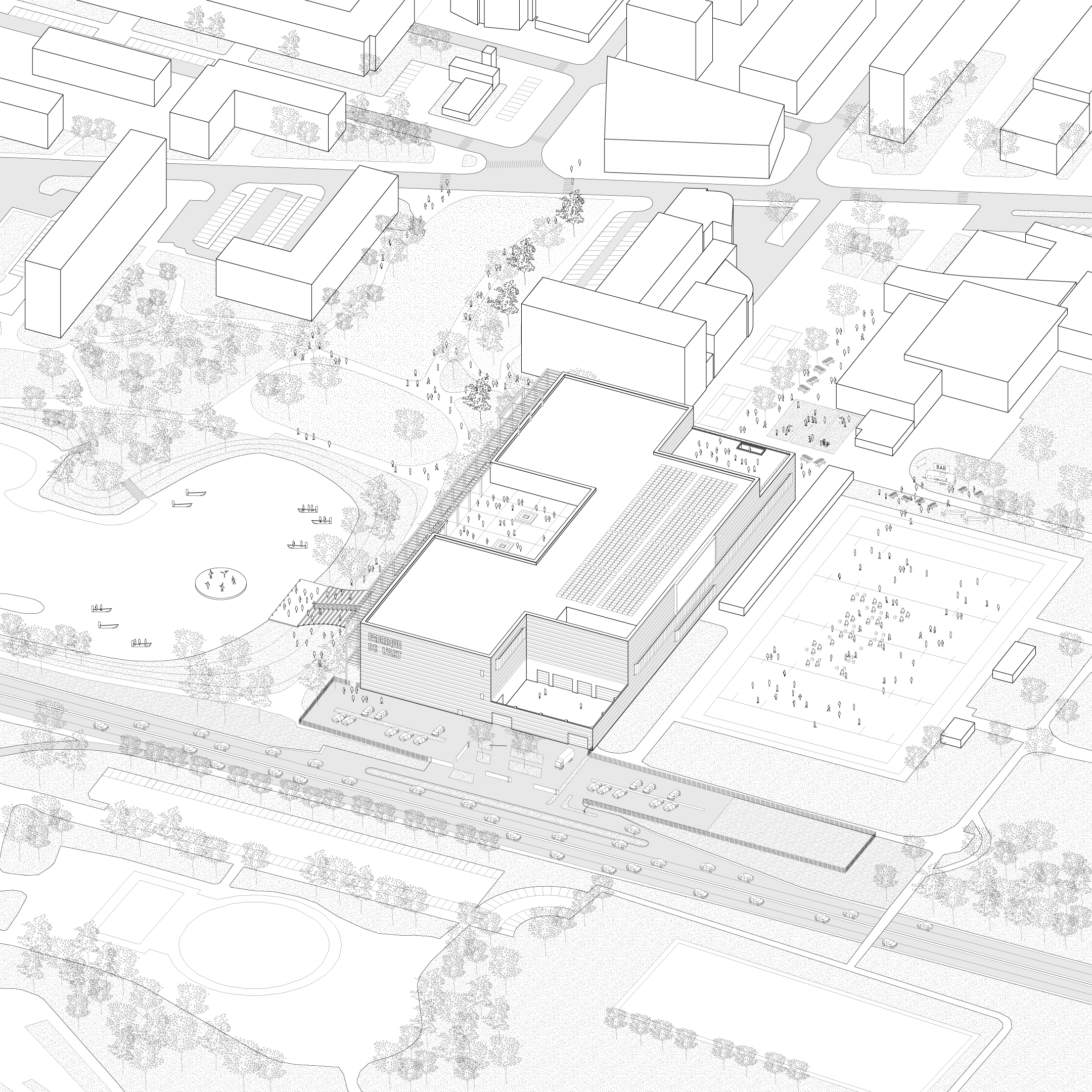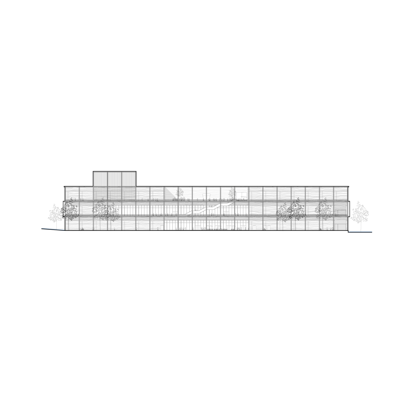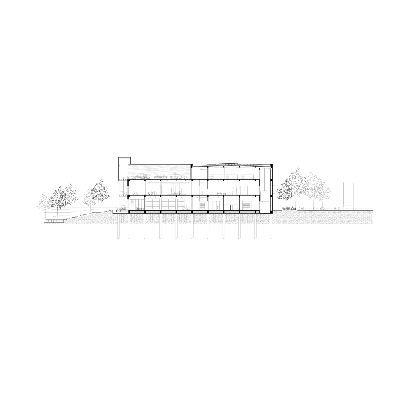 Le projet suit l’orientation nord-sud de la parcelle en créant un corridor écologique avec le parc de la Blanchette, son lac et le quartier Massy-Opéra. Sa matérialité révèle des strates sédimentaires symbolisant l’importance des sols dans la préservation de nos écosystèmes. L’implantation préserve la frange arborée en limite de propriété, tandis qu’une partie des toitures et de la façade sont végétalisées, tout comme l’emmarchement en amphithéâtre jusqu’au lac, qui pourra accueillir des rencontres artistiques de plein air. Ce dialogue entre le bâtiment et le parc signe une nouvelle alliance entre nature et culture.