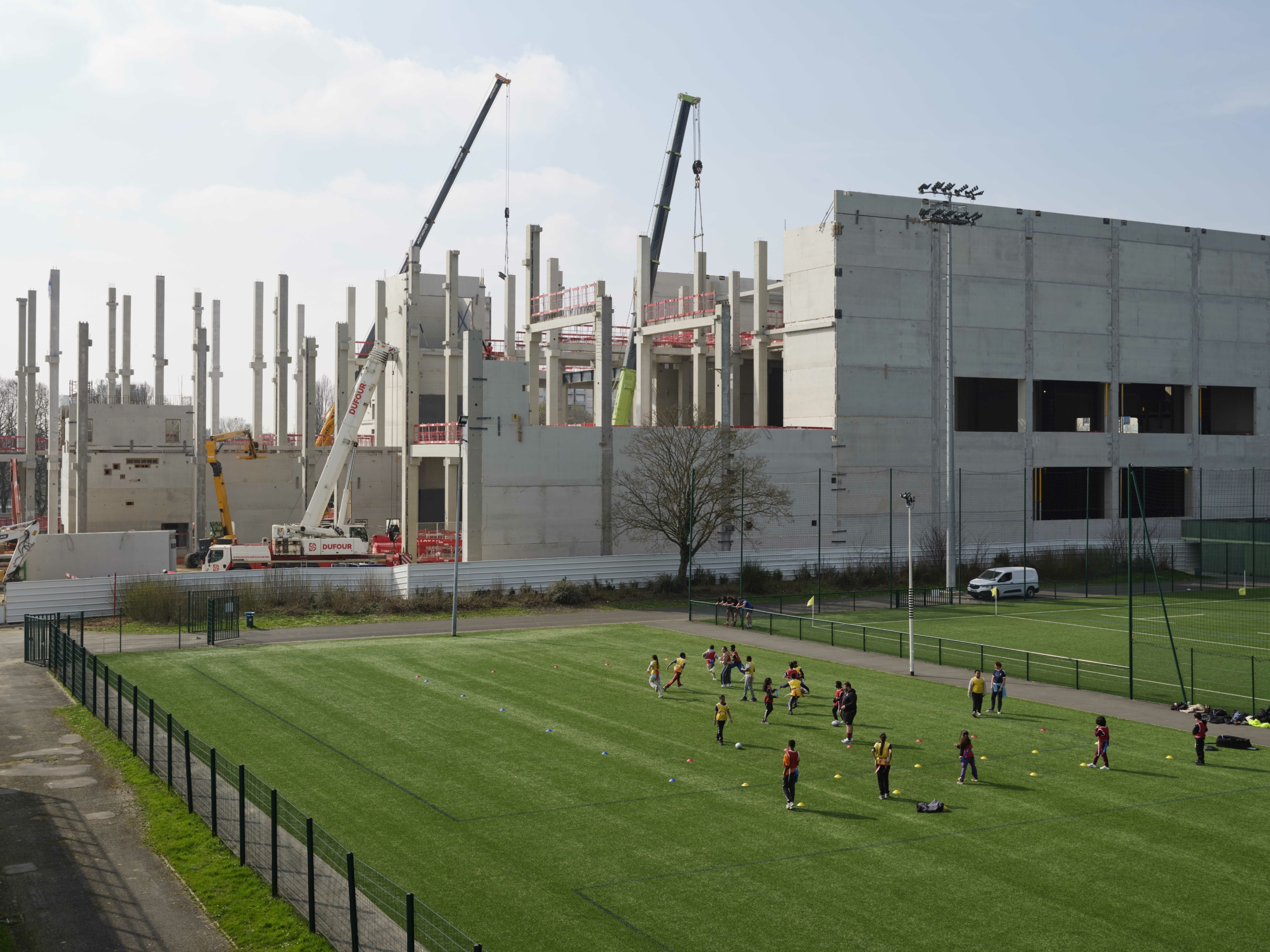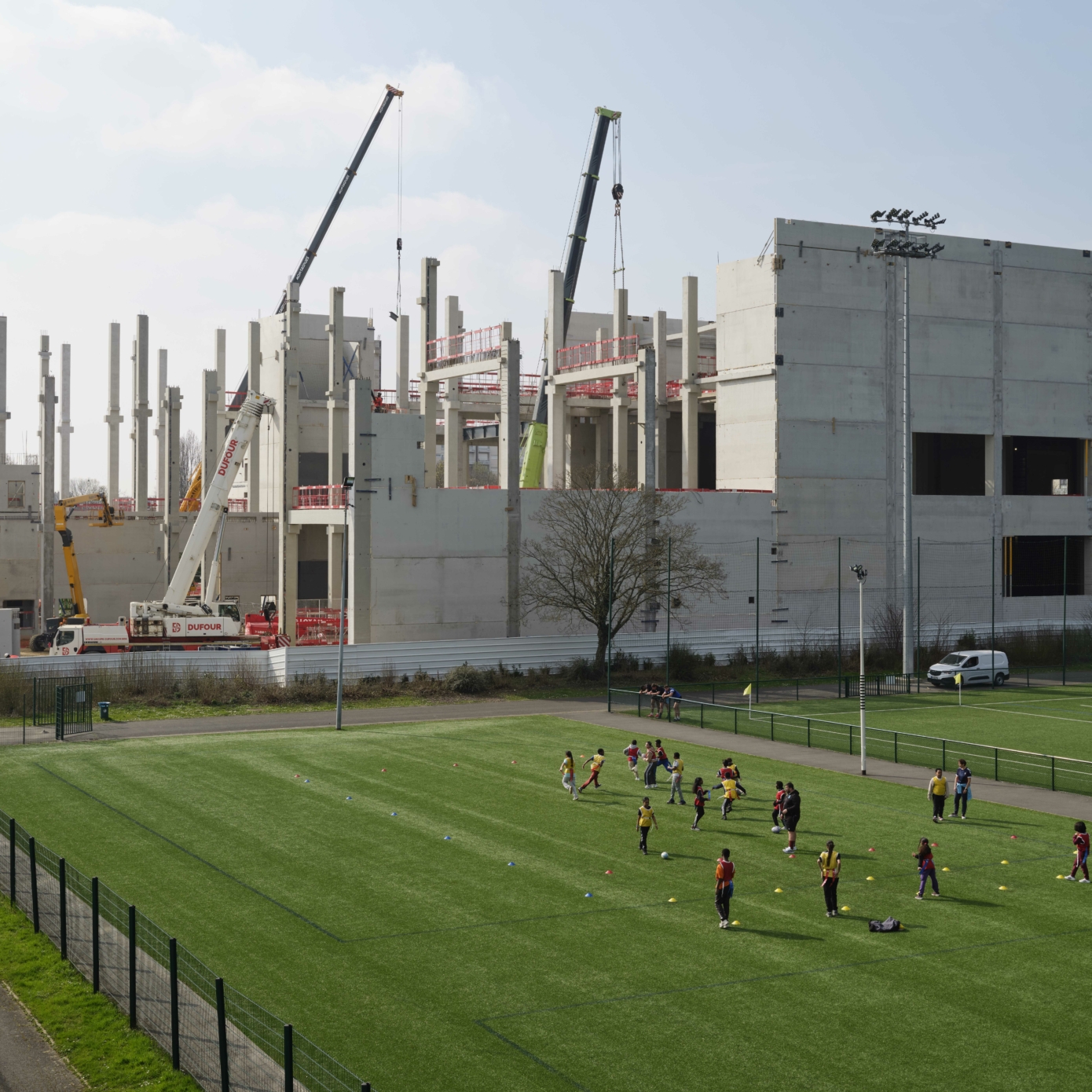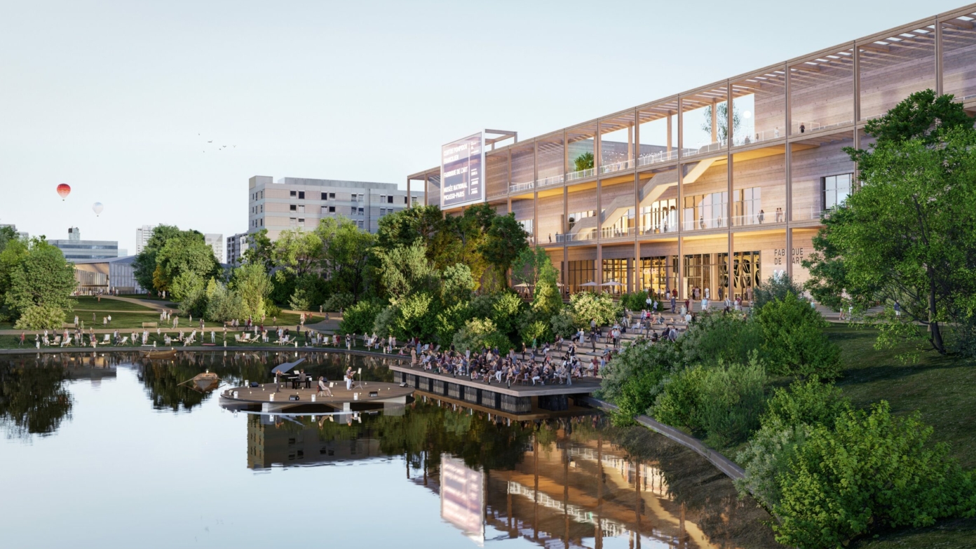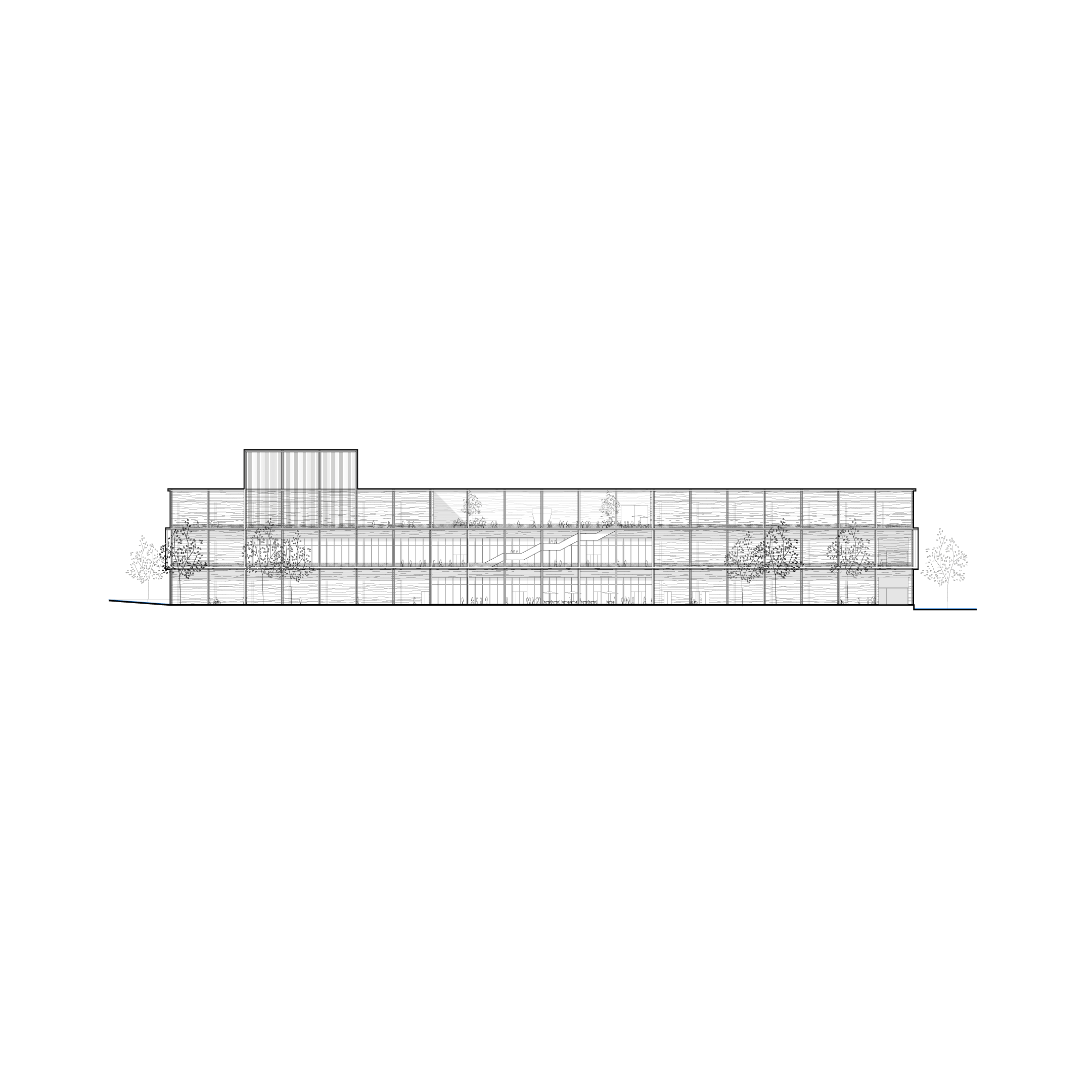 Le projet suit l’orientation nord-sud de la parcelle en créant un corridor écologique avec le parc de la Blanchette, son lac et le quartier Massy-Opéra. Sa matérialité révèle des strates sédimentaires symbolisant l’importance des sols dans la préservation de nos écosystèmes. L’implantation préserve la frange arborée en limite de propriété, tandis qu’une partie des toitures et de la façade sont végétalisées, tout comme l’emmarchement en amphithéâtre jusqu’au lac, qui pourra accueillir des rencontres artistiques de plein air. Ce dialogue entre le bâtiment et le parc signe une nouvelle alliance entre nature et culture.