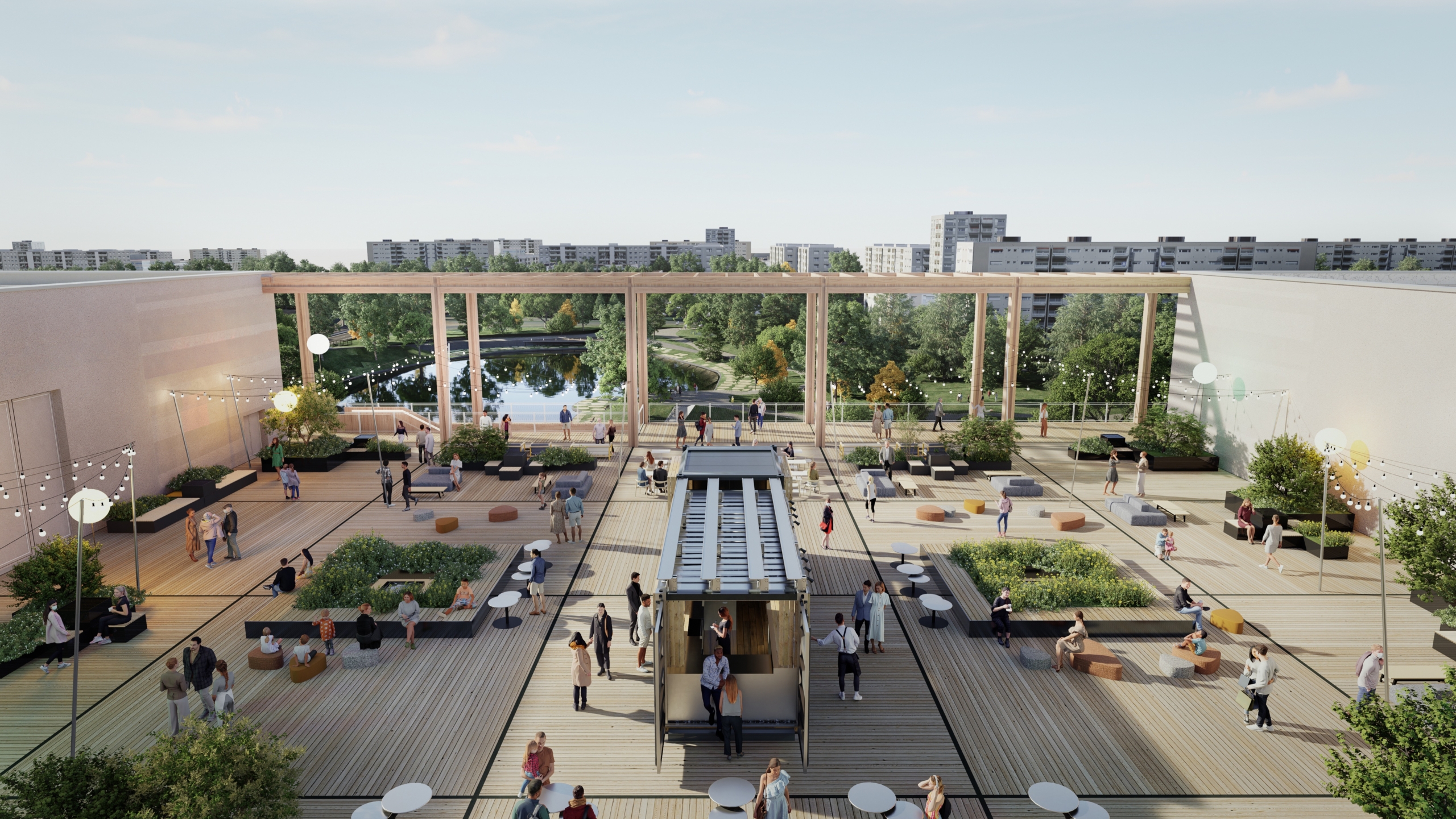 Le bâtiment se déploie vers le parc de la Blanchette par une promenade arborée, comme le Centre Pompidou s’ouvre à la ville par sa piazza. La terrasse ombragée du café-librairie qui accueille les visiteuses et les visiteurs se prolonge en gradins paysagers vers le lac. Les espaces d’exposition ouverts au public jouissent d’une coursive en bois permettant de contempler le parc, comme on admire le quartier Beaubourg depuis celles du Centre. Au deuxième étage, un belvédère dominant la canopée accueille des événements publics ; son escalier en bois évoque en façade l’emblématique « chenille » de Pompidou. Les proportions du bâtiment participent de ces subtiles assonances avec le bâtiment historique, notamment lorsqu’il se dédouble en se reflétant dans le lac.
