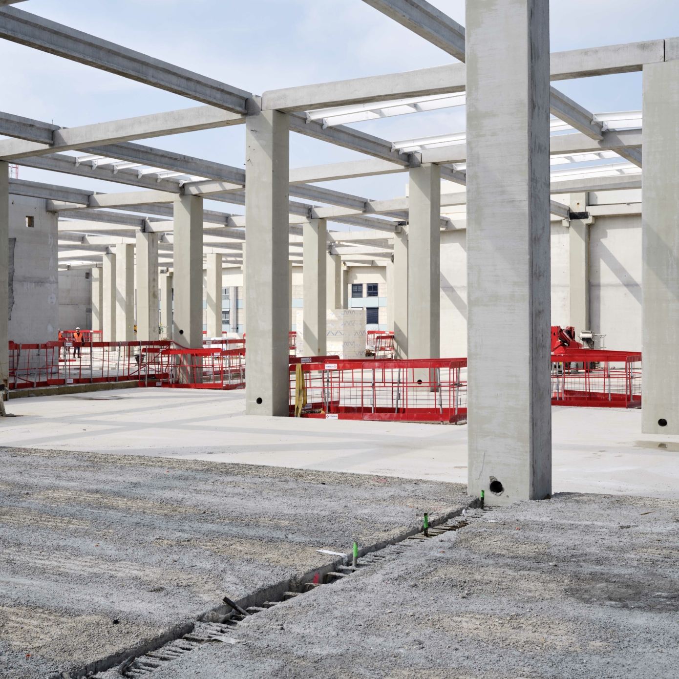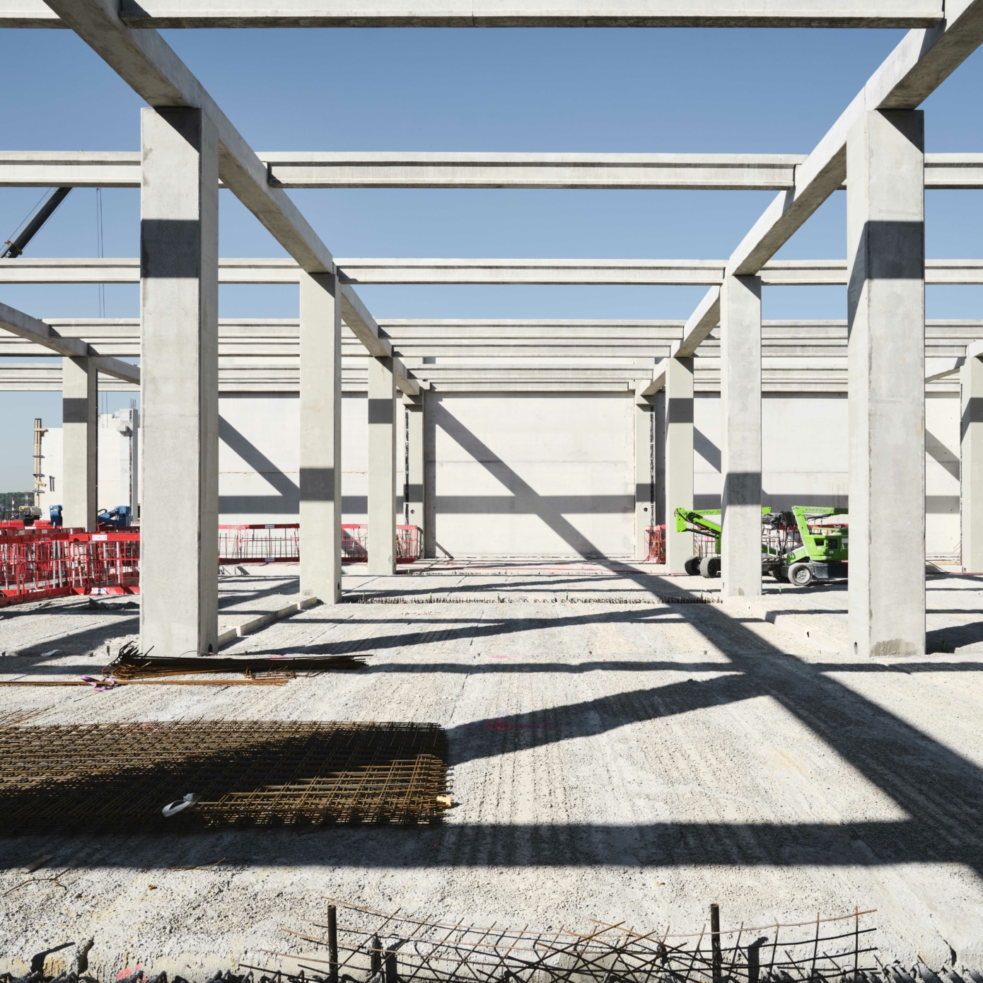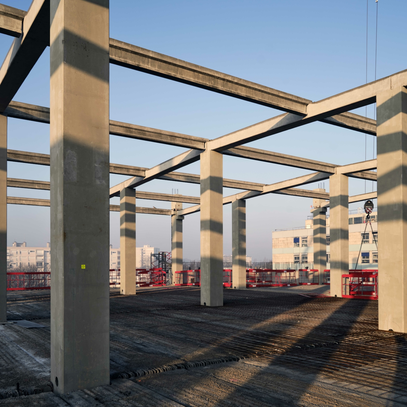 L’audace du Centre Pompidou historique est réinventée au prisme d’une conscience de la fragilité des écosystèmes naturels et humains. La conception responsable passe par l’optimisation des ressources et l’intégration de matériaux biosourcés et pérennes, dont le bois pour l’exostructure et une partie des charpentes et planchers. Le choix d’un bâtiment compact permet de réduire le volume de matériaux et les dépenses énergétiques, compensées par près de 2 000 m2 de panneaux photovoltaïques en toiture. La trame cubique de 9 m de côté, identique sur les trois niveaux, permet une excellente flexibilité, modularité et évolutivité des espaces dans le temps, gage de durabilité. D’une géométrie sobre, la façade est formée d’un double voile en béton géologique de près de 50 cm d’épaisseur, d’une grande inertie. Les lames verticales des baies des ateliers, qui s’animent d’un jeu cinétique la nuit, participent à la protection thermique passive selon les orientations, tout en conservant les vues extérieures.