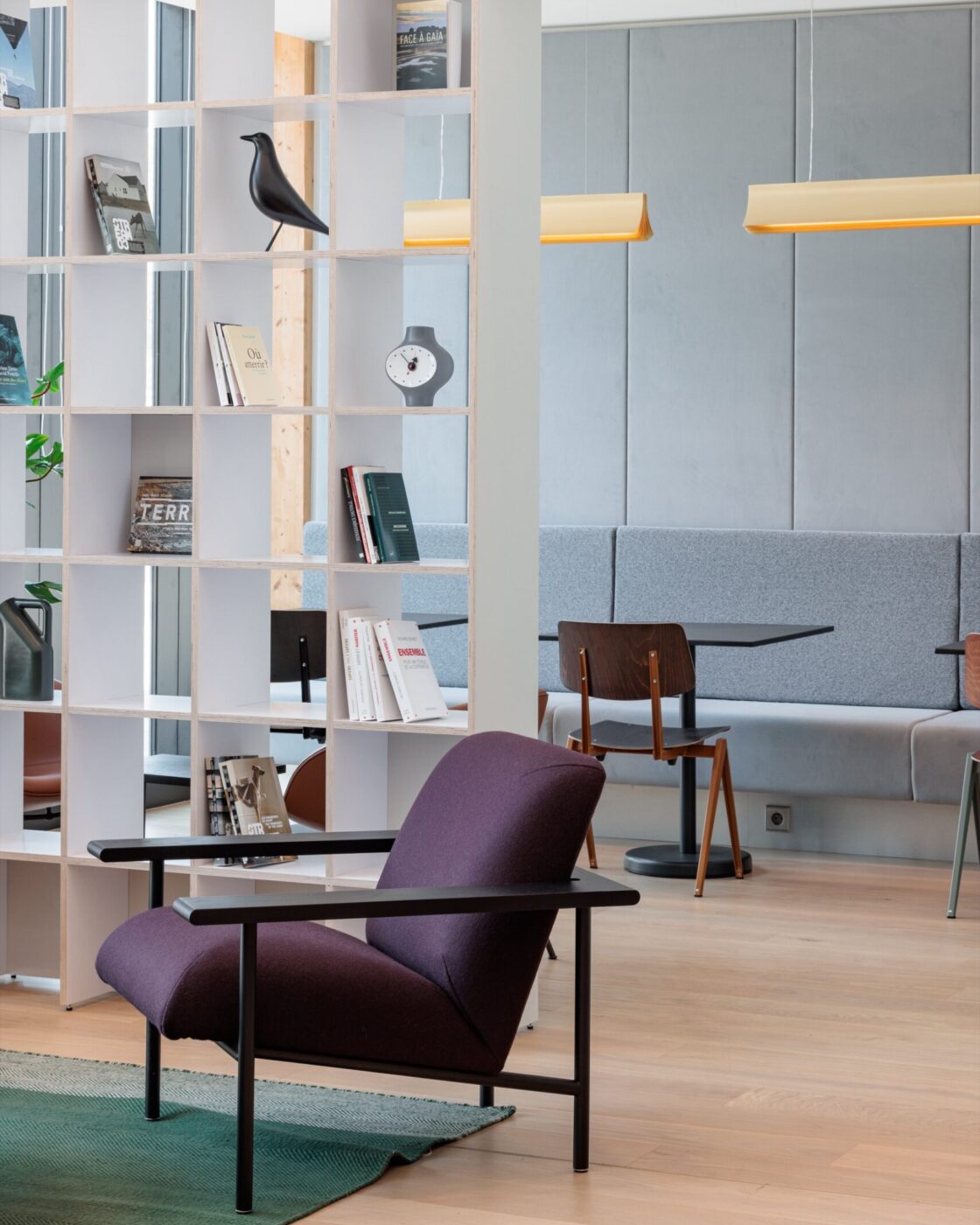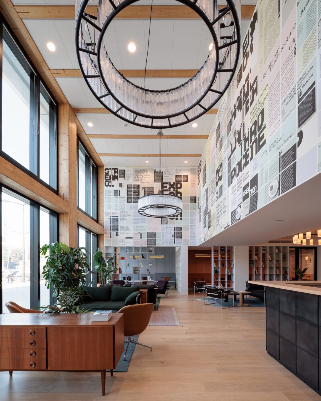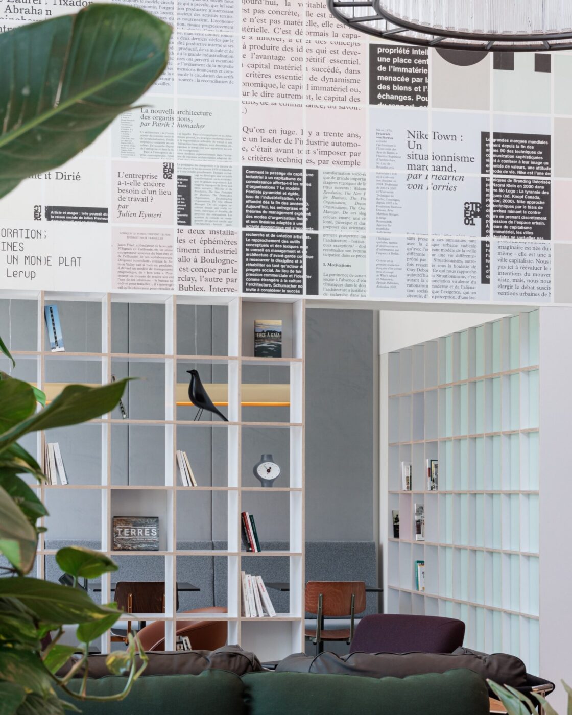 Le Stream Café a été imaginé par le Pôle comme un espace d’accueil, de rencontre et de détente, mais aussi de travail informel ou de réflexion. Les partenaires extérieures de l’entreprise peuvent y attendre leur rendez-vous, tandis que les collaborateurs s’y retrouvent pour un café, un temps d’échange ou une session de travail dans un cadre informel. En soirée, il se prête idéalement à un after work ou un événement festif. Élément à la fois fonctionnel, symbolique et décoratif, des bibliothèques recouvrent plusieurs pans de mur, remplies d’objets de design et d’un large ensemble de livres dont la curation a été confiée au Stream Lab, autour de thématiques de recherche liées à l’innovation urbaine et regroupant nombre de contributeurs du réseau Stream. Les couleurs habillant les fonds de bibliothèque sont inspirées de celle la maquette de la revue, dont certaines pages ont été extraites et retravaillées graphiquement pour les transformer en un papier peint qui habille les pans de mur libres, donnant au lieu une atmosphère unique. Au fond du Stream Café, un local de coworking solidaire, dit Cinaspic, géré en collaboration avec la Direction de l’attractivité et de l’Emploi de la Ville, permet également d’y accueillir les associations du quartier.