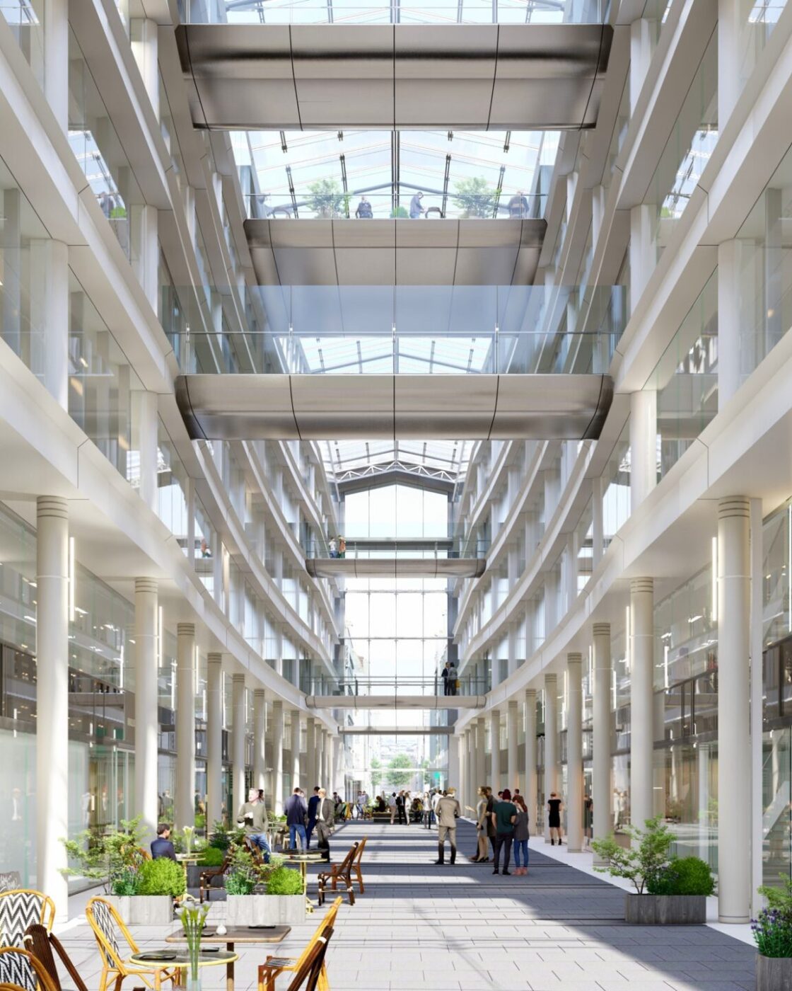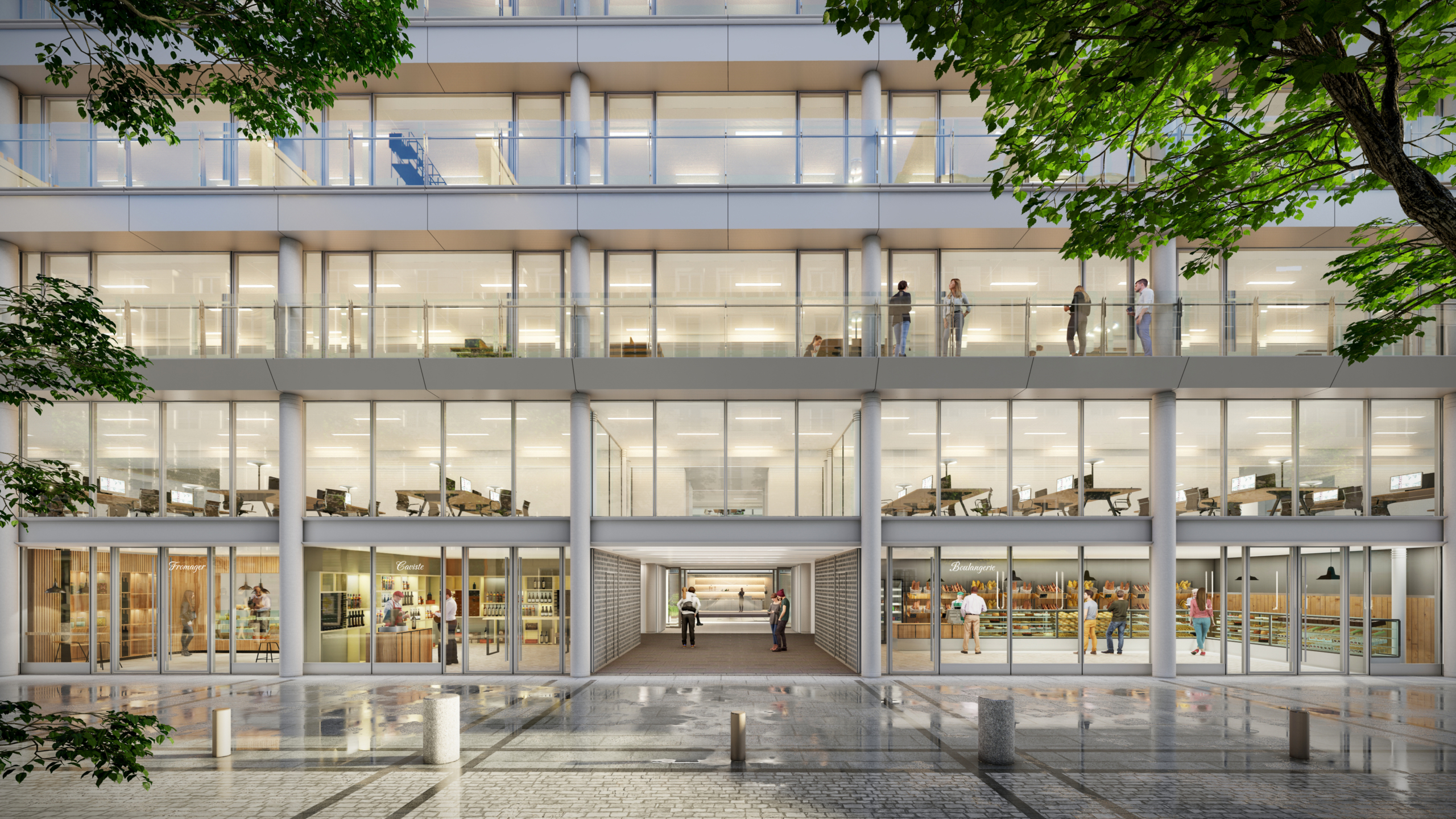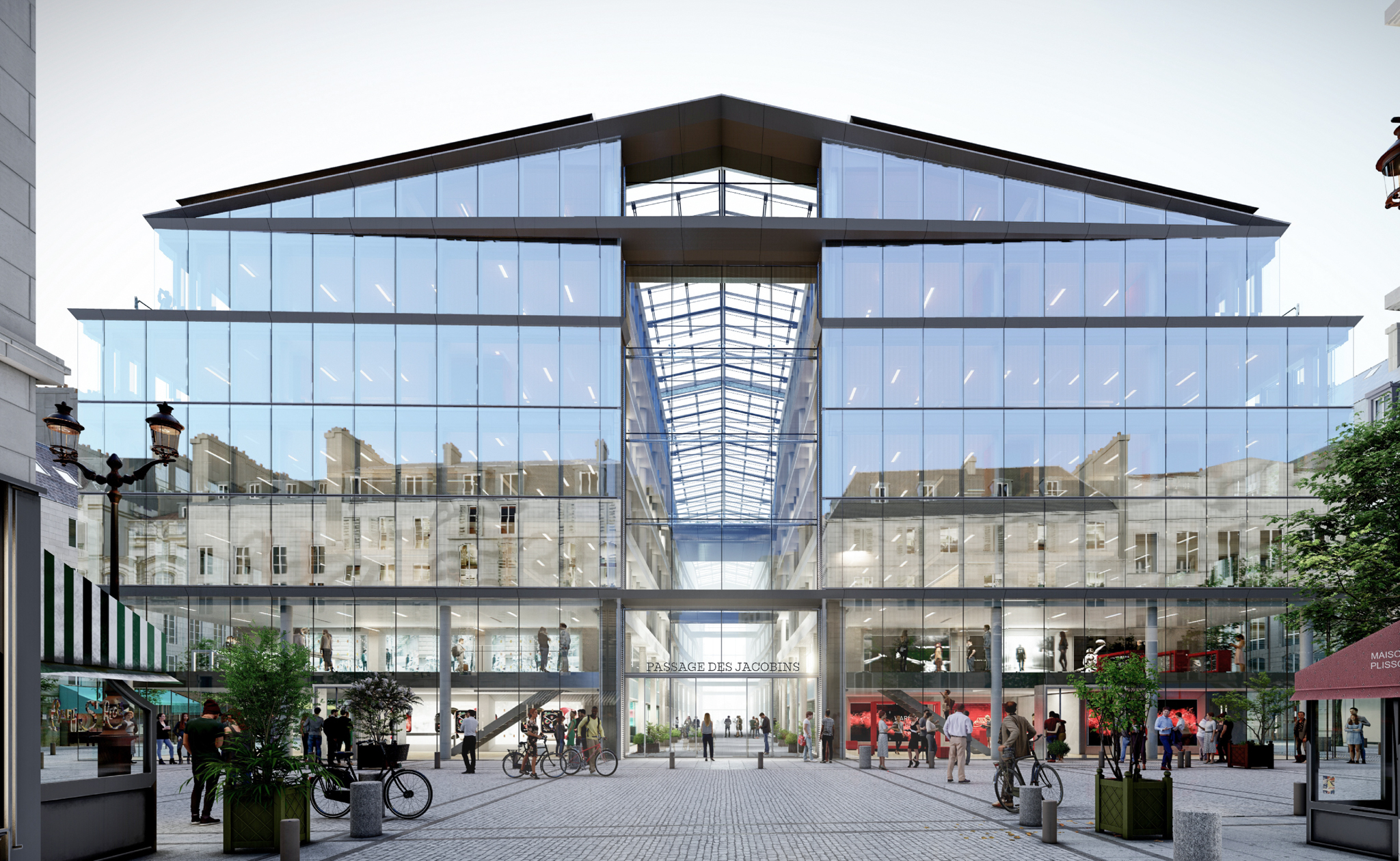 Le hall d’accueil et le lobby des bureaux sont déplacés au cœur du passage des Jacobins, ce qui permet de libérer du linéaire commercial et d’animer le passage. Sa semi-fermeture le rend plus accueillant et immersif, pour le transformer en véritable lieu de vie, habité par différents îlots d’assises. Le changement du système de vitrine permet de répondre à des attentes plus haut de gamme et d’améliorer l’appel depuis la rue par une nouvelle programmation commerciale.
