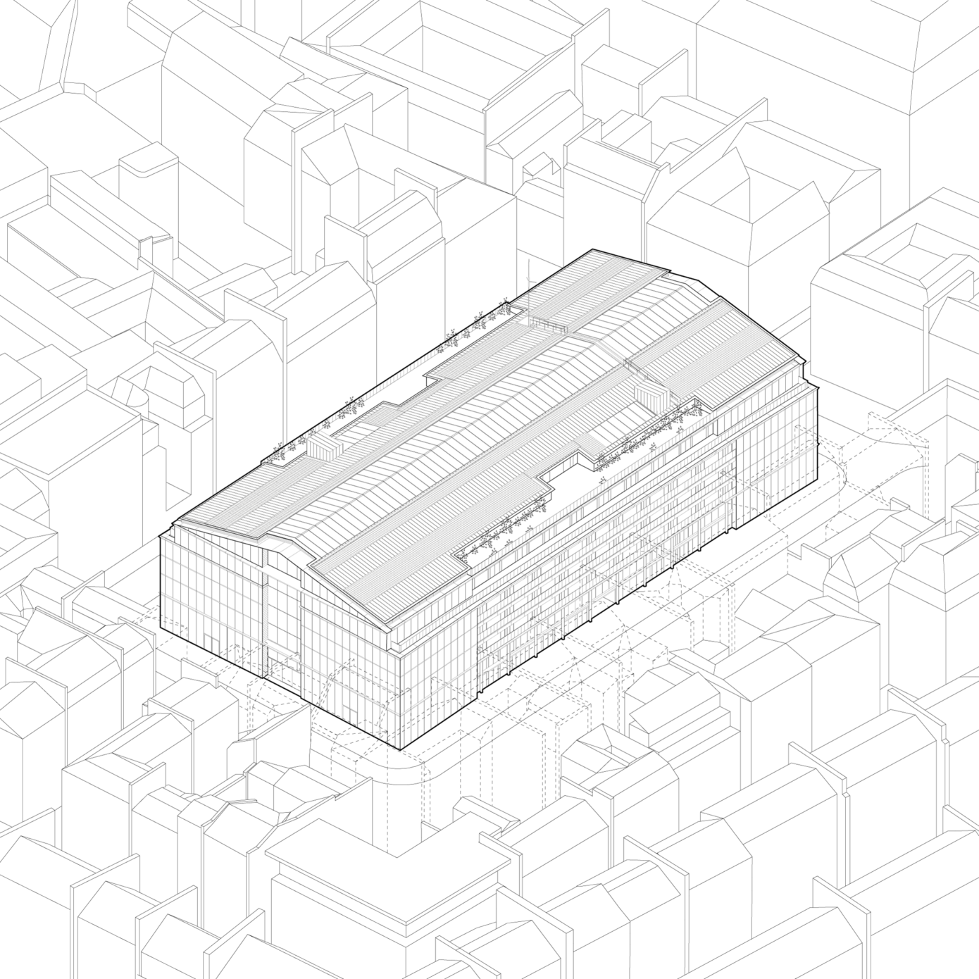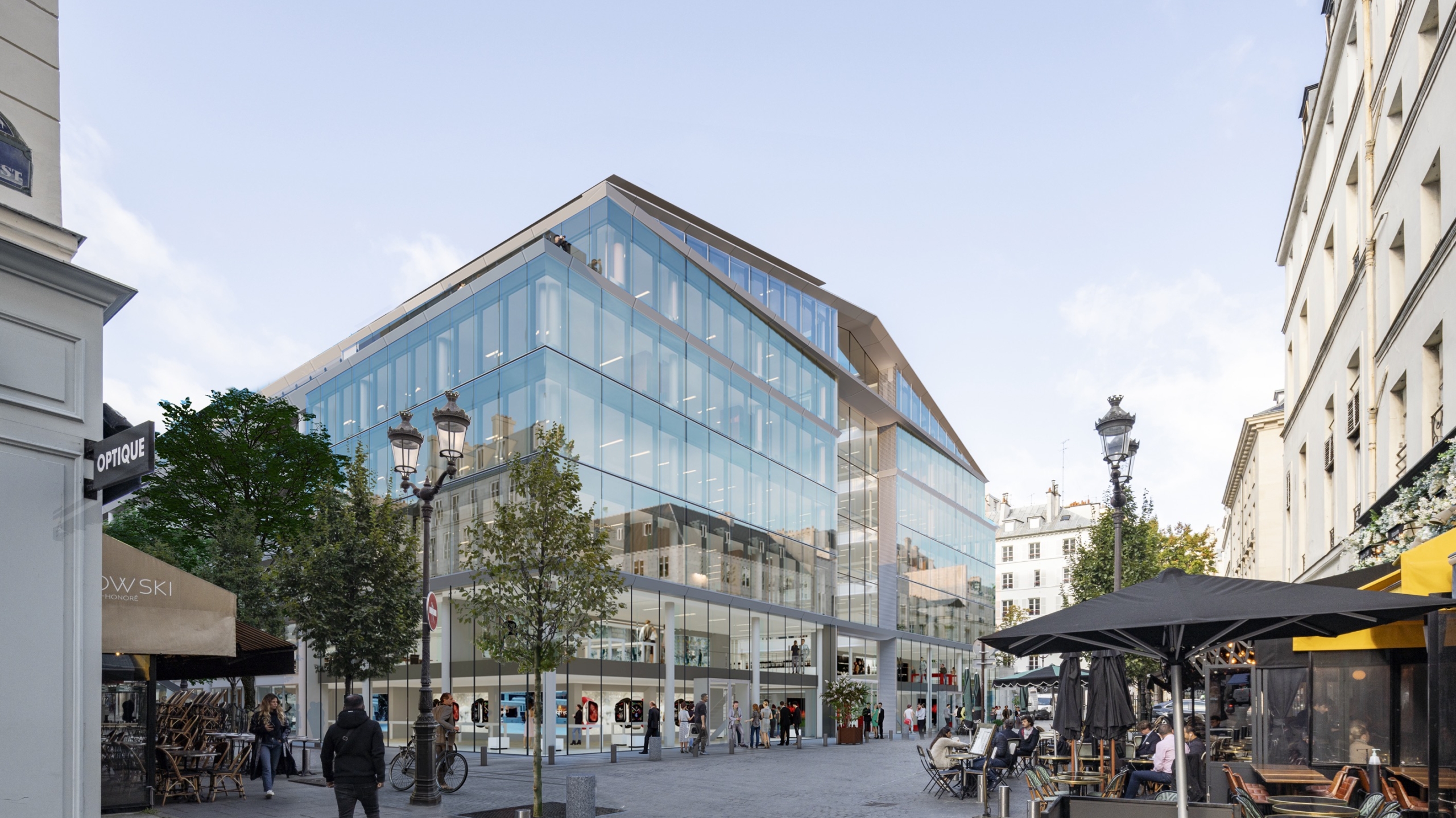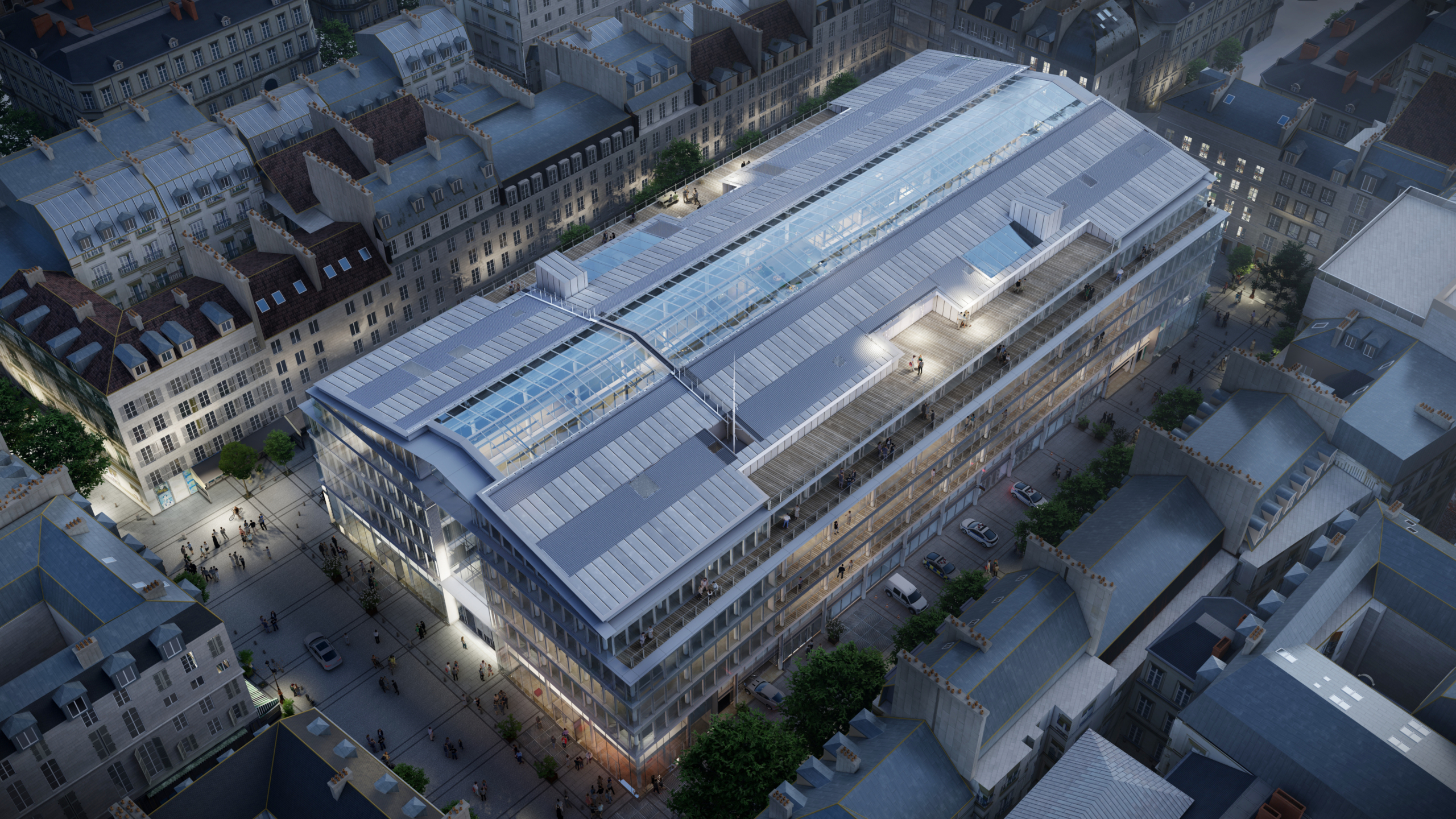 Le hall d’accueil et le lobby des bureaux sont déplacés au cœur du passage des Jacobins, ce qui permet de libérer du linéaire commercial et d’animer le passage. Sa semi-fermeture le rend plus accueillant et immersif, pour le transformer en véritable lieu de vie, habité par différents îlots d’assises. Le changement du système de vitrine permet de répondre à des attentes plus haut de gamme et d’améliorer l’appel depuis la rue par une nouvelle programmation commerciale.