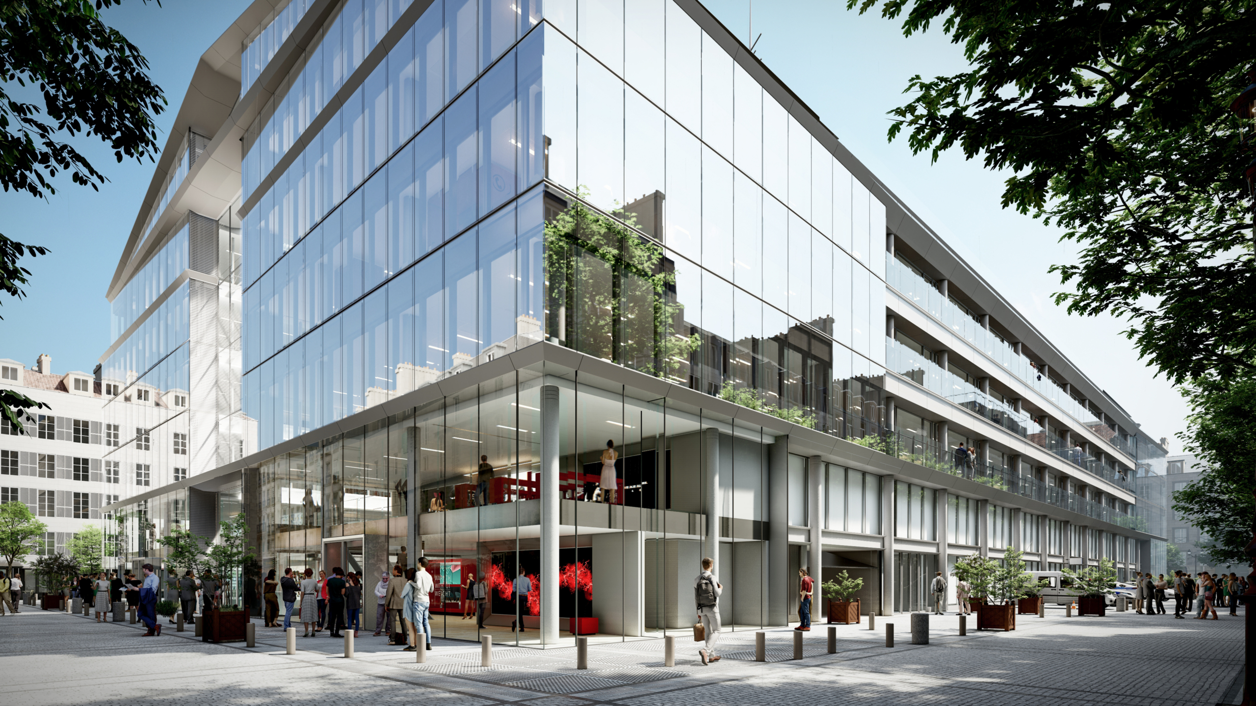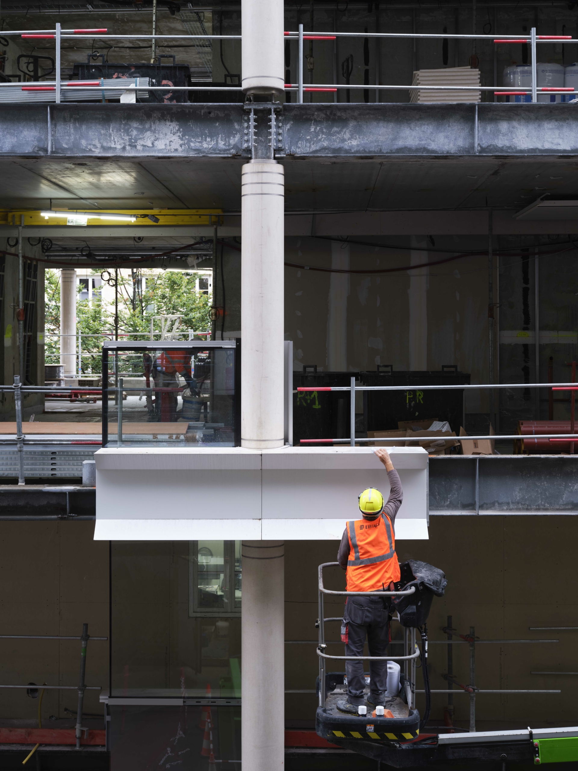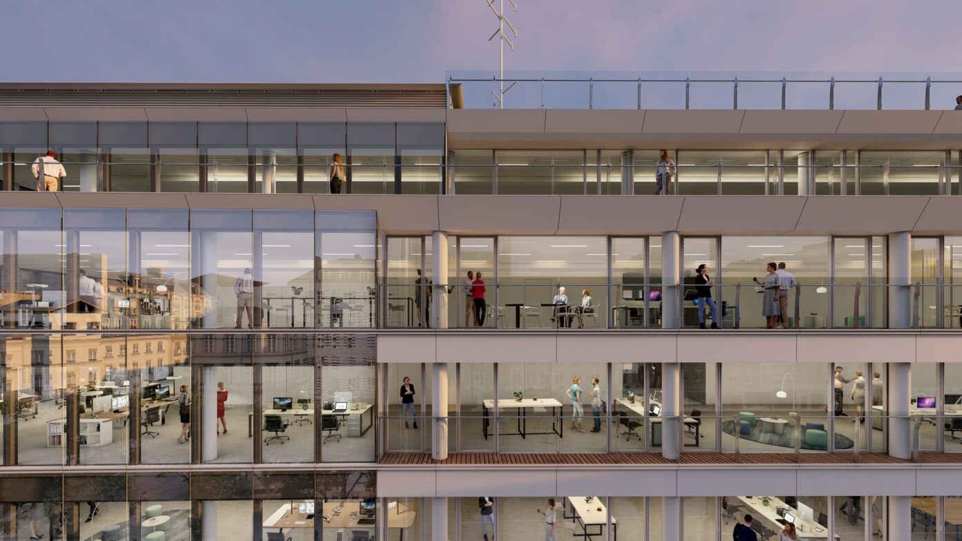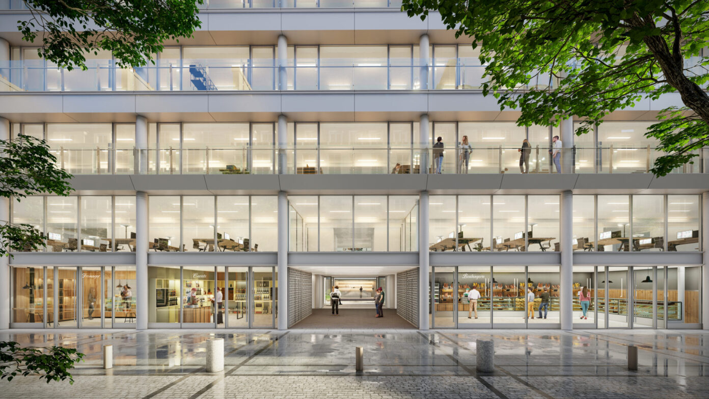 Dans les espaces de bureaux, l’optimisation des flux – avec l’aménagement de nouvelles circulations verticales et de passerelles à tous les étages –, permet de densifier et d’améliorer la flexibilité potentielle des plateaux, tant par ailes que par étage, pour répondre à des scénarios mono ou multipreneur. Les évolutions des usages au travail, avec une place croissante accordée à la collaboration et au bien-être des collaborateurs, se traduisent par l’ajout d’espaces de convivialité, de services premium et d’espaces hybrides de collaboration. La création de balcons filants sur la partie centrale des façades latérales et de deux terrasses en rooftop offre des espaces extérieurs agréables et accessibles pour un moment de détente ou de travail informel.