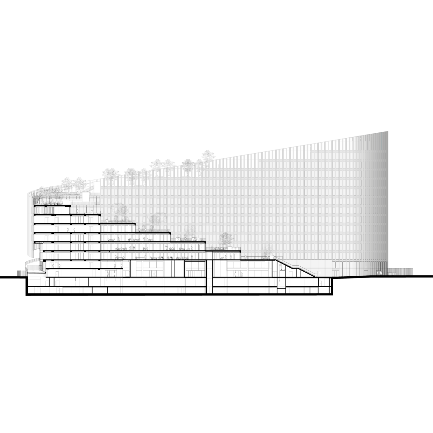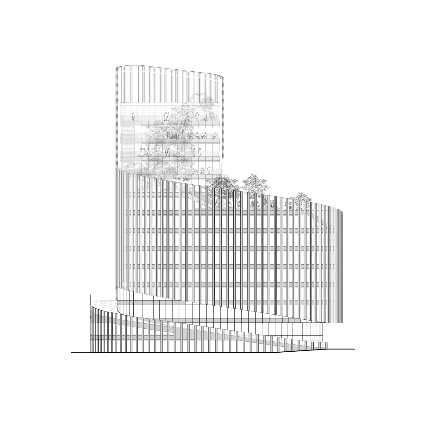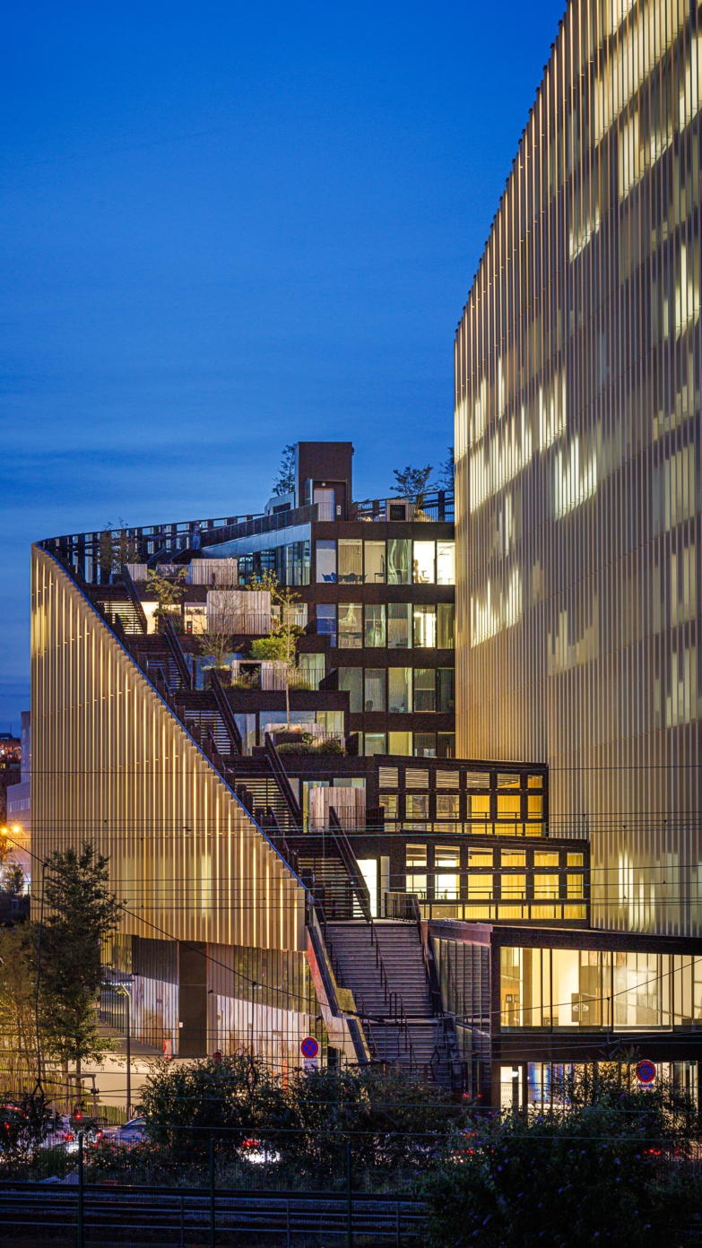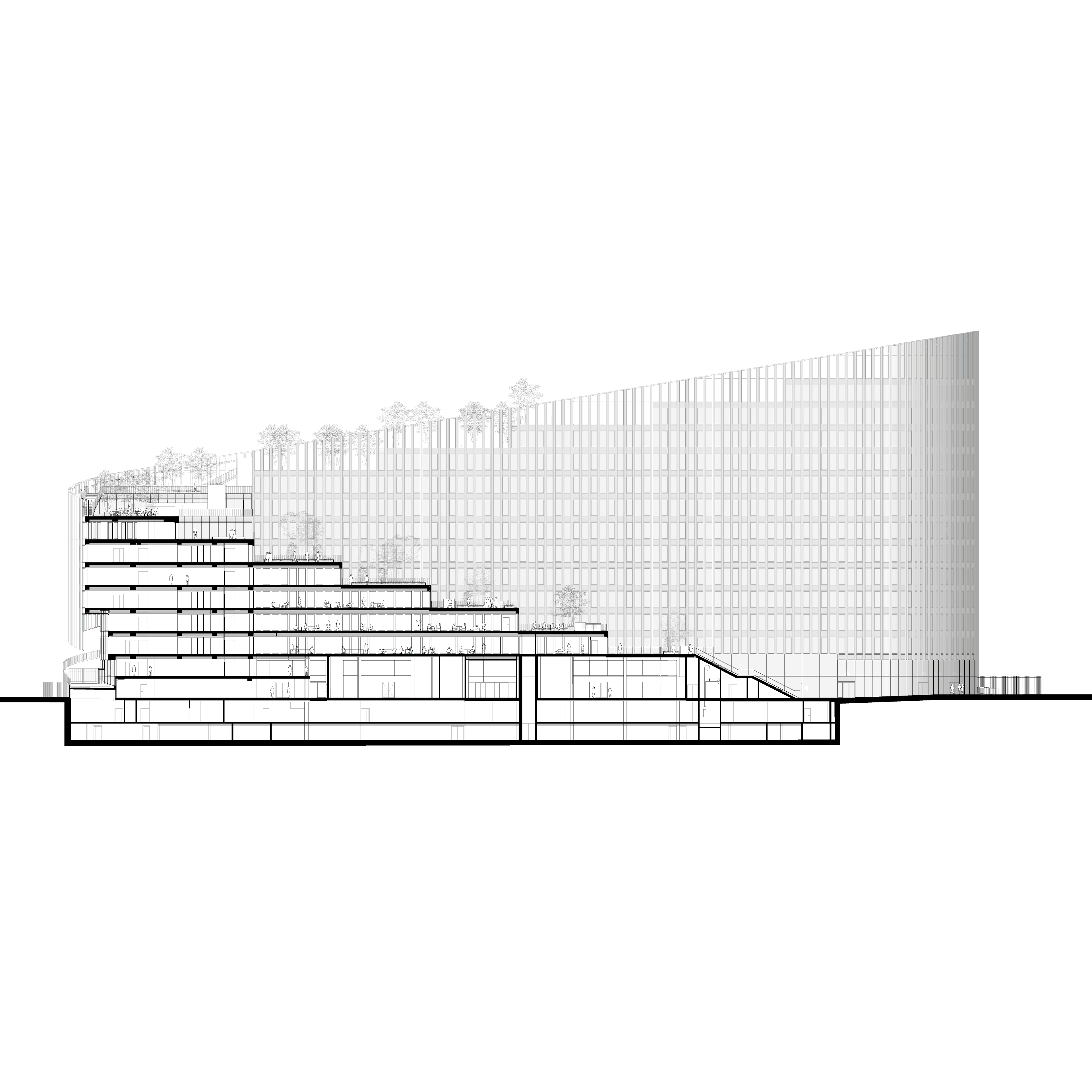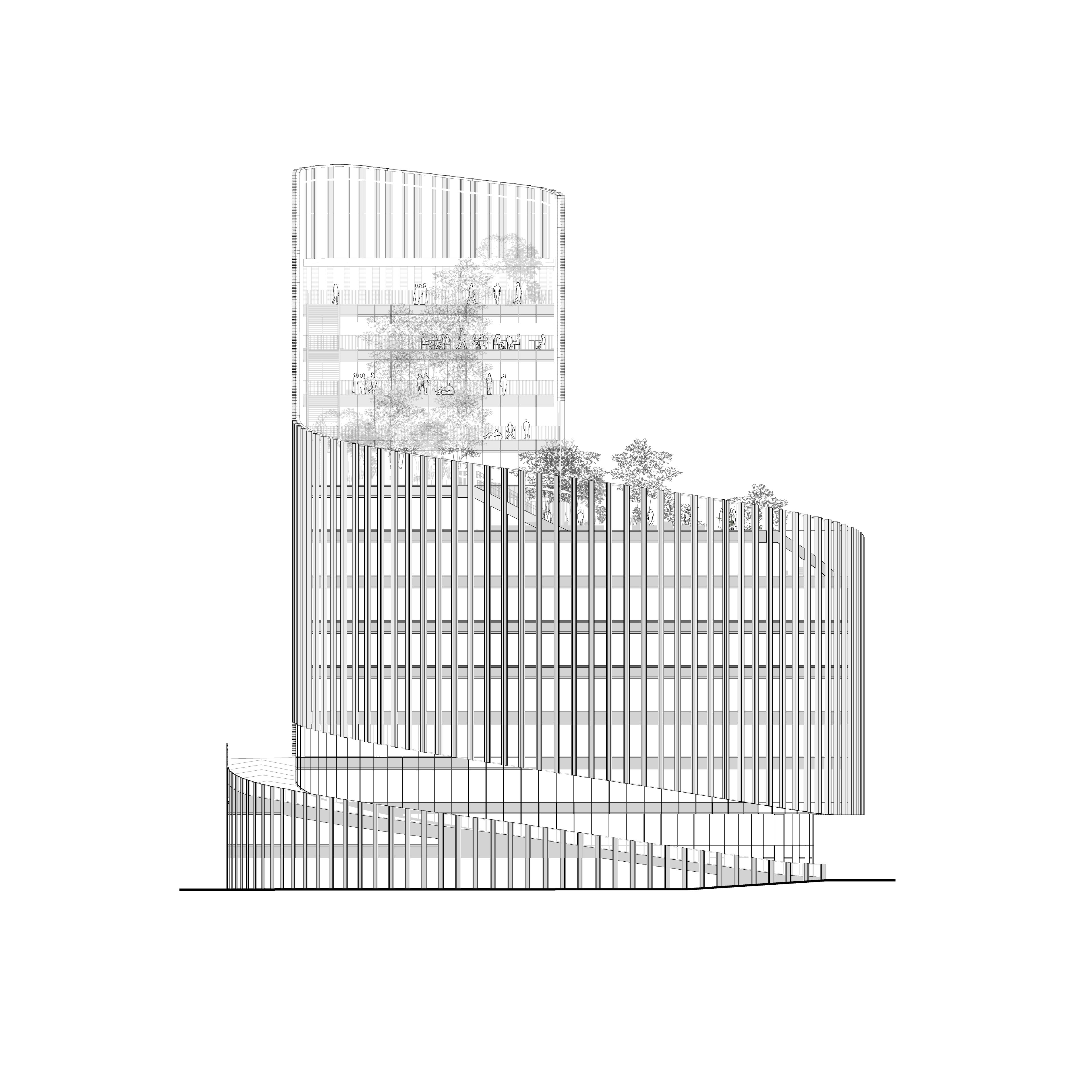 ShAKe a été modelé par son contexte, la proposition d’un bâtiment-promenade en spirale s’avérant optimale pour répondre aux enjeux du site et à l’ambition programmatique. L’élancement de la façade sud place le bâtiment en proue du quartier, alors que le côté opposé déroule une frontalité plus douce vers le parc des Dondaines. De là, une spirale s’élève en volées de terrasses arborées jusqu’à un belvédère. Cette silhouette assure des performances énergétiques optimales et un confort remarquable aux usagers. Le bâtiment participe à la création d’un îlot de fraîcheur dans le quartier, ses arbres régulant la pollution atmosphérique et favorisant la biodiversité, tandis que les terrasses assurent une protection vis-à-vis des nuisances sonores du périphérique. Elles proposent une importante variété d’usages, rattachées au service des programmes ou totalement ouvertes au public. Les espaces de bureaux, de coworking et l’incubateur peuvent y travailler dehors, y organiser des réunions informelles, des déjeuners ou événements ; la crèche offrira aux enfants un espace à l’air libre sécurisé ; les programmes sportifs y proposeront des activités de plein air. Corridor écologique invitant le Parc des Dondaines à l’intérieur du bâtiment, la promenade ascendante assure une continuité entre nature et bâti.