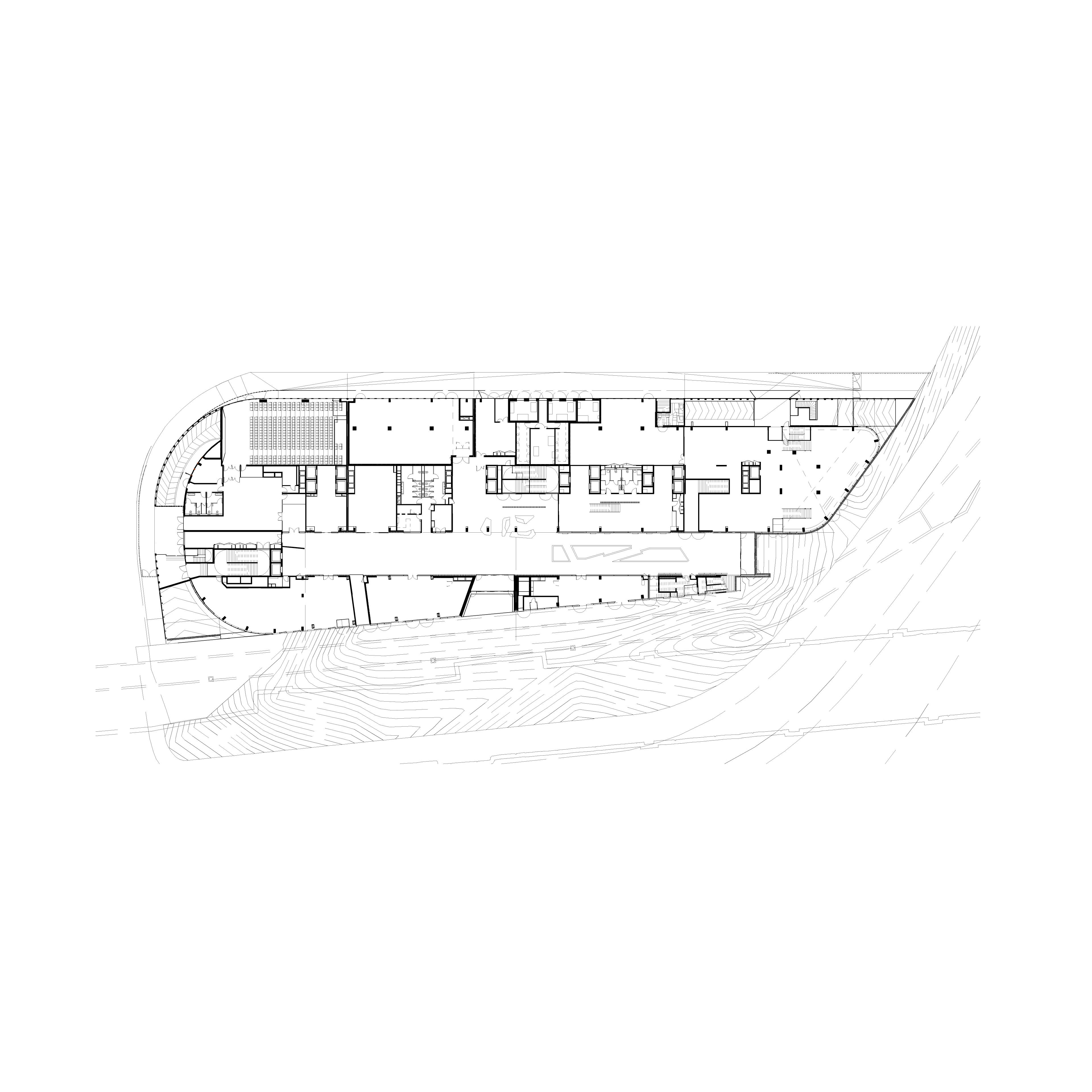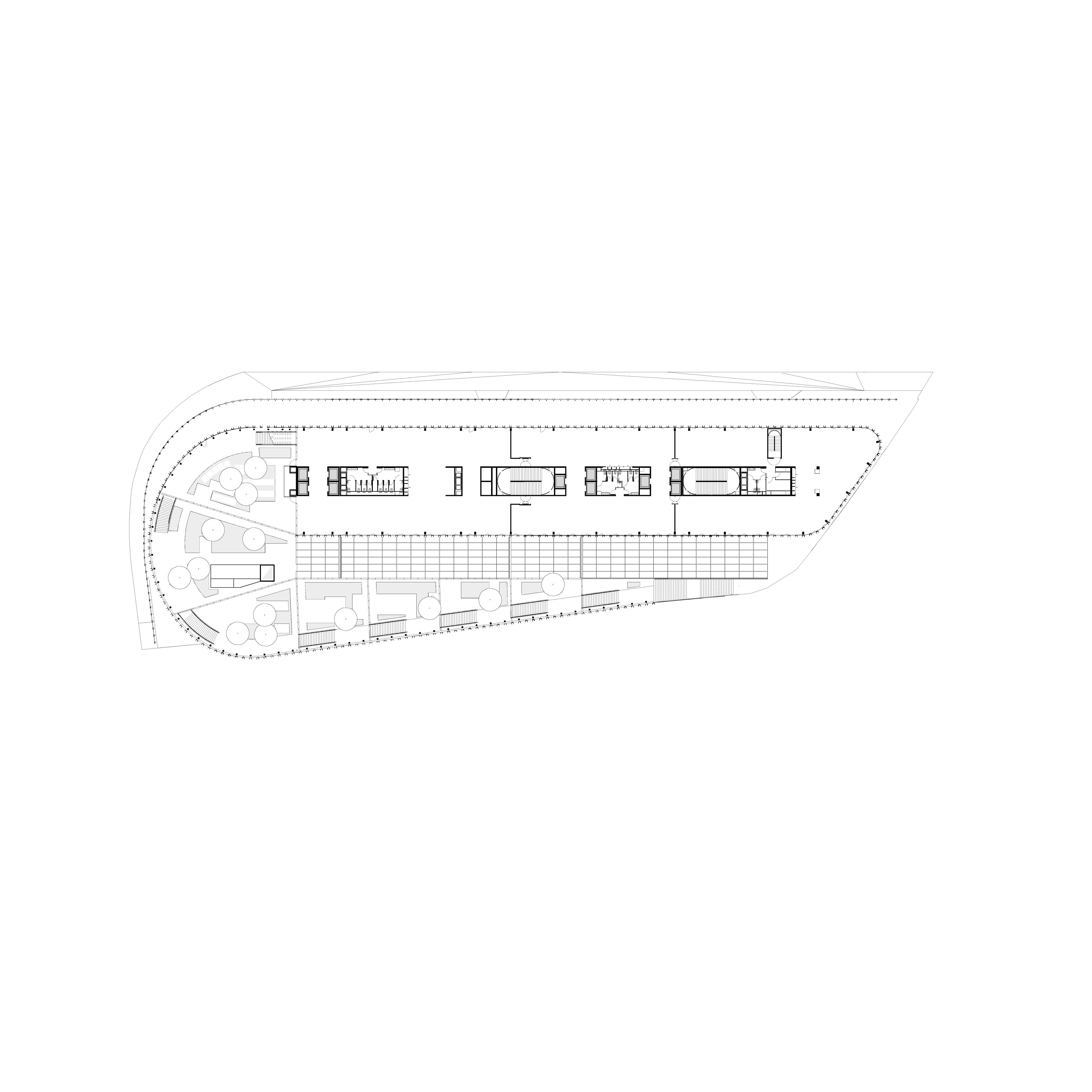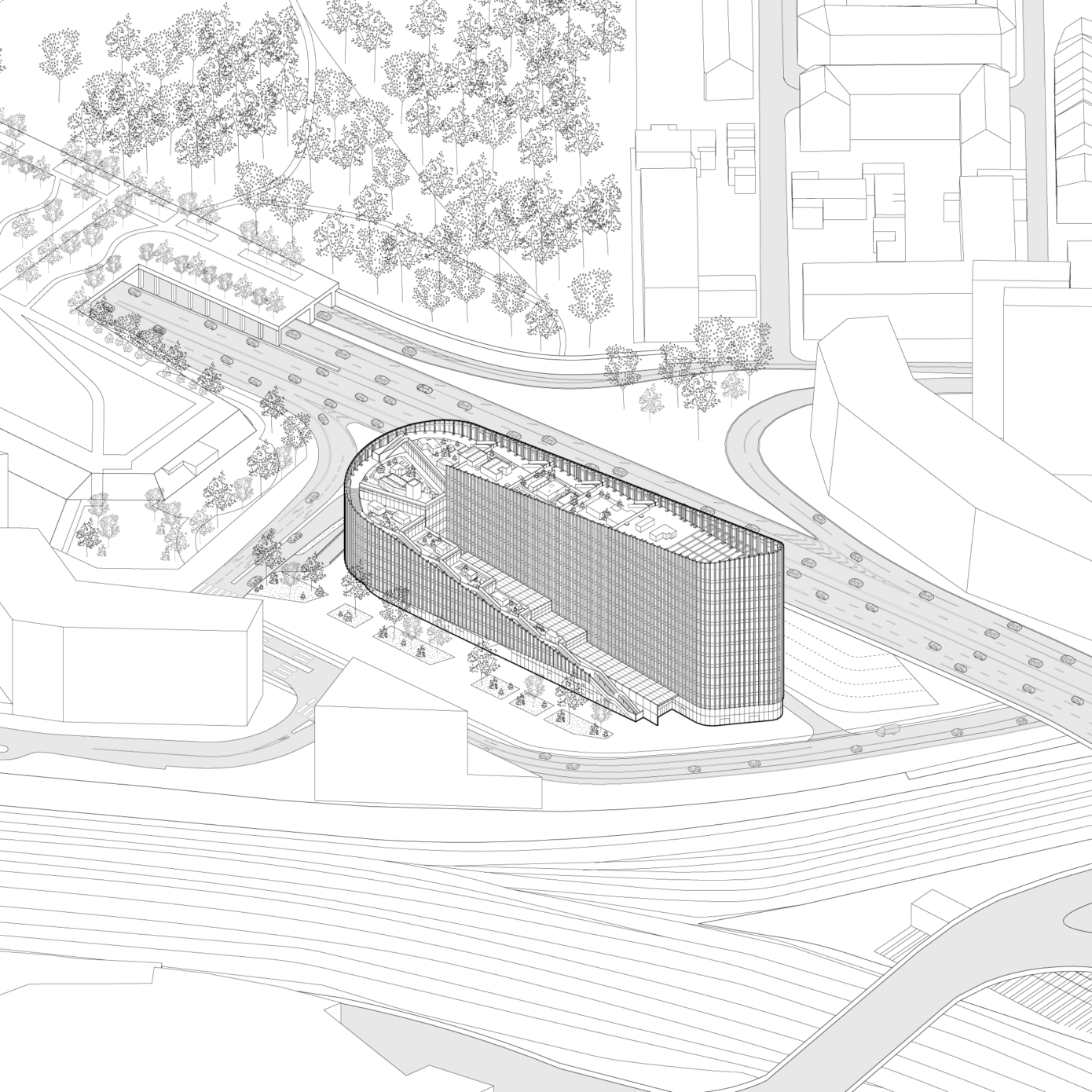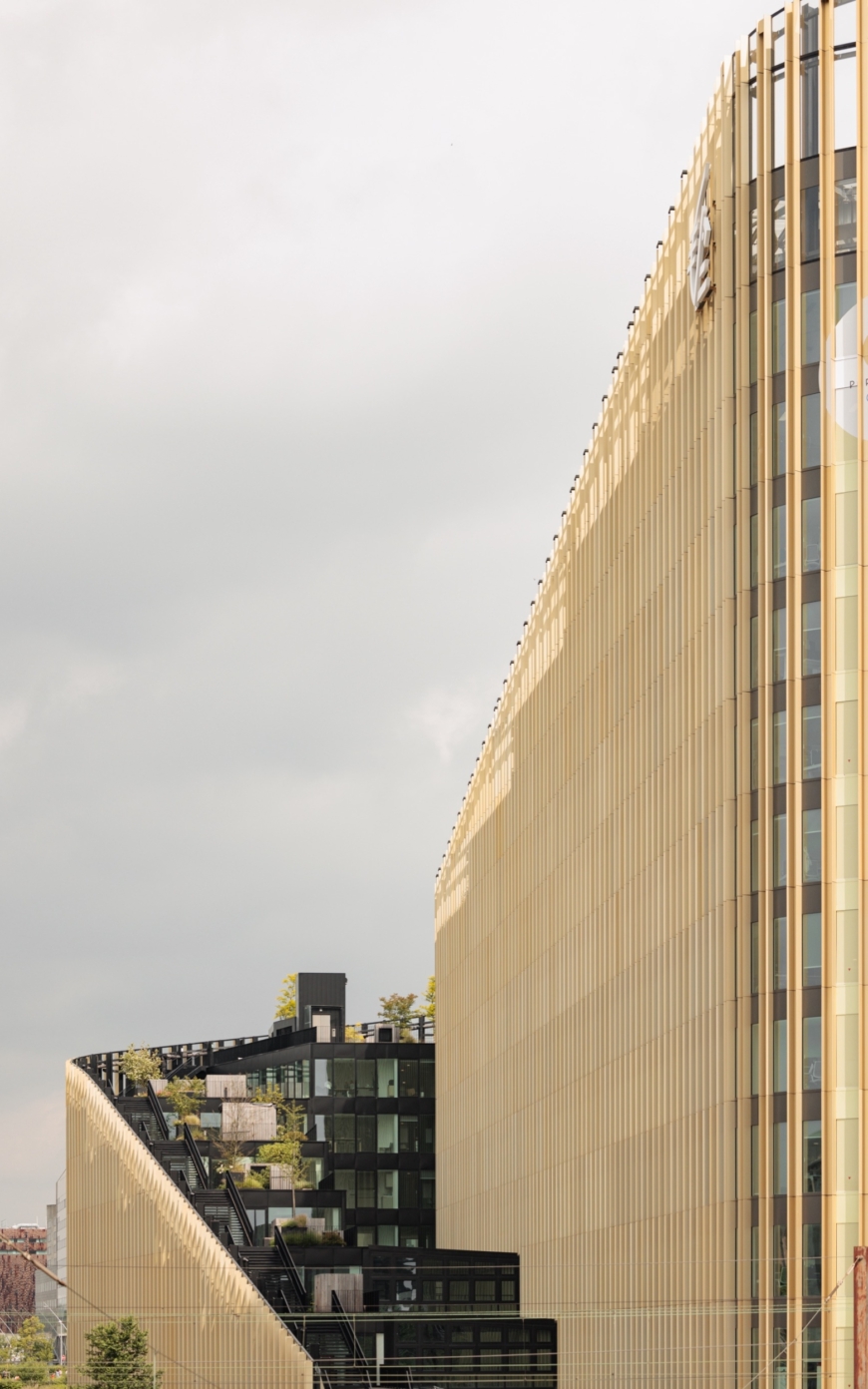ShAKe a été modelé par son contexte, la proposition d’un bâtiment-promenade en spirale s’avérant optimale pour répondre aux enjeux du site et à l’ambition programmatique. L’élancement de la façade sud place le bâtiment en proue du quartier, alors que le côté opposé déroule une frontalité plus douce vers le parc des Dondaines. De là, une spirale s’élève en volées de terrasses arborées jusqu’à un belvédère. Cette silhouette assure des performances énergétiques optimales et un confort remarquable aux usagers. Le bâtiment participe à la création d’un îlot de fraîcheur dans le quartier, ses arbres régulant la pollution atmosphérique et favorisant la biodiversité, tandis que les terrasses assurent une protection vis-à-vis des nuisances sonores du périphérique. Elles proposent une importante variété d’usages, rattachées au service des programmes ou totalement ouvertes au public. Les espaces de bureaux, de coworking et l’incubateur peuvent y travailler dehors, y organiser des réunions informelles, des déjeuners ou événements ; la crèche offrira aux enfants un espace à l’air libre sécurisé ; les programmes sportifs y proposeront des activités de plein air. Corridor écologique invitant le Parc des Dondaines à l’intérieur du bâtiment, la promenade ascendante assure une continuité entre nature et bâti.