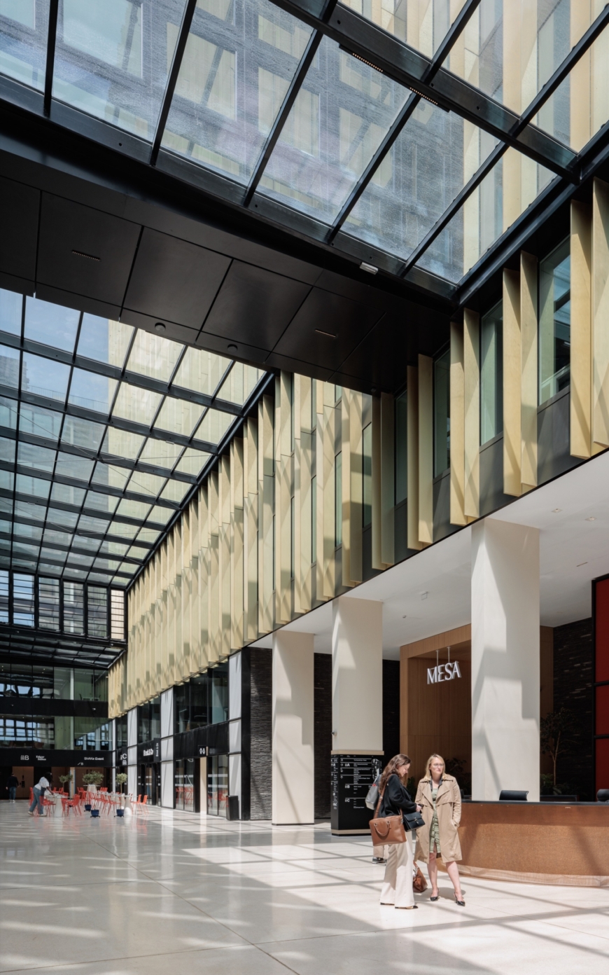ShAKe devient un hub de vie 24H/24 où travailler, manger, séjourner, s’amuser, se cultiver. Il propose ses nombreux services aux occupants mais également à ses voisins et à la ville, notamment la crèche, les espaces sportifs, un auditorium avec son business center, un parking mutualisé avec le quartier, un food court, un restaurant ou des potagers sur les toitures. Améliorer la qualité de vie des usagers se conjugue ici avec l’idée de devenir un lieu de vie et de rencontres pour le quartier, auquel le bâtiment est relié par un parvis animé d’une pente douce. Il est prolongé par son pendant à l’intérieur du bâtiment, « la place du village », lieu de passage mais aussi d’attente ou de repos, qui distribue l’ensemble des fonctions du bâtiment et constitue le point nodal de son activité.