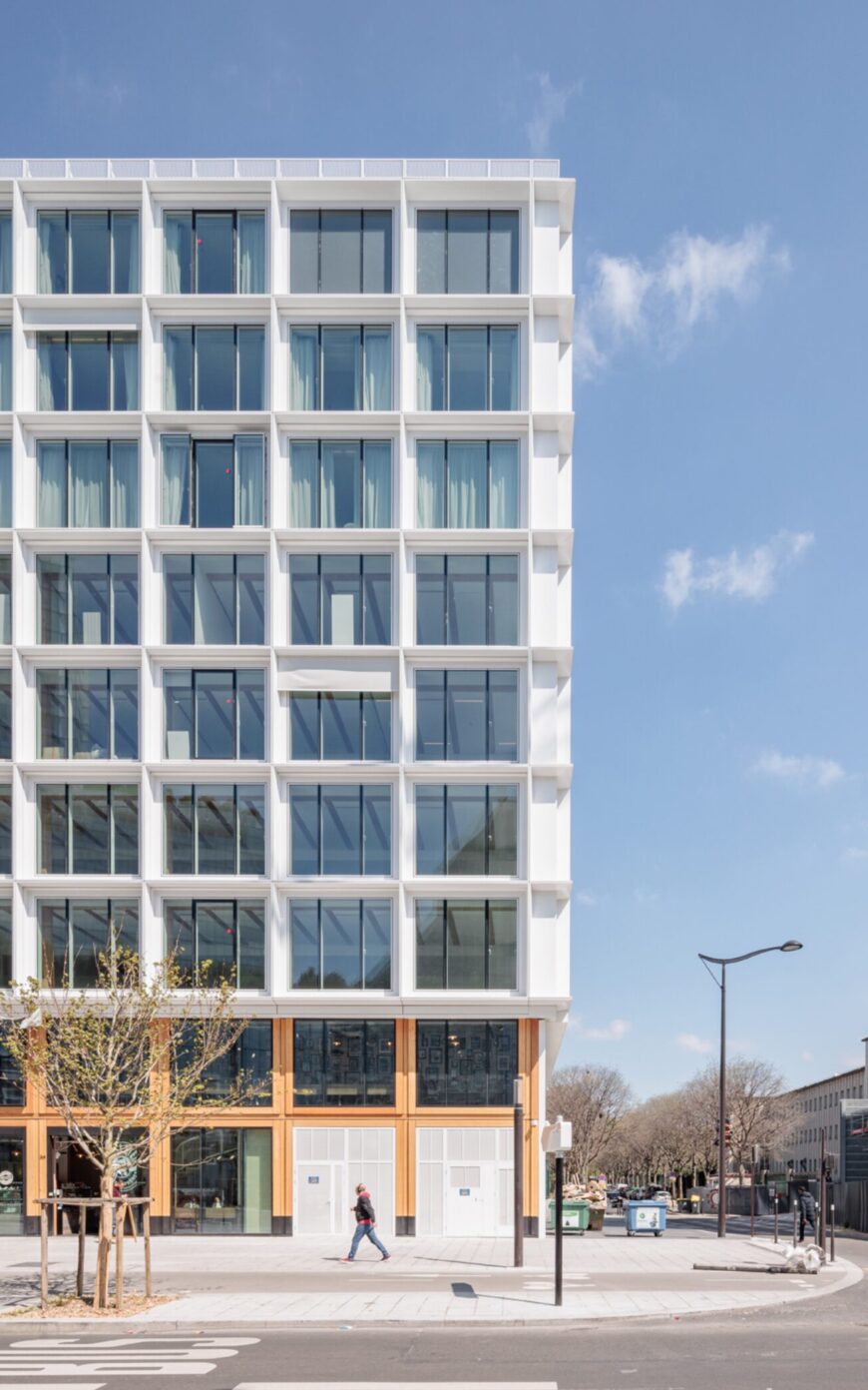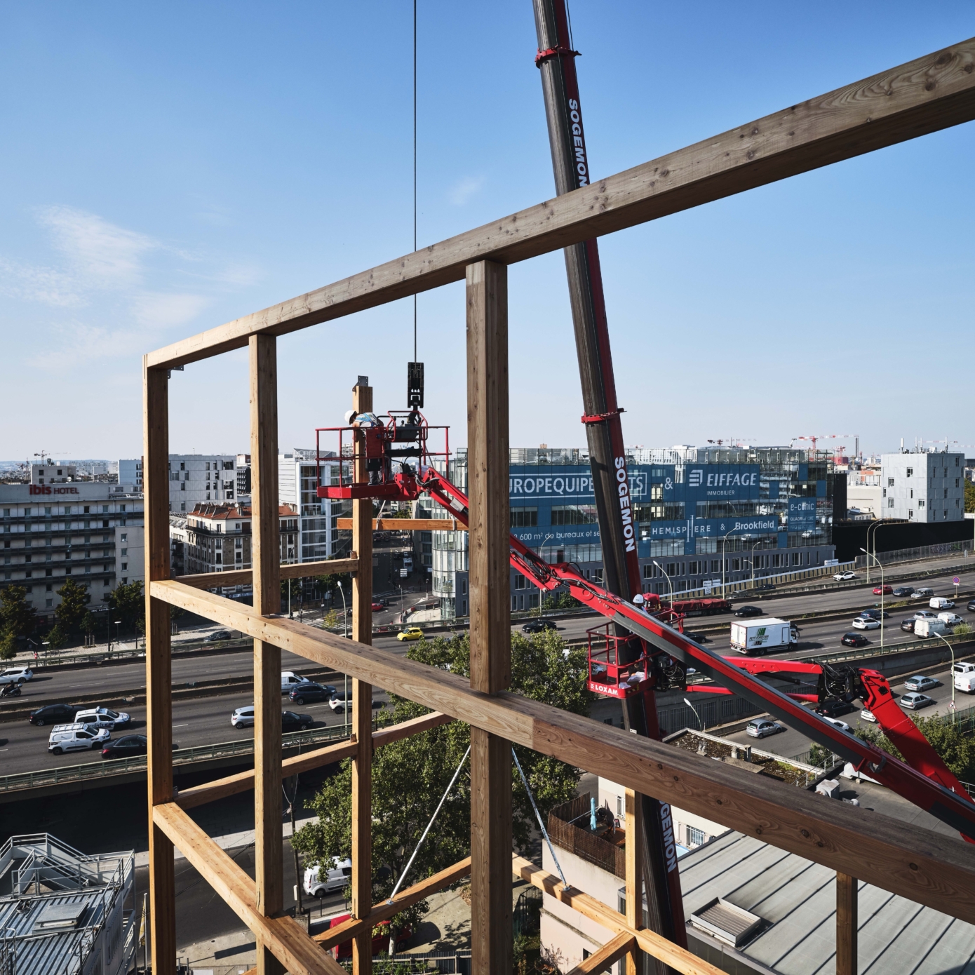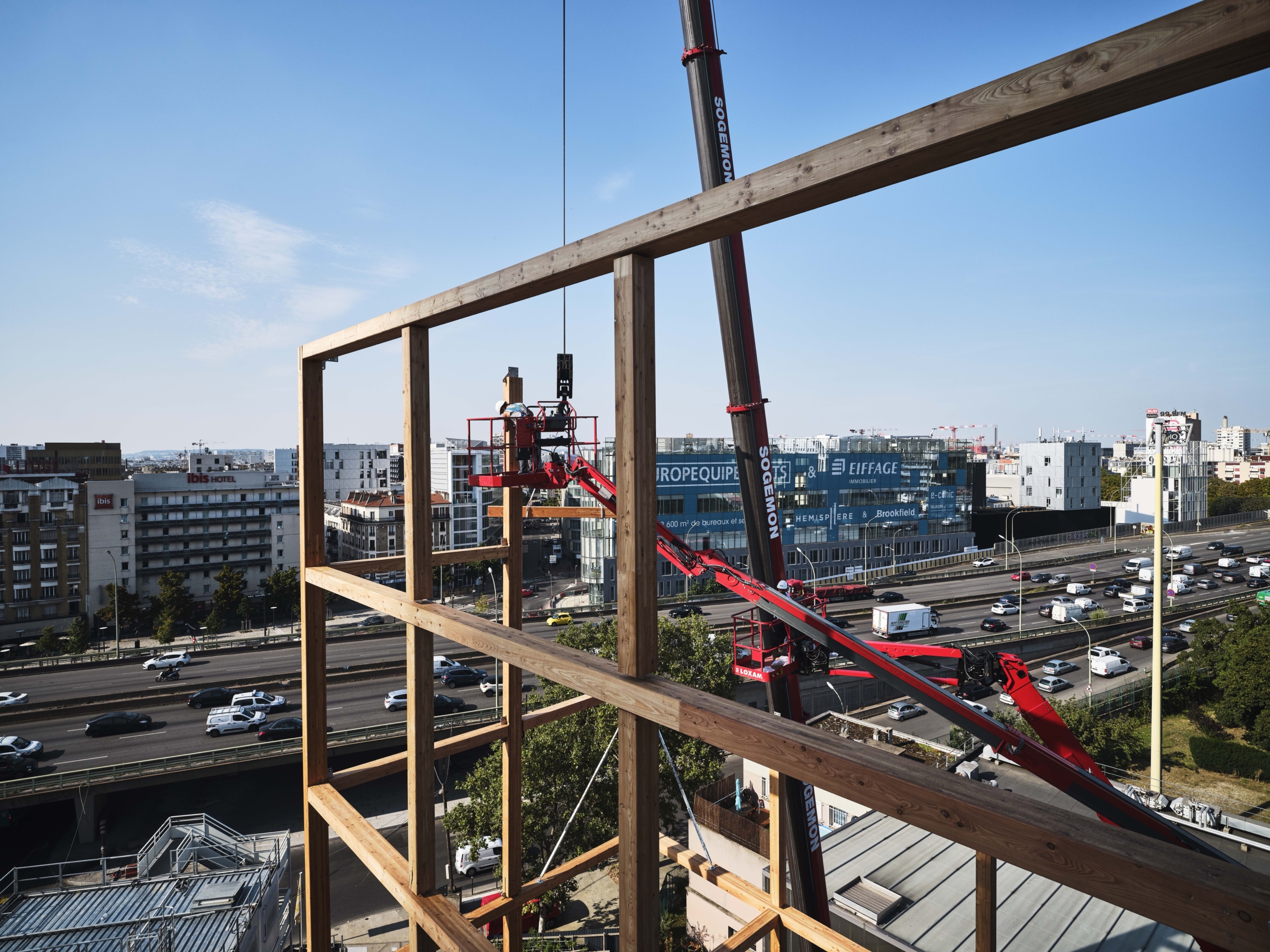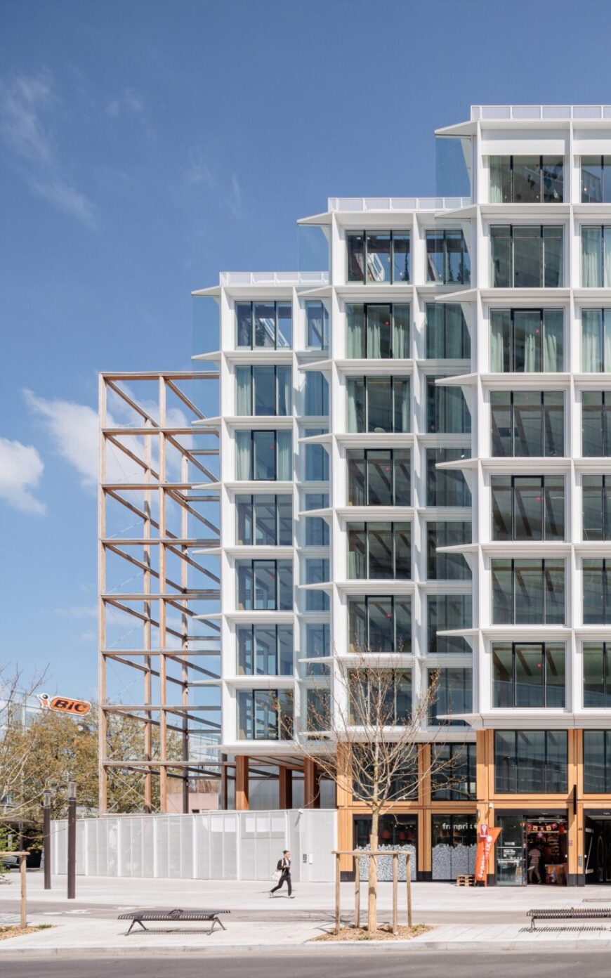 Matériau encore expérimental à cette échelle, le bois est volontairement visible à tous les étages, tandis que son élégante ossature se prolonge en pointe du bâtiment par un exosquelette qui donne un mouvement à l’immeuble et met en valeur sa structure.