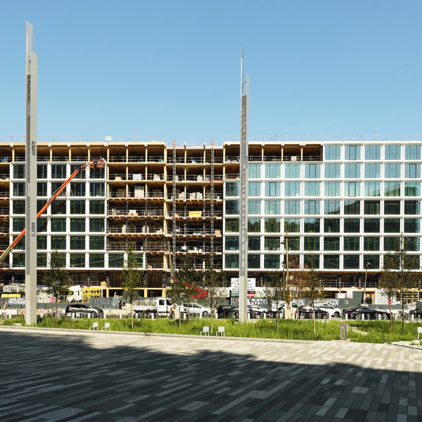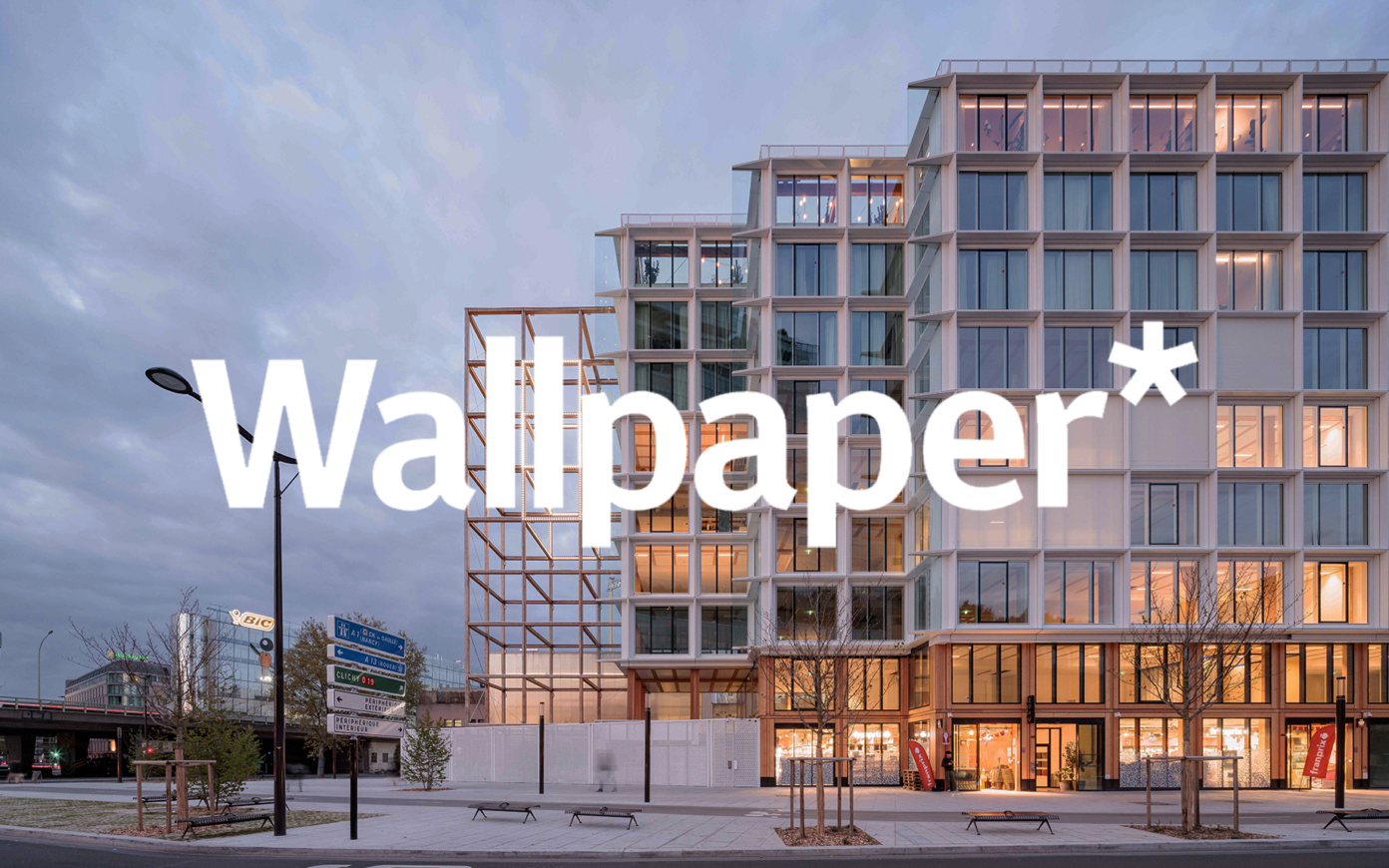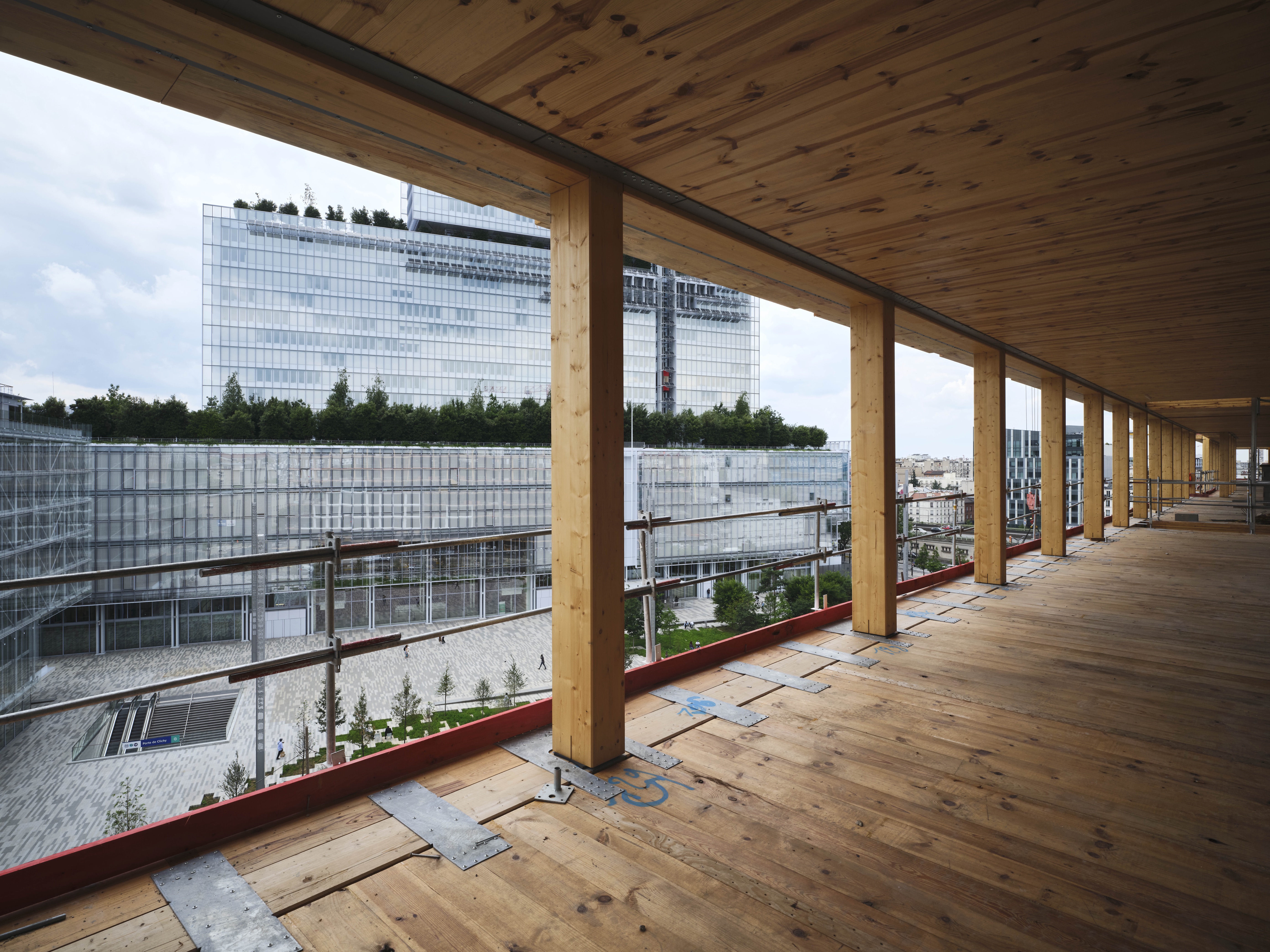 Matériau encore expérimental à cette échelle, le bois est volontairement visible à tous les étages, tandis que son élégante ossature se prolonge en pointe du bâtiment par un exosquelette qui donne un mouvement à l’immeuble et met en valeur sa structure.