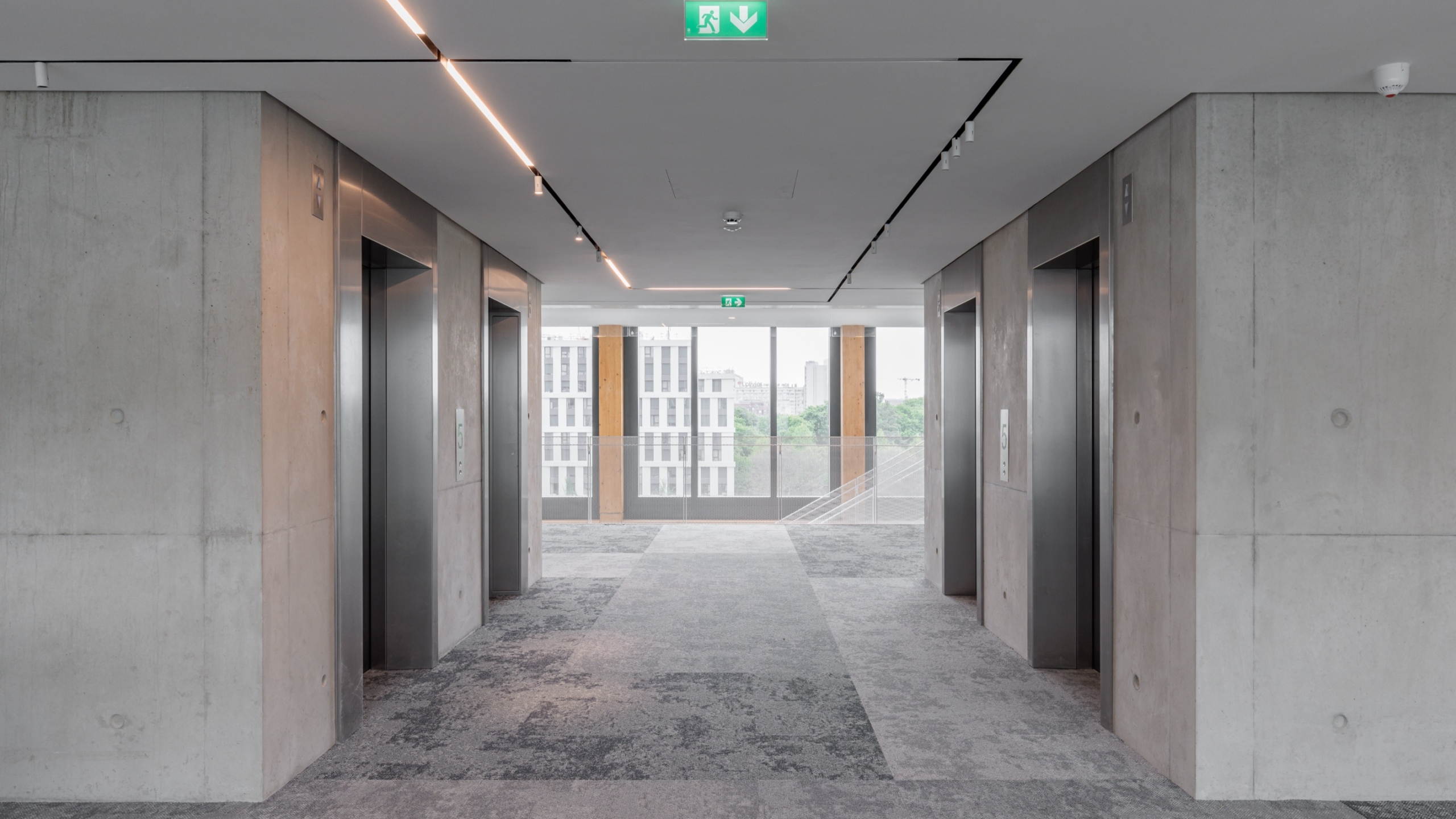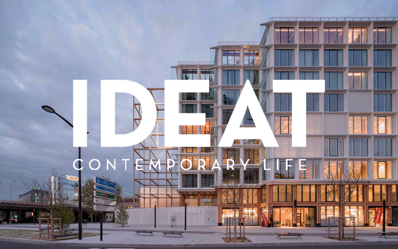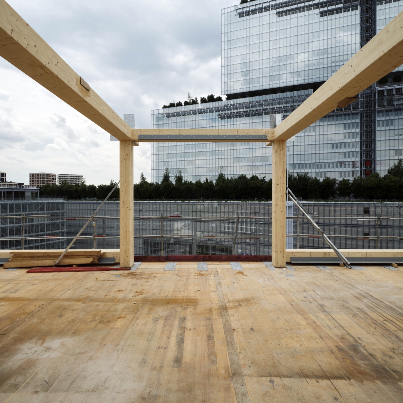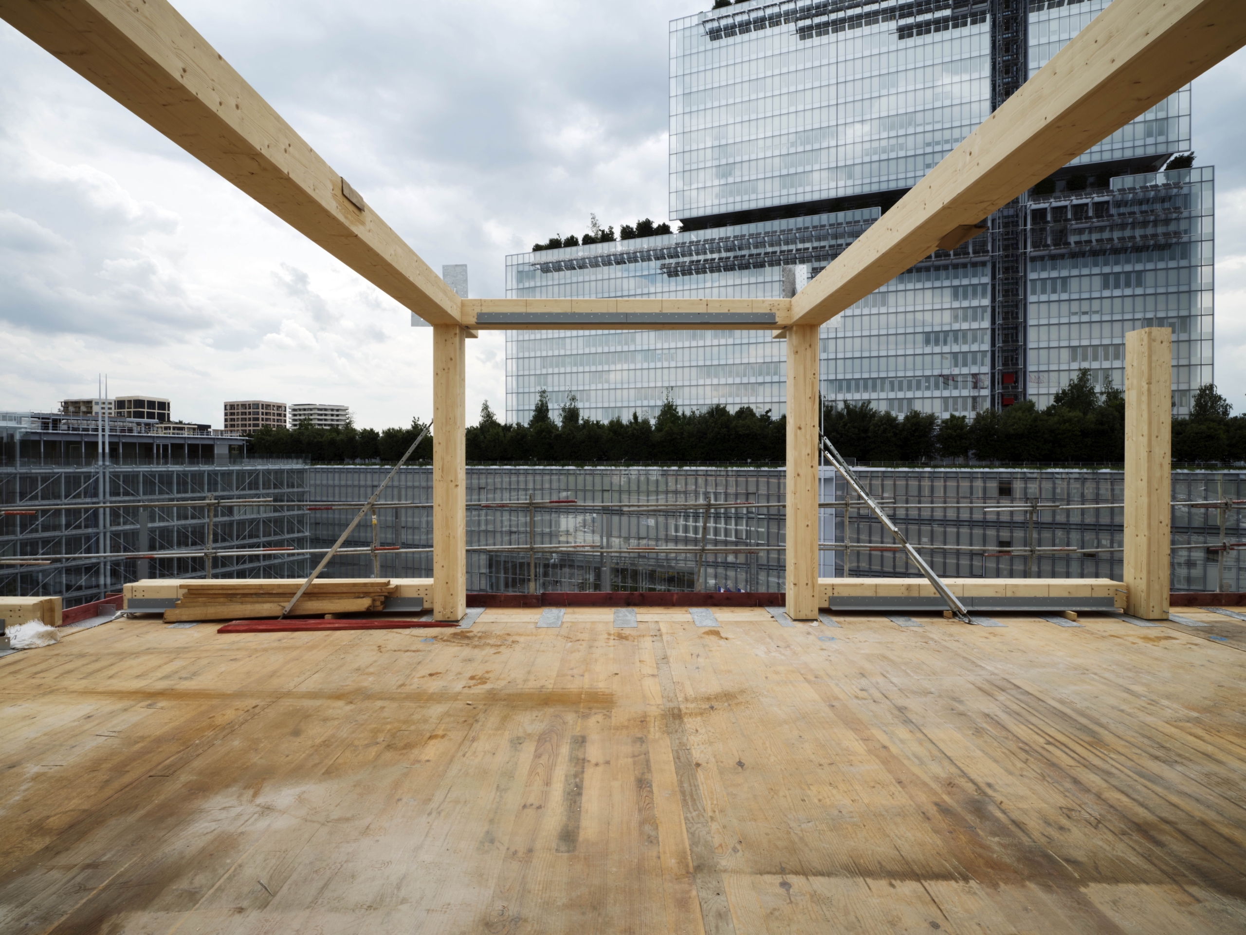 Matériau encore expérimental à cette échelle, le bois est volontairement visible à tous les étages, tandis que son élégante ossature se prolonge en pointe du bâtiment par un exosquelette qui donne un mouvement à l’immeuble et met en valeur sa structure.