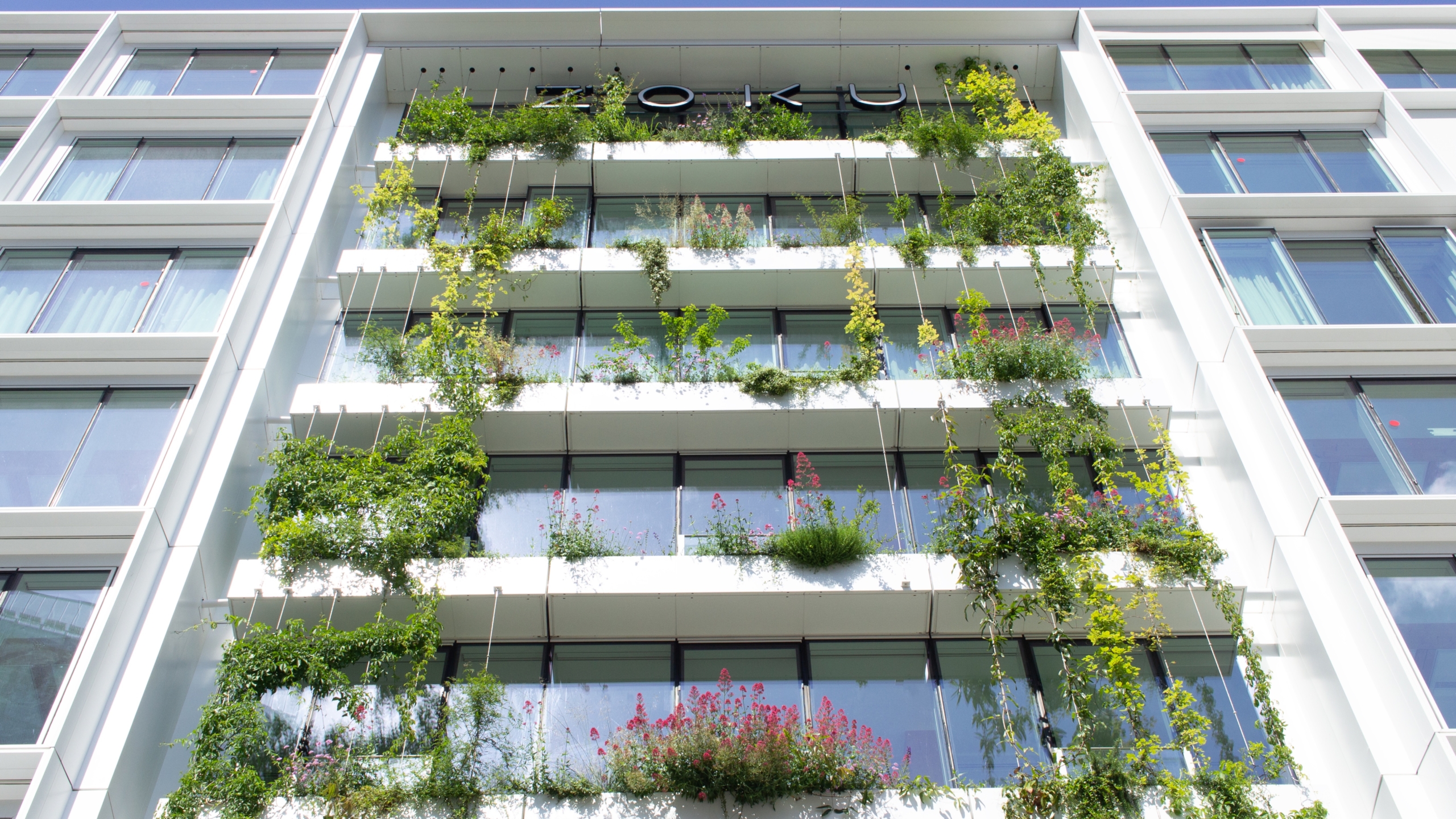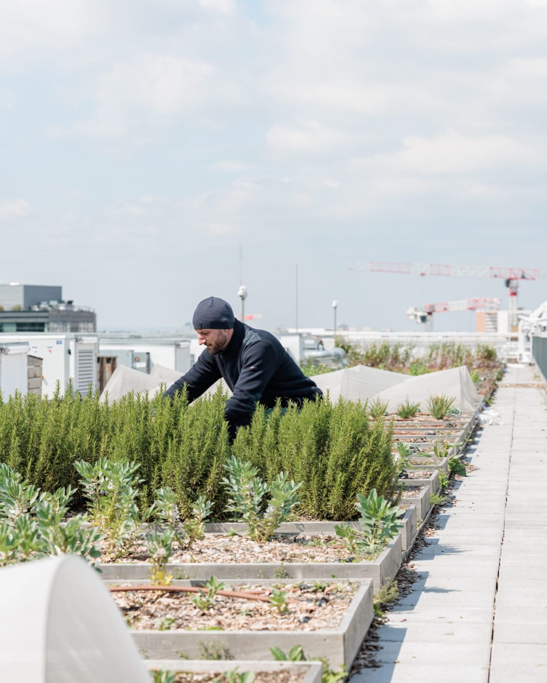 La toiture productrice a ainsi été conçue avec la start-up Topager selon le principe de l’agrivoltaïsme : près de 400 m2 de panneaux photovoltaïques combinés à plus de 300 m2 d’agriculture urbaine, sans intrants chimiques et productive hiver comme été, en fonction des échanges entre le maraîcher et les chefs des restaurants de l’immeuble. Ce potager permet de lutter contre les effets d’îlot de chaleur et d’absorber les eaux pluviales ; en lien avec la faille végétale en façade sud et la façade houblonnée au sud-est, il crée un couloir de biodiversité. L’houblonnière offre une protection thermique passive sur la façade sud – laissant passer la lumière en hiver et offrant de l’ombre en été –, tout en alimentant une micro-brasserie en sous-sol. Cette brasserie peut produire 20 000 litres de bière, consommés sur place, au sein des bars et restaurants de l’immeuble, dans une logique de circuit court, à l’instar des légumes et aromates du potager. En lien avec la brasserie, un composteur recycle les drêches de houblon et les déchets organiques du bâtiment, notamment des restaurants, alimentant en retour les cultures du toit.