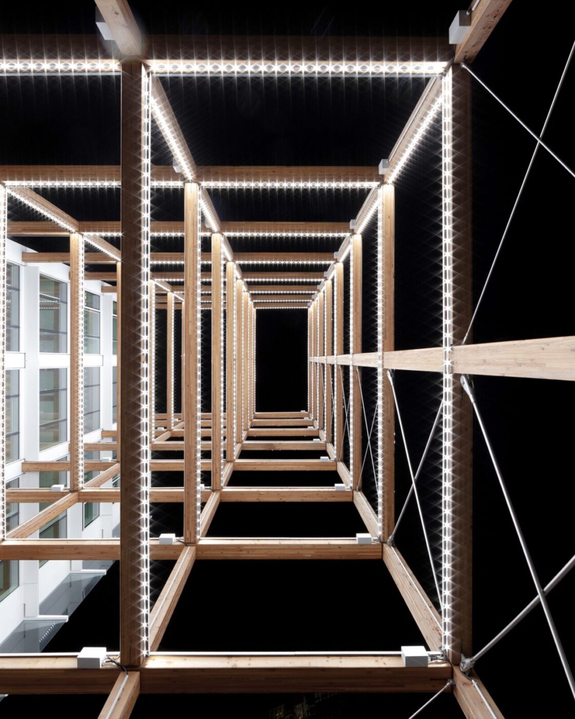 Cette pointe devient un signal esthétique singulier, propre au Stream Building, d’autant plus qu’elle est le support d’une œuvre de l’artiste de Pablo Valbuena. Sélectionné par concours avec Covivio et un comité d’experts, son travail sur la lumière d’inspiration minimaliste répond parfaitement à l’esprit du bâtiment. Au-delà de l’apparat, Modulation, est imbriquée dans le bâtiment et « explore le système modulaire du Stream Building en utilisant le temps et la lumière comme matériau », selon les mots de l’artiste. Utilisant l’énergie produite par les panneaux solaires du bâtiment, des combinaisons géométriques lumineuses apparaissent, se superposent et disparaissent aléatoirement via un algorithme.
