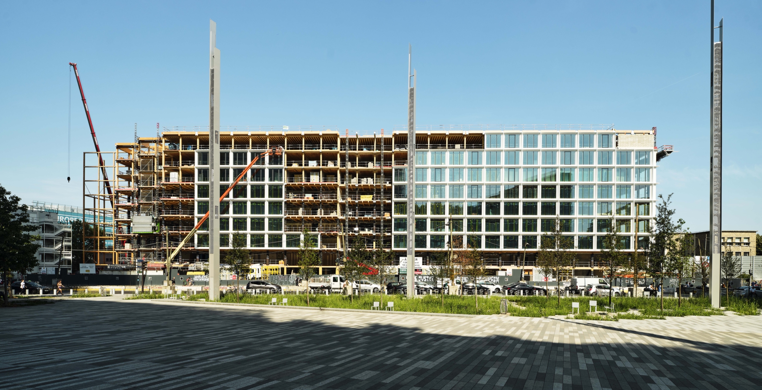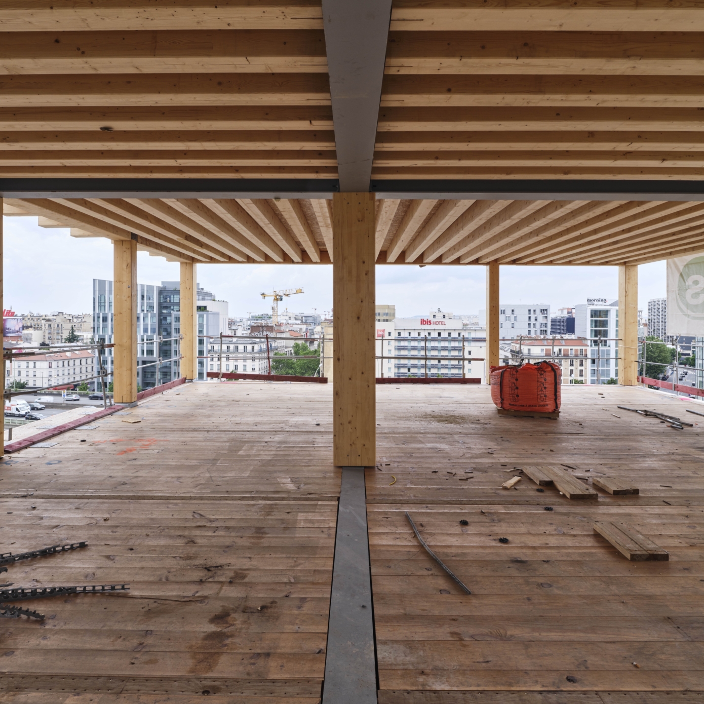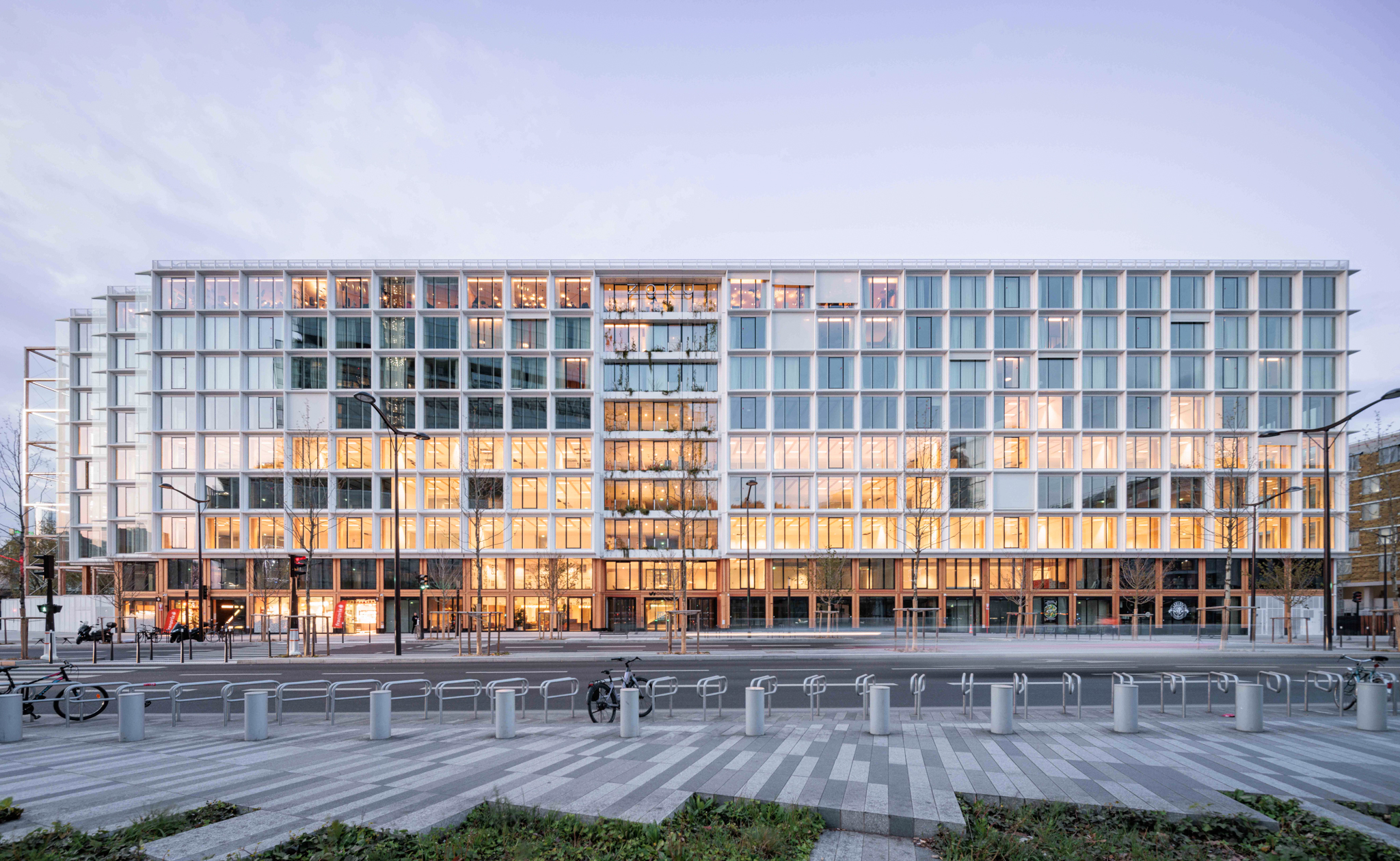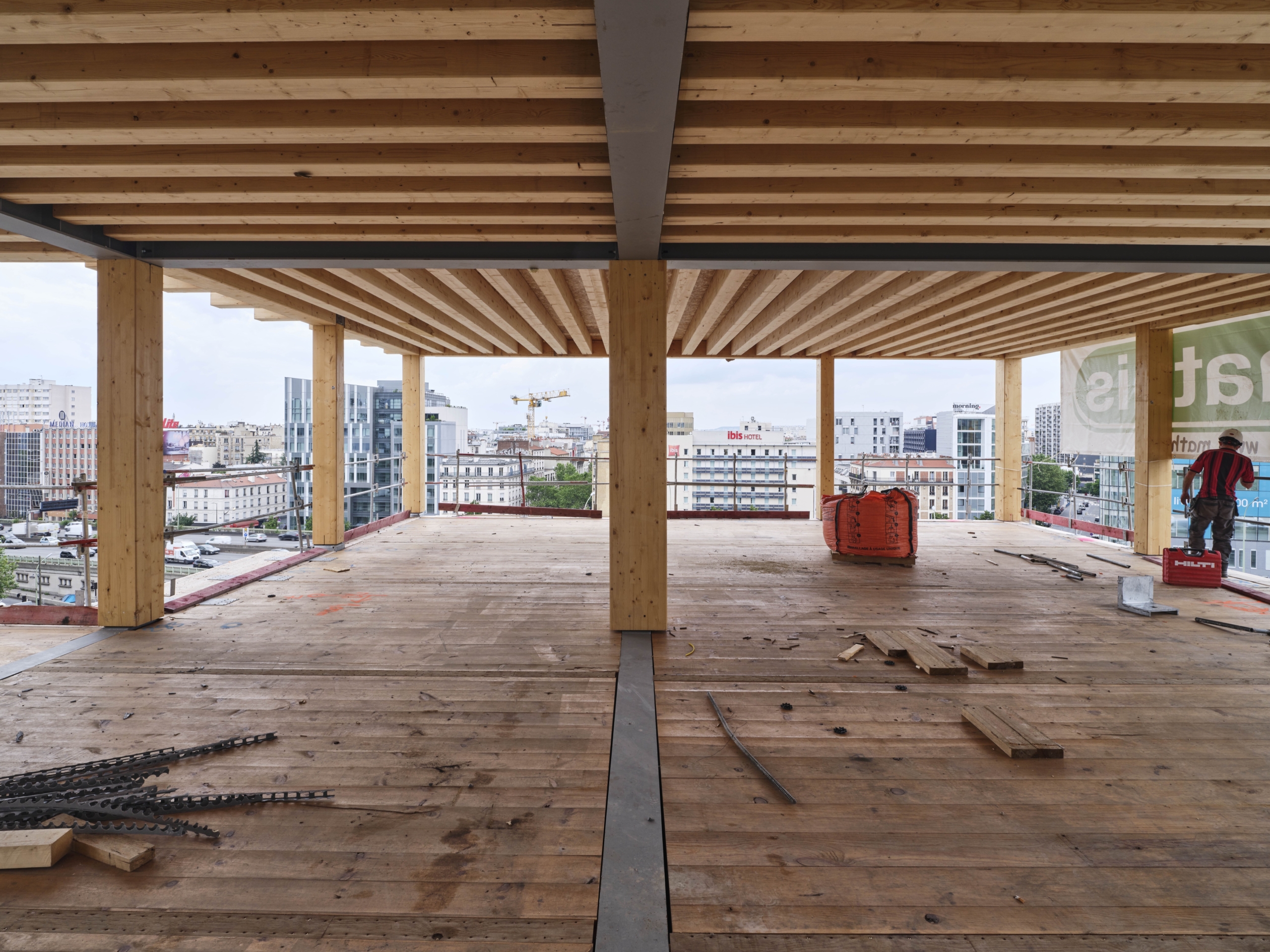 Le Stream Building est également le prototype d’un mode de construction innovant. Sa structure mixte bois-béton vise l’optimisation du bilan carbone. Elle est complétée par un ambitieux dispositif de préfabrication, notamment pour les planchers, les salles de bains et les modules de façade, l’ensemble permettant un chantier rapide aux nuisances limitées. Les défis architecturaux et techniques de ce laboratoire de mixité fonctionnelle, entièrement classé ERP, ont été relevés via l’élaboration d’une trame modulaire favorisant la réversibilité. Les espaces accueillant aujourd’hui du bureau pourront accueillir du logement demain, et inversement, sans engendrer de travaux de structure.