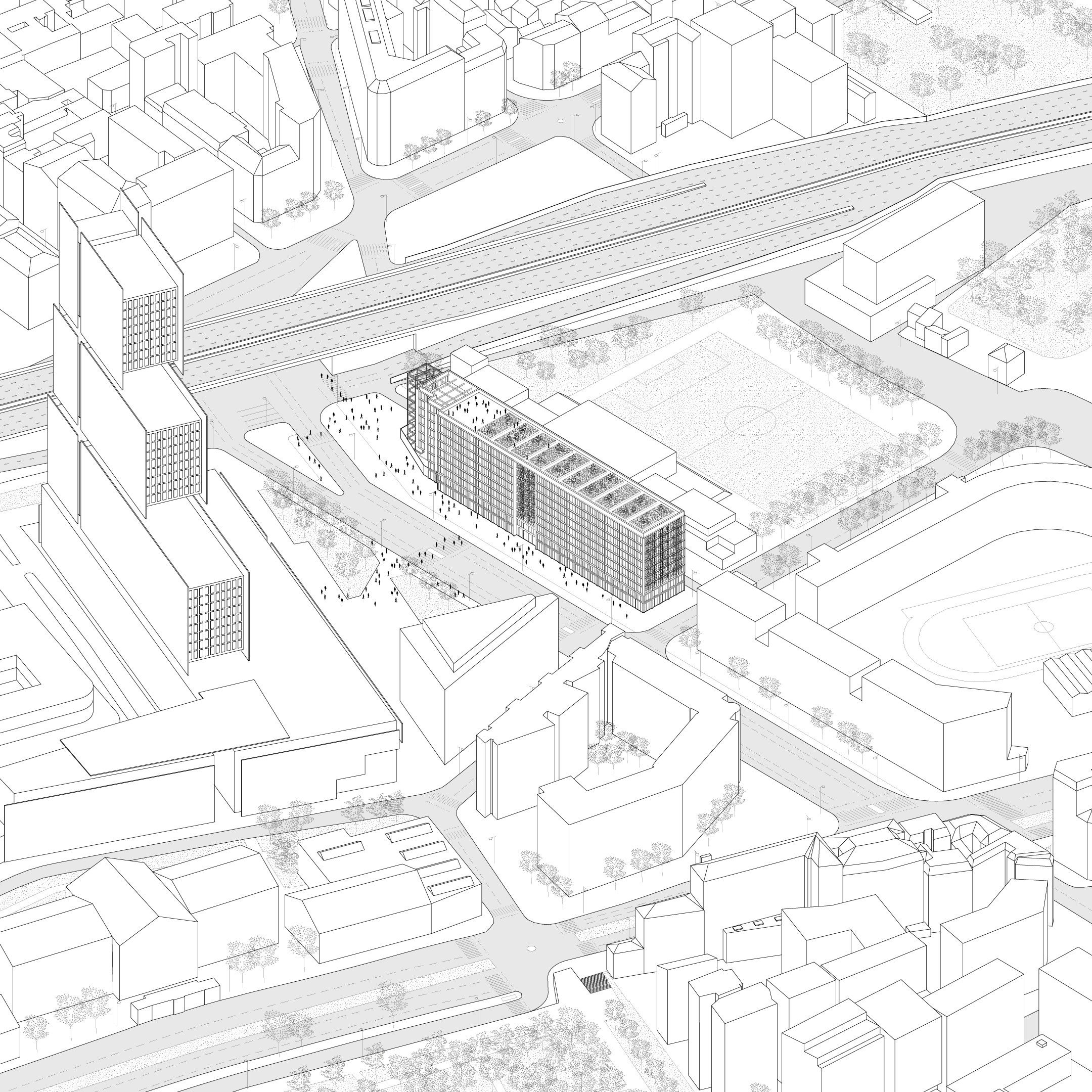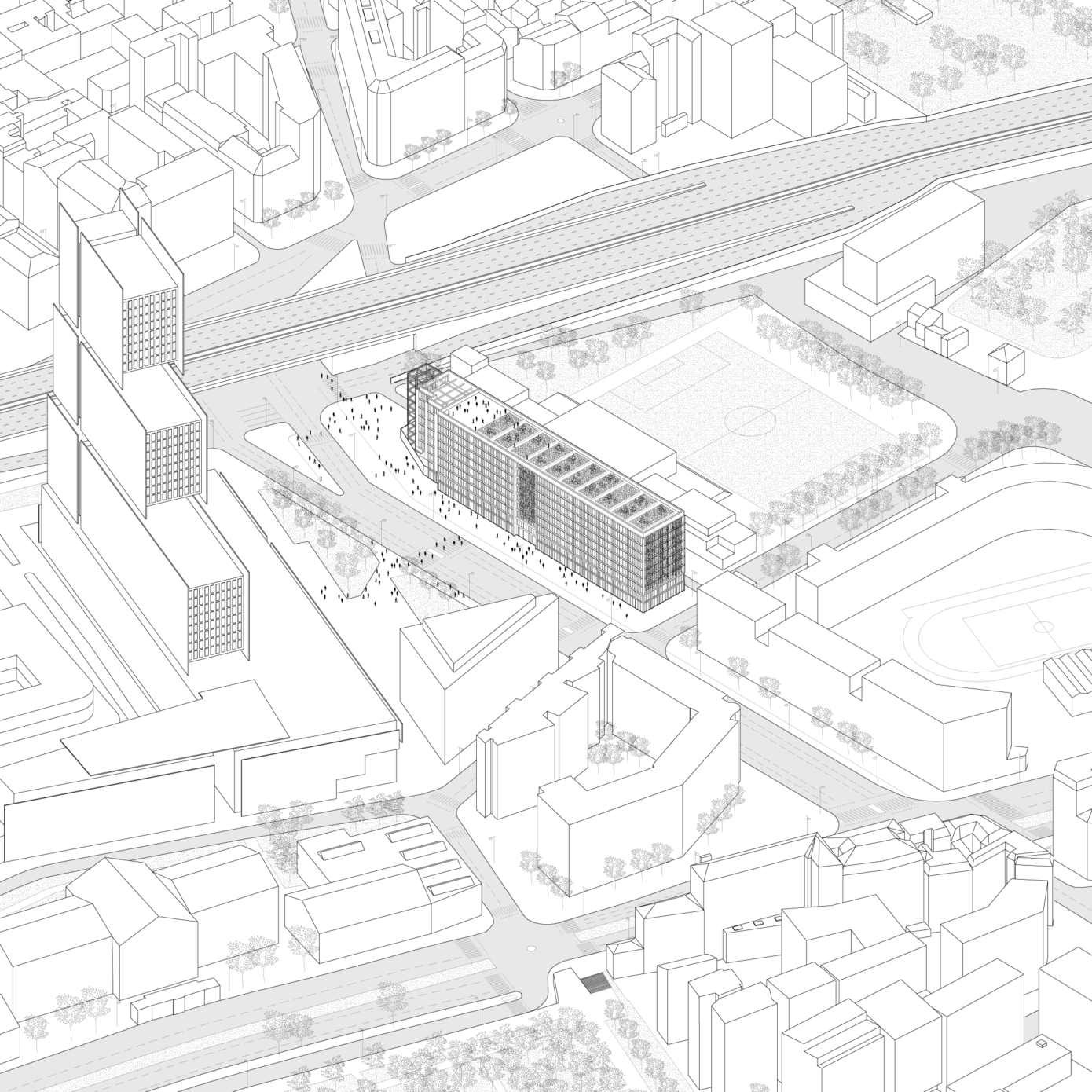 Bâtiment-ressource, le Stream Building réunit dans une même enveloppe toutes les activités d’une vie urbaine mixte et dense, dans l’esprit de la « ville du quart-d’heure ». Il offre un lieu pluriel, hybride et hospitalier, inspiré par les mutations des modes de vie contemporains, mixant services, travail, hôtel et espaces collectifs.
