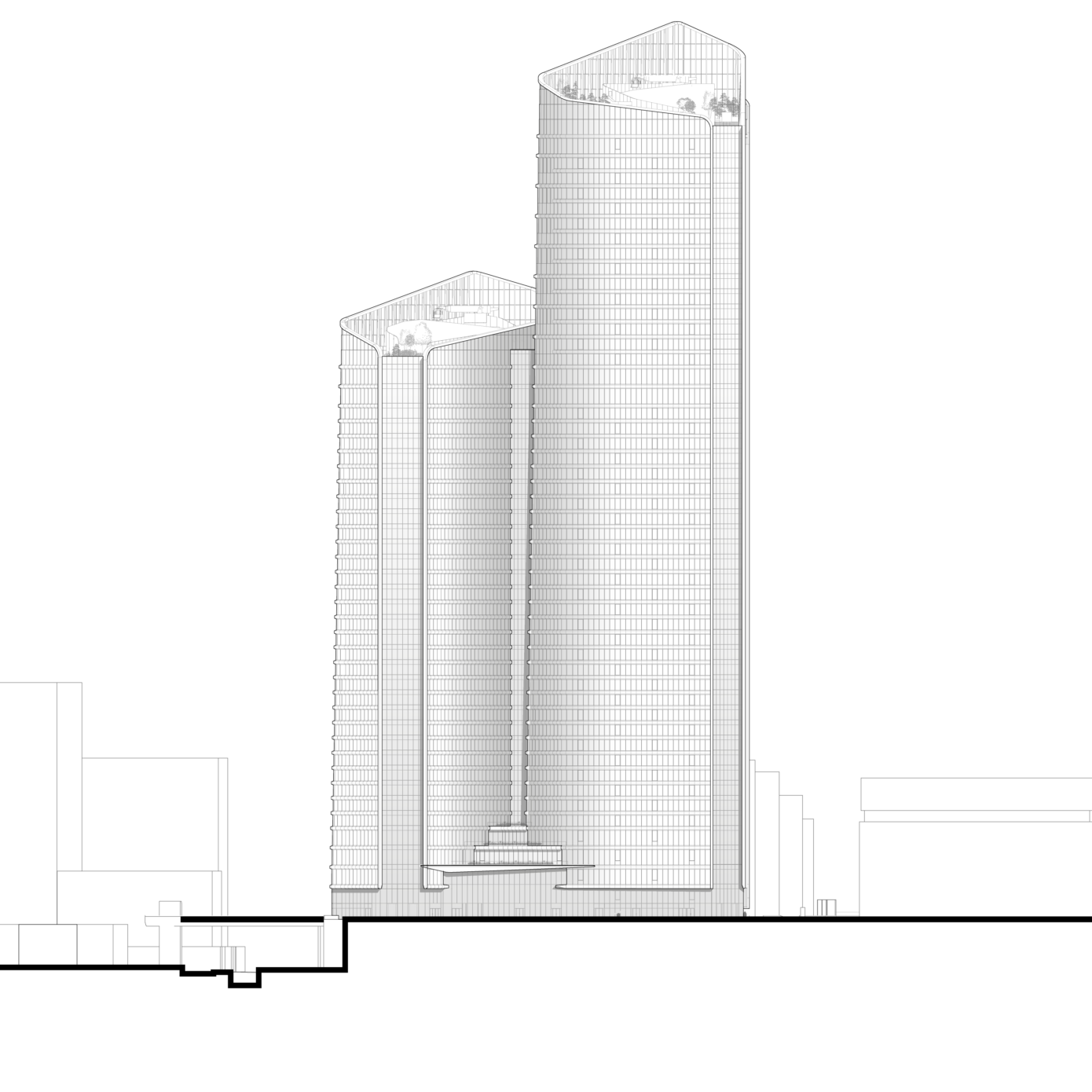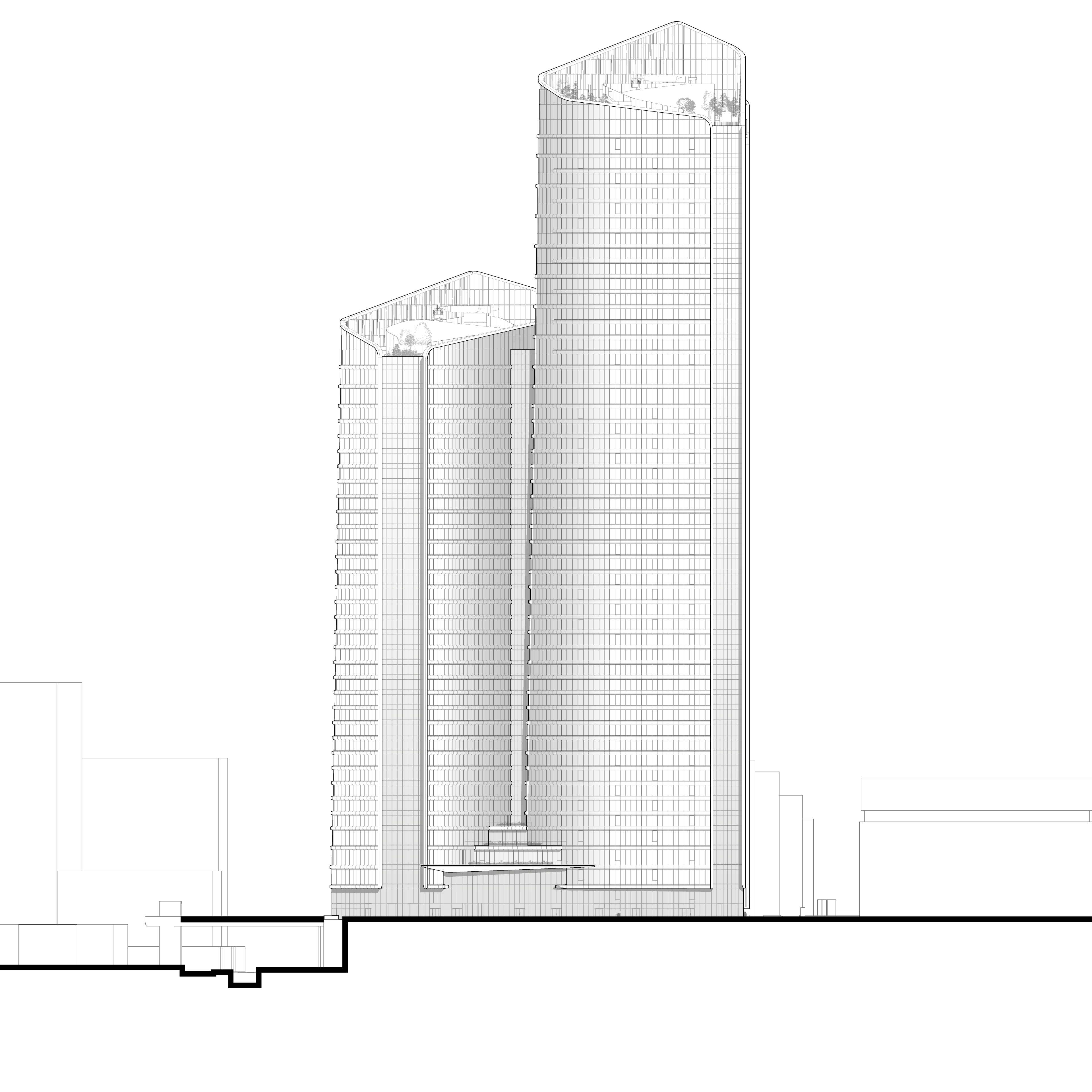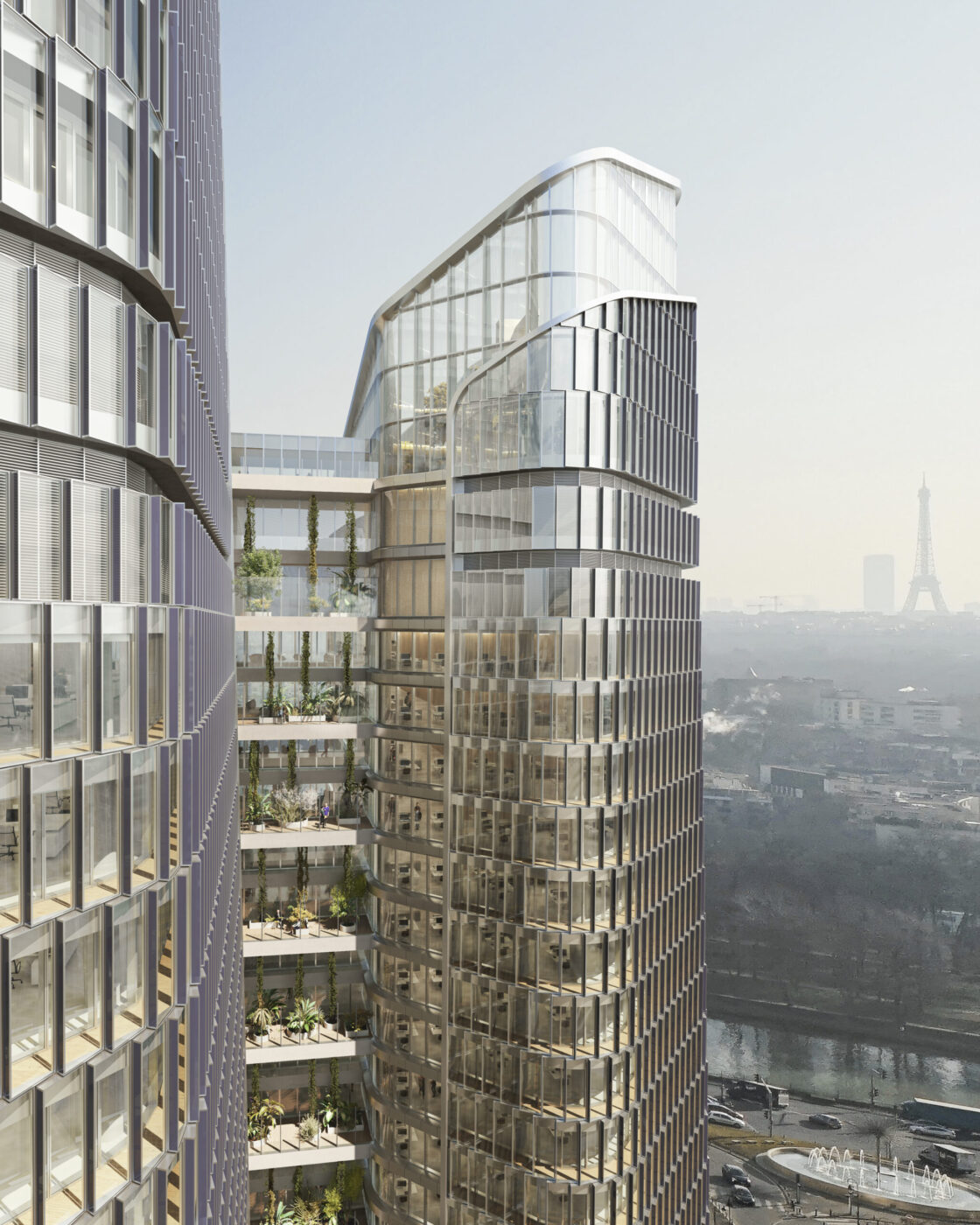 Les tours classiques sont condamnées par des limites intrinsèques, désormais rédhibitoires : verticalité, cloisonnement, minéralité, absence d’accès extérieur. PCA-STEAM a pris le parti de repenser les fondamentaux de la tour traditionnelle en inventant une nouvelle horizontalité répondant à un changement de paradigme dans l’organisation du travail. L’agence a imaginé une morphologie de tour innovante qui tire parti de la taille de la parcelle : la tour est dédoublée en deux ailes, reliées par trente liaisons, les « links ». Larges de plus de 8 m et dotés de jardins offrant des vues spectaculaires, ils sont pensés comme des points de rencontre qui deviendront autant de « places du village ». En reliant les deux bâtiments, ces links créeront des plateaux de 3 000 m2, surface inédite pour une tour de La Défense.