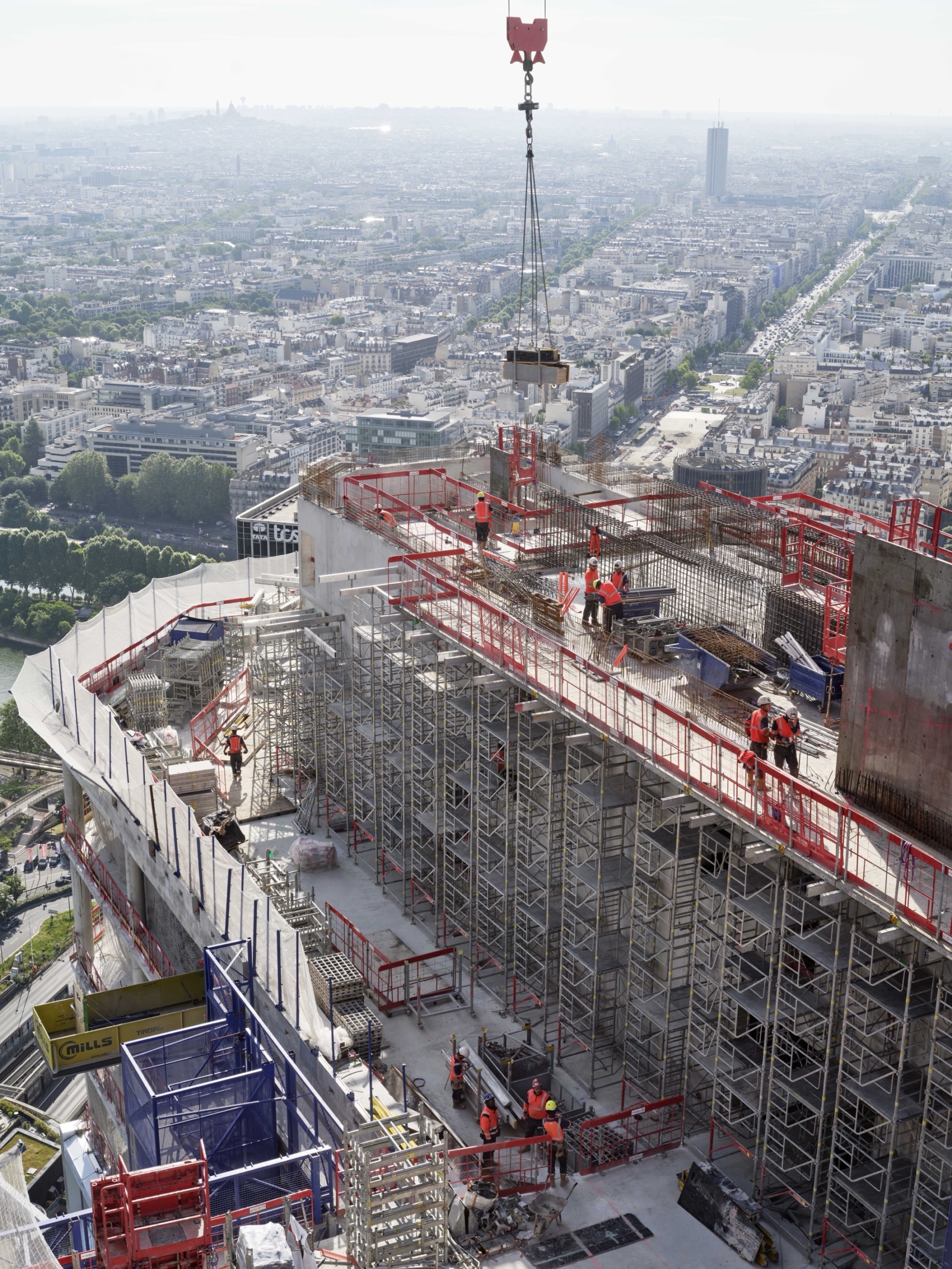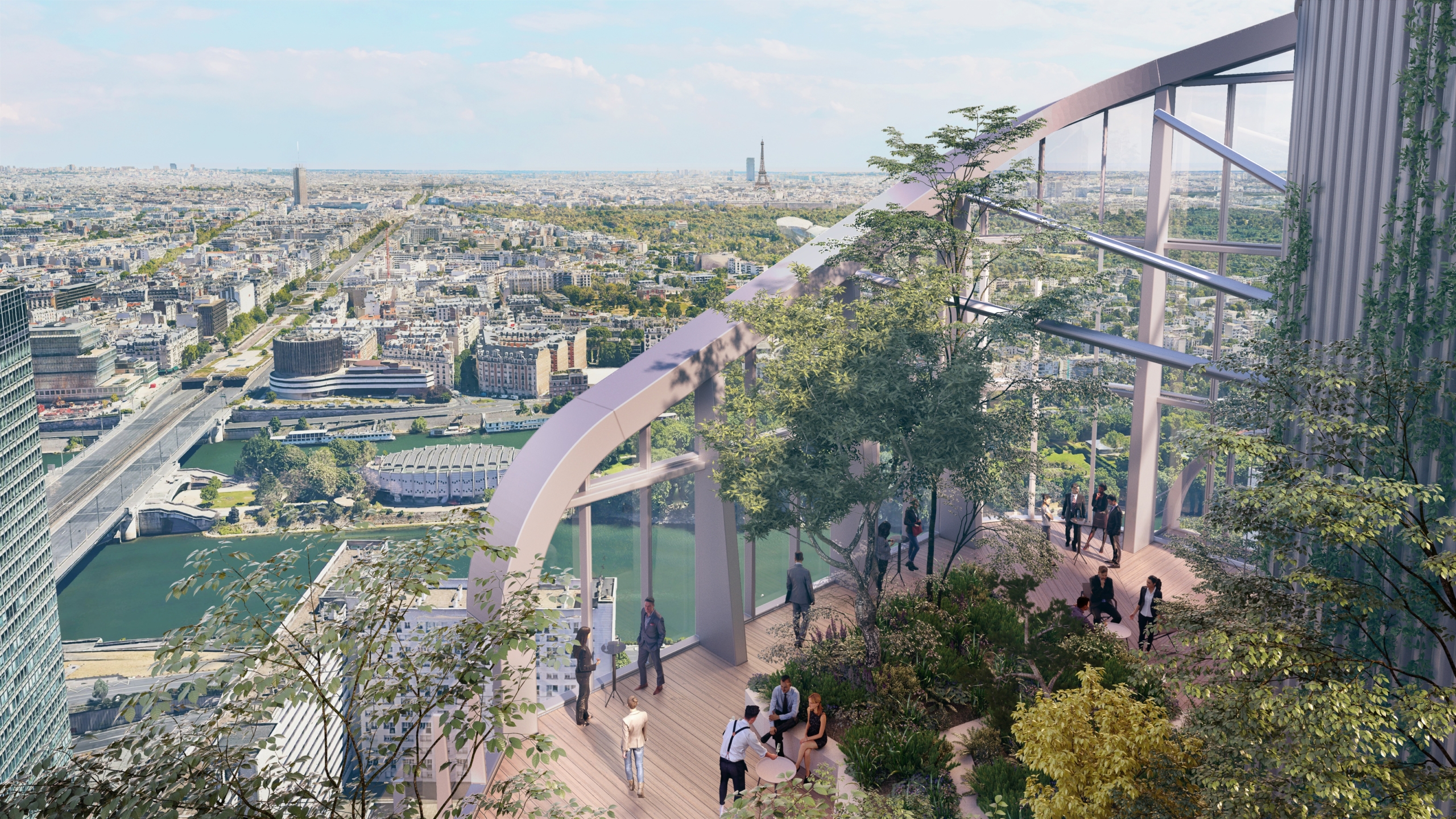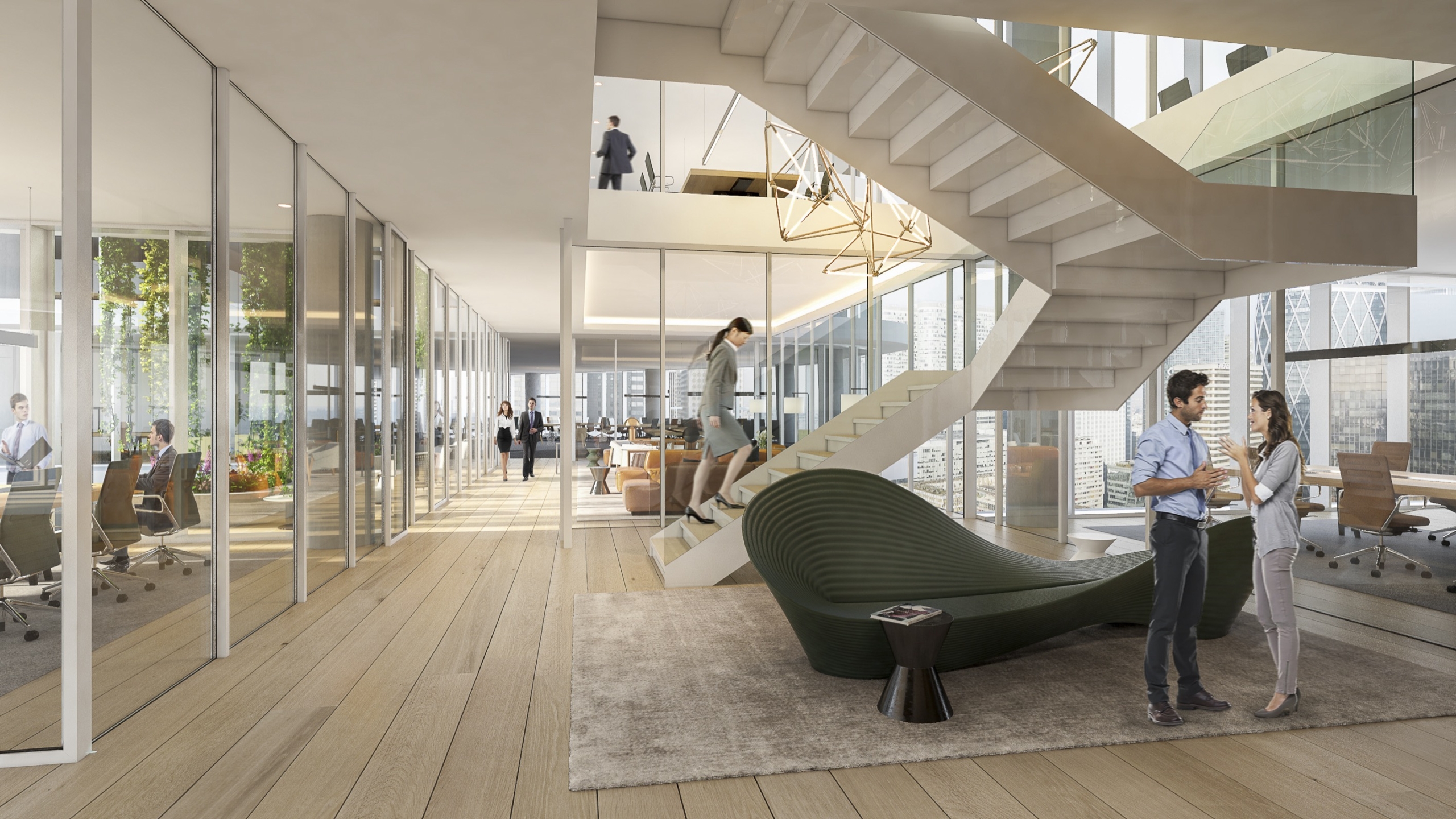 Tous les étages fonctionneront en duplex via de grands escaliers ouverts créant des unités de 6 000 m2 qui pourront accueillir 500 personnes, soit quatre fois plus qu’un étage de tour classique. Les déplacements au sein de chaque duplex se feront à pied, sans prendre l’ascenseur, de façon à multiplier les interactions et générer de la sérendipité. Les façades vitrées toute hauteur offrent une luminosité exceptionnelle sur tous les plateaux. Par ses caractéristiques de modularité et de flexibilité, The Link est capable de s’adapter aux différentes configurations souhaitées avec une simplicité inédite pour un projet de cette envergure : bureaux cloisonné, open space, espaces mixtes, flex office, salles de travail connectées, box, espaces d’isolement… The Link étant doté de 2 800 m2 d’espaces extérieurs, aucun salarié ne sera à plus de trente secondes d’un accès à l’air libre. Le jardin paysager en rooftop, à 154 m du sol, créera lui un nouveau belvédère spectaculaire sur Paris et l’axe historique.
