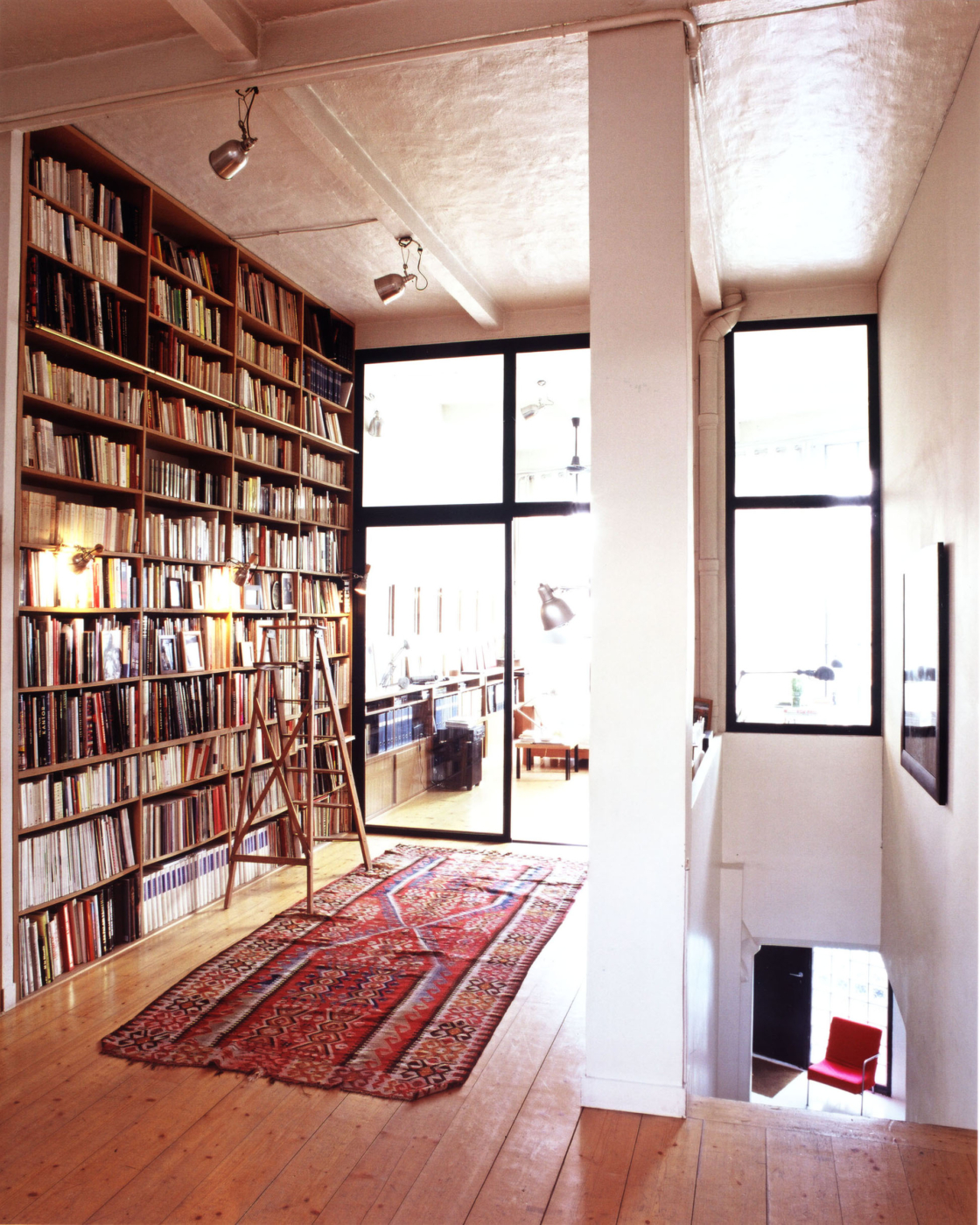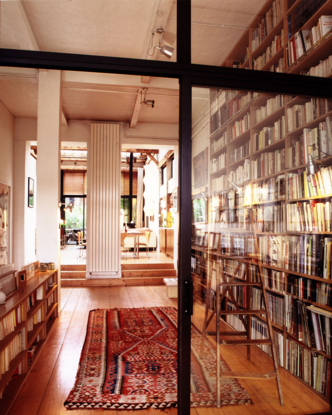 Abritant dans les années 1920 une usine d’emboutissage de fer-blanc, ce grand local de 400 m2 sur les hauteurs de Belleville avait ensuite mué en atelier de lithographie et galerie d’art. PCA-STREAM prend le parti de transformer l’ancien atelier en respectant son origine et son esprit pour l’adapter à de nouvelles fonctions de logement et de bureau. Au cœur du 20e arrondissement de Paris, il prend racine dans un quartier populaire dont il conserve les traces du passé industriel et artisanal. Clin d’œil à l’activité historique du lieu, les couronnes d’entraînement des machines, fixées sur les poutres du plafond, ont été conservées. Le loft s’étirant d’une rue à l’autre, avec une seule fenêtre en façade, le défi était de jouer sur cette longueur en travaillant l’apport en lumière naturelle au cœur de l’espace. La transparence est ainsi privilégiée, de façon à permettre au regard de traverser le bâtiment. L’agence a également choisi de préserver la remarquable structure en chêne et d’y répondre par des aménagements intérieurs lui faisant écho : bibliothèques, planchers ou persiennes.