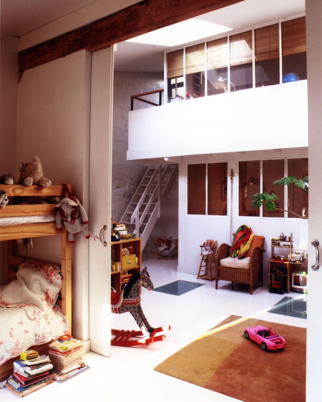 L’espace d’origine étant réparti en trois chais. PCA-STREAM les retravaille en séquences successives avec des cloisonnements conçus pour ne rien perdre de la perspective traversante. Un patio est implanté au cœur du projet pour apporter de la luminosité et articuler les espaces. Le premier accueille les pièces à vivre, celui du centre est redivisé en espaces intimes de chambres, tandis que le dernier est réservé aux activités professionnelles. La lumière entre généreusement via la verrière en toiture, complétée par la création d’impostes, de nouvelles fenêtres et d’une surélévation partielle. Des ouvertures sont ménagées sur le jardin japonais qui agrémente le patio. S’inspirant de l’architecture traditionnelle nippone, la succession des baies coulissantes vitrées, occultables par des stores en bois, permet d’alterner profondeur de l’espace et intimité. Le choix des matières – bois, inox, peinture blanche – ajoute de la chaleur et de la lumière à ce volume d’exception recomposé dans un esprit loft industriel.